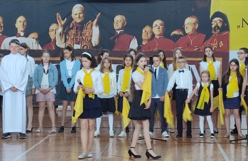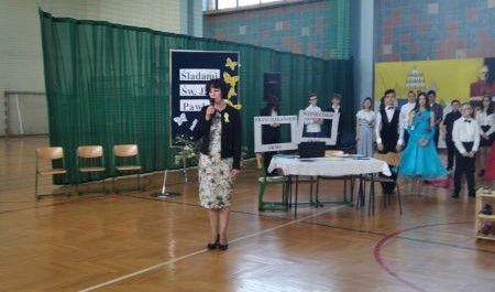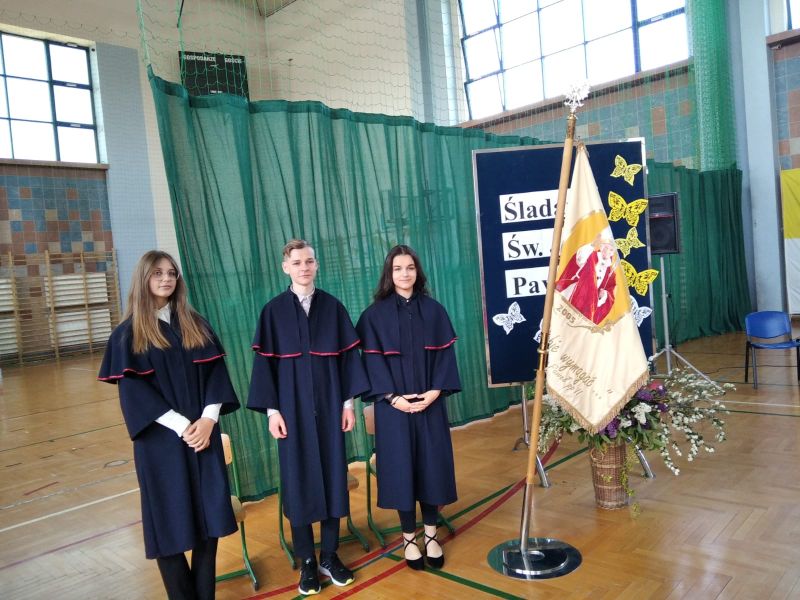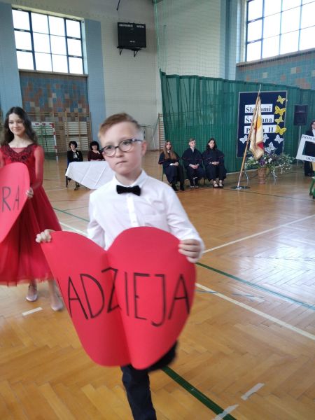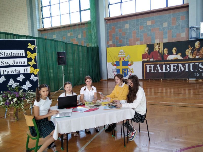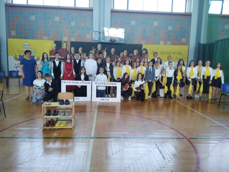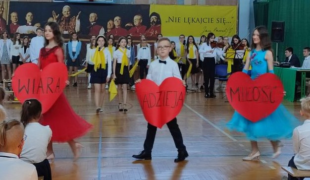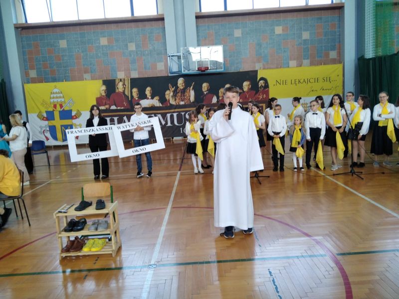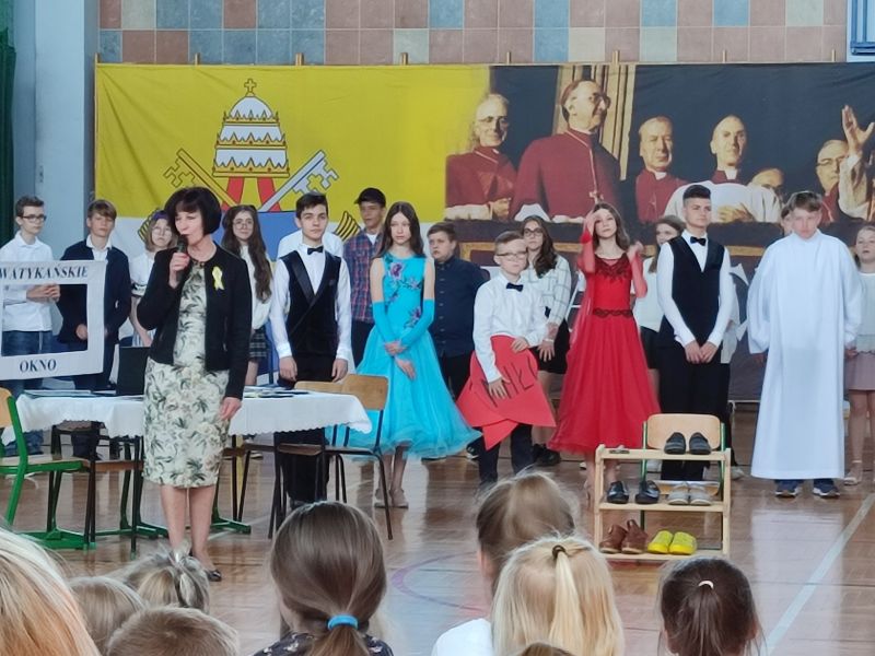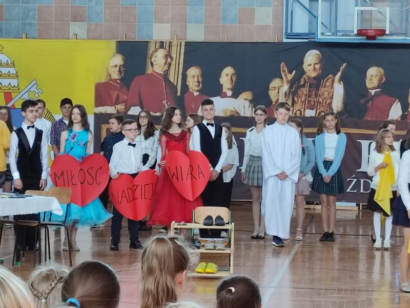 18 maja w dniu urodzin naszego Patrona odbyła się uroczysta akademia, w której uczestniczyła Społeczność naszej szkoły. Program artystyczny pt. „Buty, okna, kremówki” przygotowali i przedstawili uczniowie kl. VI d oraz zespół „Triolle”. Młodzi artyści przypomnieli Osobę św. Jana Pawła II z pozycji różnych przedmiotów: butów, okien i kremówek. Program akademii został wzbogacony występami tanecznymi naszych uczennic, które rozwijają swoje umiejętności w Szkole Tańca „Gala” w Mielcu.