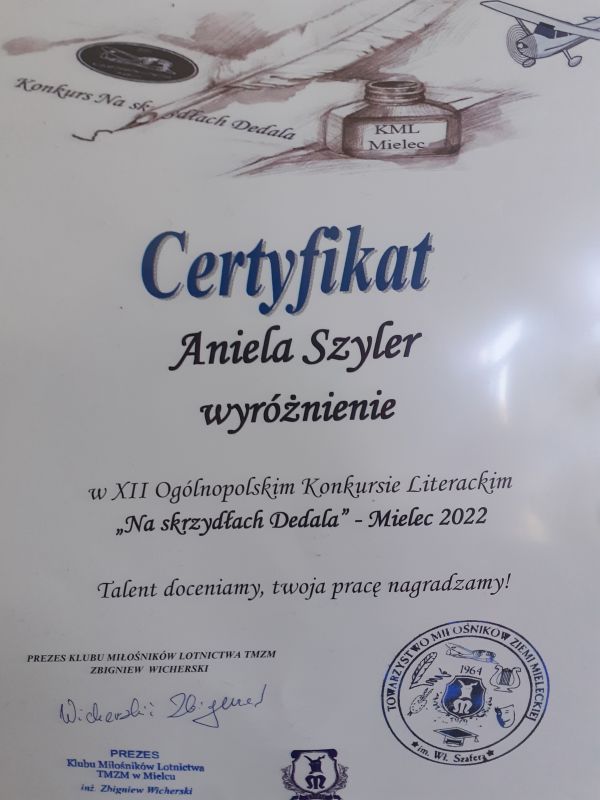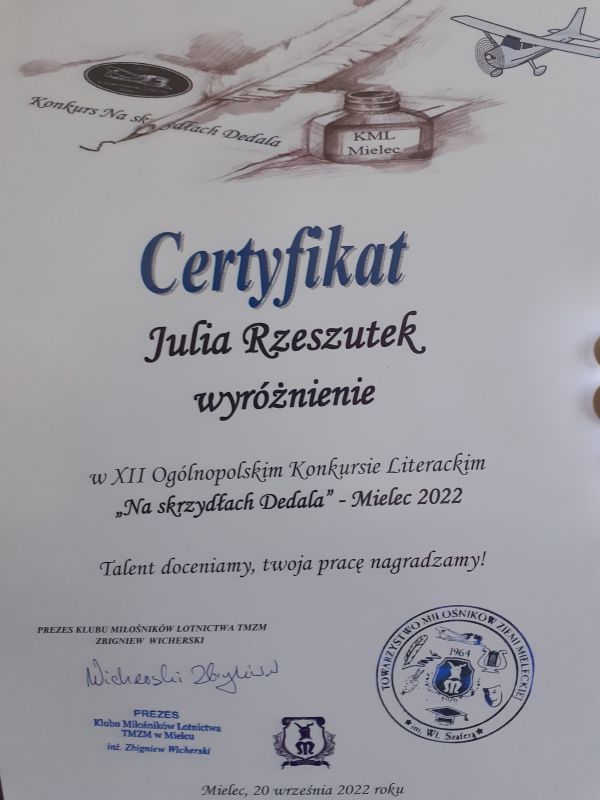 Uczennice klasy 6b SP nr 11 w Mielcu – Julia Rzeszutek oraz Aniela Szyler - wzięły udział w XII edycji Ogólnopolskiego Konkursu Literackiego "Na skrzydłach Dedala” - Mielec 2022. Organizatorem konkursu był Klub Miłośników Lotnictwa Towarzystwa Miłośników Ziemi Mieleckiej. Cel tego przedsięwzięcia to popularyzacja współczesnej literatury, pogłębienie wiedzy o historii polskiego lotnictwa, promowanie utalentowanych artystycznie młodzieży i osób dorosłych.