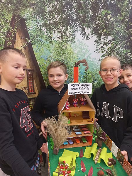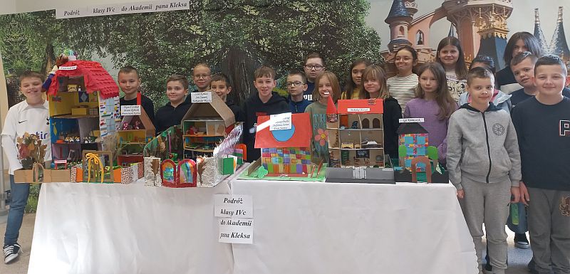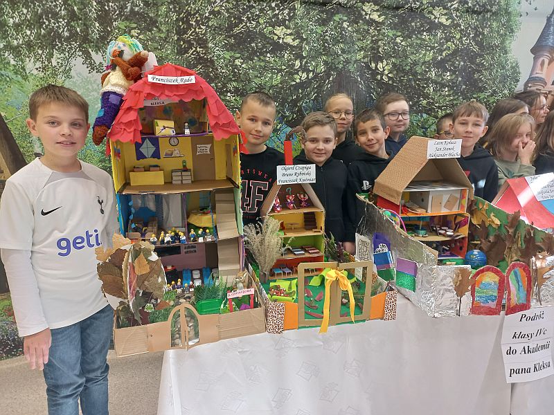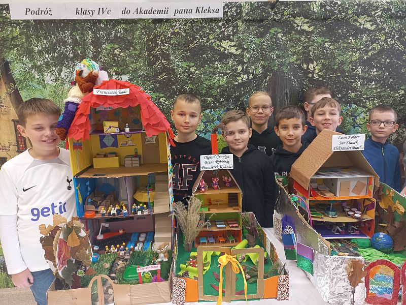 Uczniowie kl. 4c zainspirowani lekturą Jana Brzechwy „Akademia pana Kleksa”, stworzyli makiety przedstawiające szkołę, do której uczęszczał m.in. Adaś Niezgódka, a nauczycielem był niezwykły Ambroży Kleks. Prace powstały w ramach realizacji projektu zjęzyka polskiego. Klasa wykazała się ogromną wyobraźnią, kreatywnością i niezwykłymi umiejętnościami. Uczniowie pracowali indywidualnie lub w małych grupach. Także rodzice włączyli się w te działania, podsuwając pomysły lub pomagając w wykonaniu trudniejszych elementów. Prezentacja w klasach nastąpiła 12 listopada, a niezwykłe prace trafiły na wystawę „Podróż klasy 4c do Akademii pana Kleksa”, która znajduje się w sali, gdzie uczą się uczniowie.
