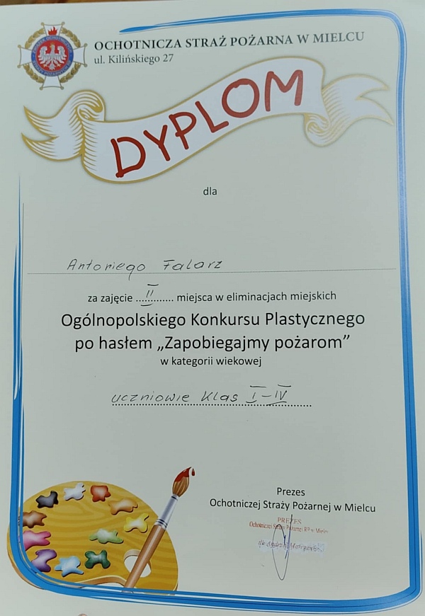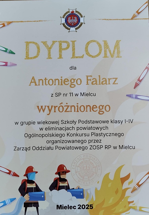Antonii Falarz uczeń klasy 3c po raz kolejny uczestniczył w konkursie plastycznym przedstawiając w swoich pracach trudną służbę strażaków. W tym roku konkurs odbywał się pod hasłem „Ziemia, Woda, Powietrze - strażacy na straży ochrony środowiska” . 11 marca 2025 roku odbyło się uroczyste spotkanie podsumowujące eliminacje powiatowe Ogólnopolskie Konkursu Plastycznego. W grupie wiekowej klas I – IV praca Antka została wyróżniona.