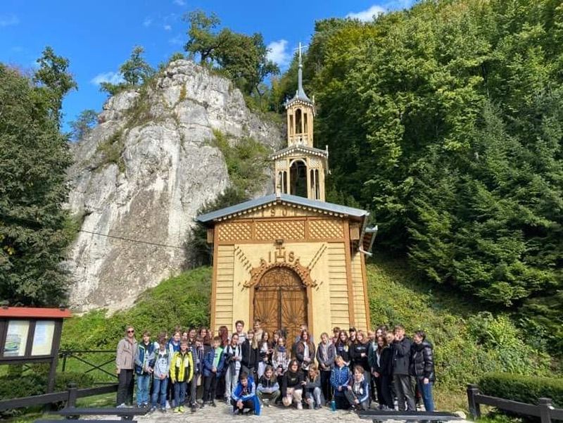 Następnie uczniowie przeszli szlakiem przez Wąskie Skałki do Bramy Krakowskiej. Po drodze uczniowie poznali genezę powstania skał wapiennych, z których zbudowana jest Wyżyna Krakowsko – Częstochowska oraz procesy, które nadały tym skałom wyjątkowe kształty. Niezapomnianym momentem była chwila westchnień przy tętniącym czystością „sercem” „Źródełka Miłości”. Następnie spacerując Doliną Prądnika, uczniowie podziwiali jesienny krajobraz. Wyjątkowym przeżyciem wycieczki była Kaplica „Na Wodzie”, położona u podnóży skał zwanych Prałatkami. Ten zabytkowy drewniany obiekt sakralny pod wezwaniem świętego Józefa Robotnika był dla uczniów miejscem refleksji i zadumy, a zarazem źródłem radości płynącej z cudów natury i otaczającego świata.
