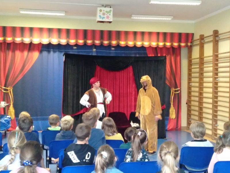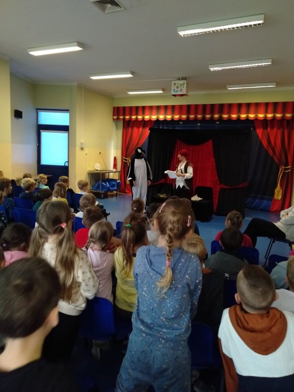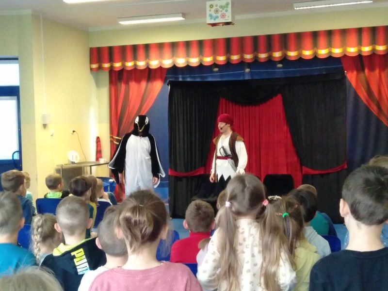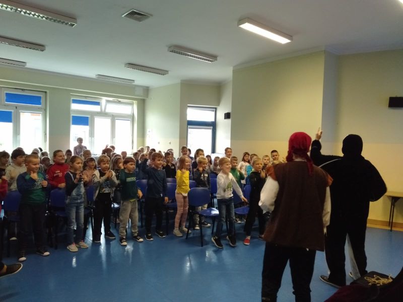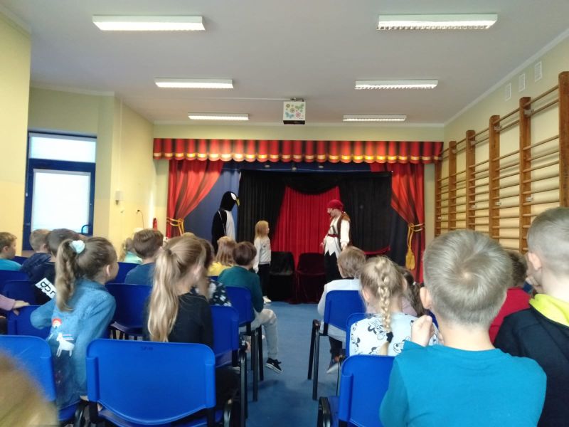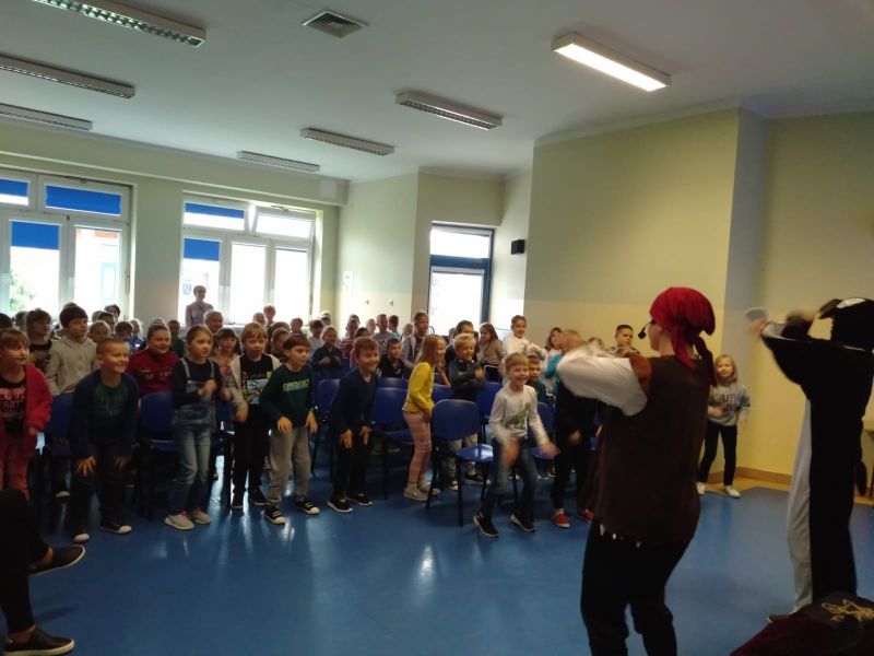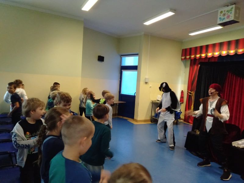 i bawili podczas interaktywnego spektaklu „Mapa skarbów”. Dzieci poznały historie chłopca, który polubił czytanie książek i dzięki temu uruchomił drzemiące w sobie pokłady wyobraźni, nauczył się, że dobro i chęć dzielenia się są lepsze od zła i chciwości. Spektakle profilaktyczne, które kształtują ważne wartości zostały zrealizowane w ramach Programu Wychowawczo- Profilaktycznego Szkoły.
