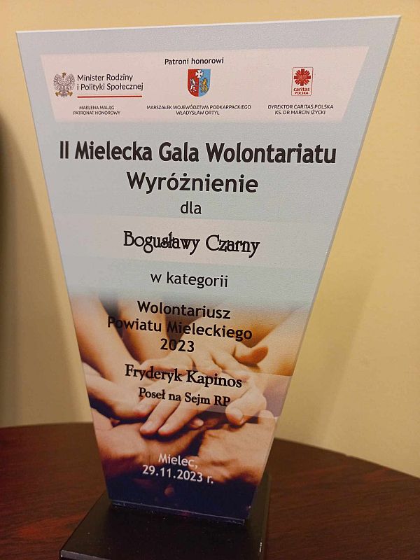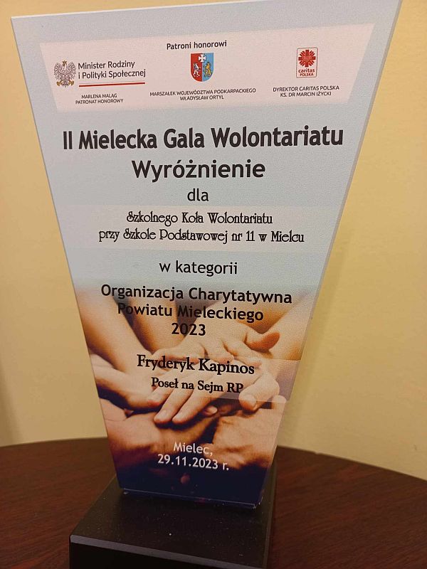 Podczas II Mieleckiej Gali Wolontariatu, której inicjatorem był Pan Poseł Fryderyk Kapinos Szkolne Koło Wolontariatu „POMOCNA 11”, której opiekunem jest pani Jadwiga Mleczko, otrzymało wyróżnienie w Kategorii Organizacja Charytatywna Powiatu Mieleckiego. Z tej okazji zostały wręczone również honorowe odznaczenia „Misericors” czyli „Miłosierny sercem” za niesienie pomocy najbardziej potrzebującym. Wśród wyróżnionych znalazła się pani dyrektor naszej szkoły – mgr Bogusława Czarny. Dziękujemy wszystkim szkolnym wolontariuszom oraz całej społeczności szkolnej, która zawsze chętnie włącza się w każda akcję charytatywną przeprowadzaną w naszej szkole.