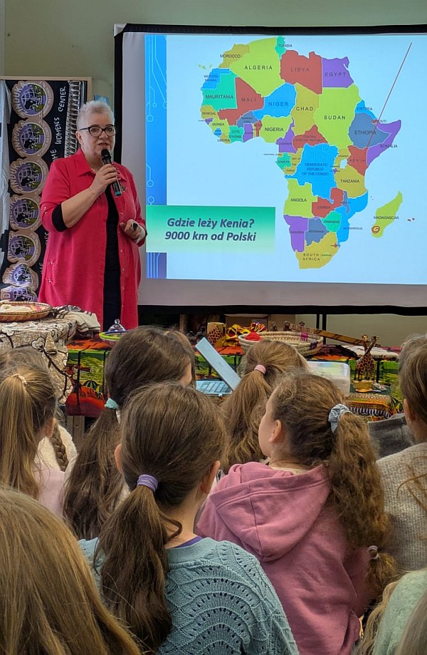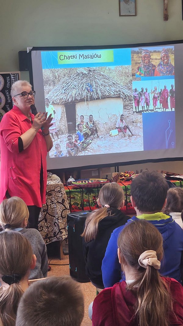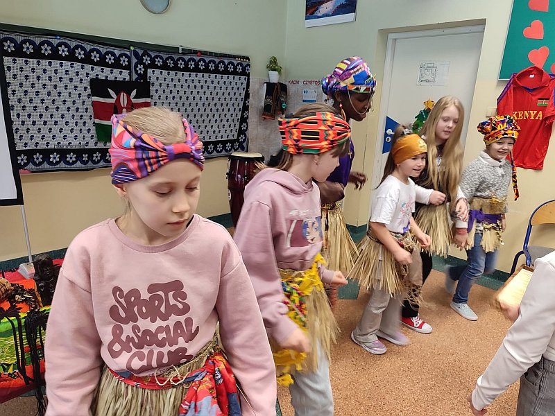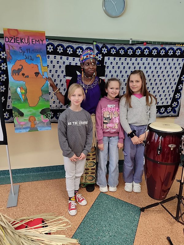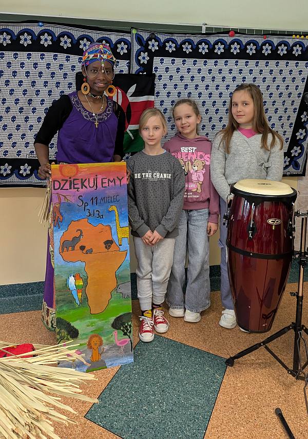 22 stycznia klasy 3a, 3b i 3d brały udział w zajęciach edukacyjnych, które prowadzili Jolanta i Wiesław Piekarscy oraz pochodząca z Kenii Mary Kanini. Dzieci poznały życie codzienne, kulturę, muzykę i tradycje afrykańskiego kraju – Kenii. Obejrzały wiele afrykańskich pamiątek, nauczyły się kilku słów w języku suahili, zaśpiewały piosenkę ”Hakuna Matata”. Warsztaty były bardzo ciekawe i interesujące!