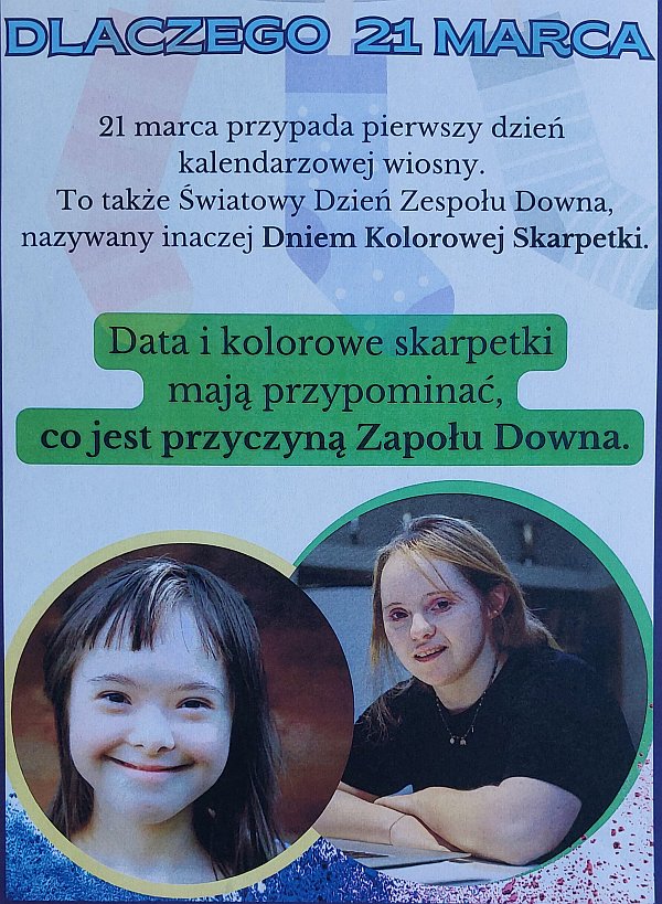 21 marca na całym świecie obchodzony jest Dzień Zespołu Downa. Nasza szkoła włącza się do tej akcji na znak solidarności z osobami z Zespołem Downa. W piątek (20 marca) załóż dwie różne skarpetki.