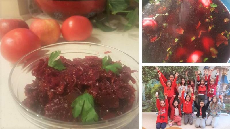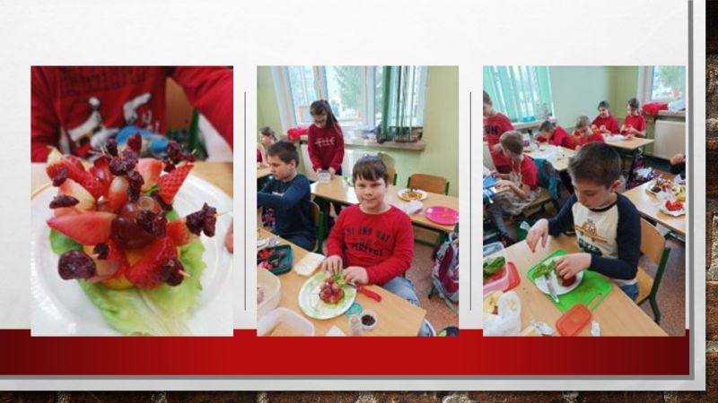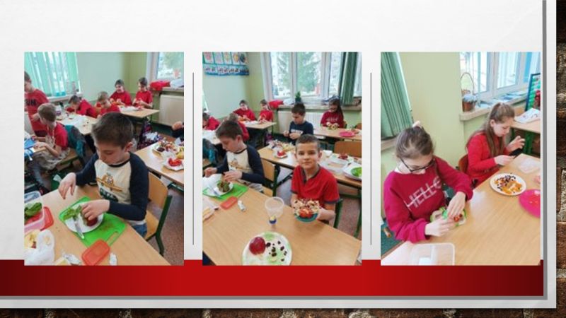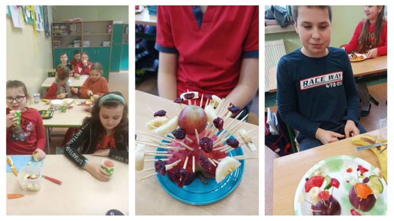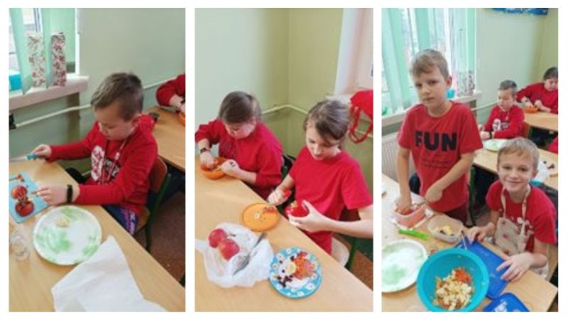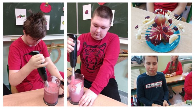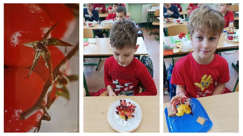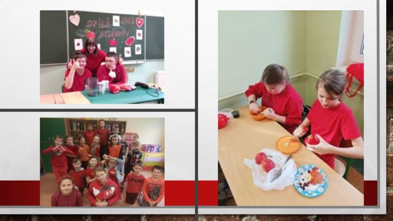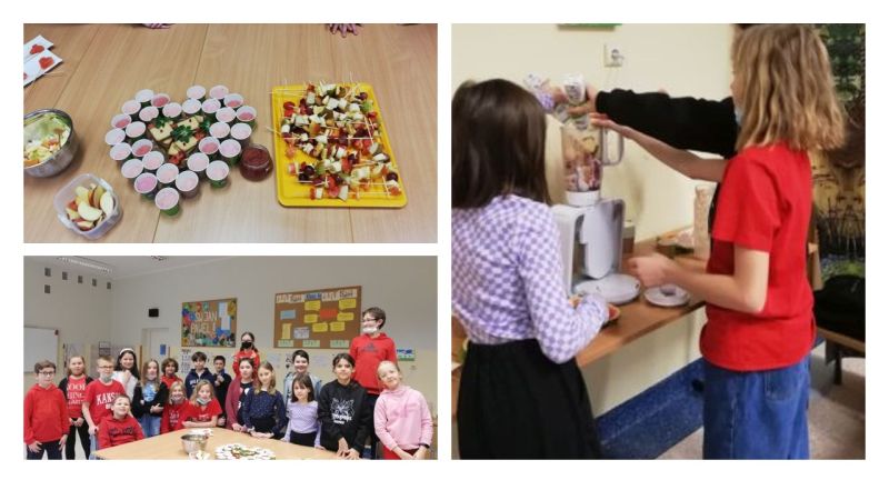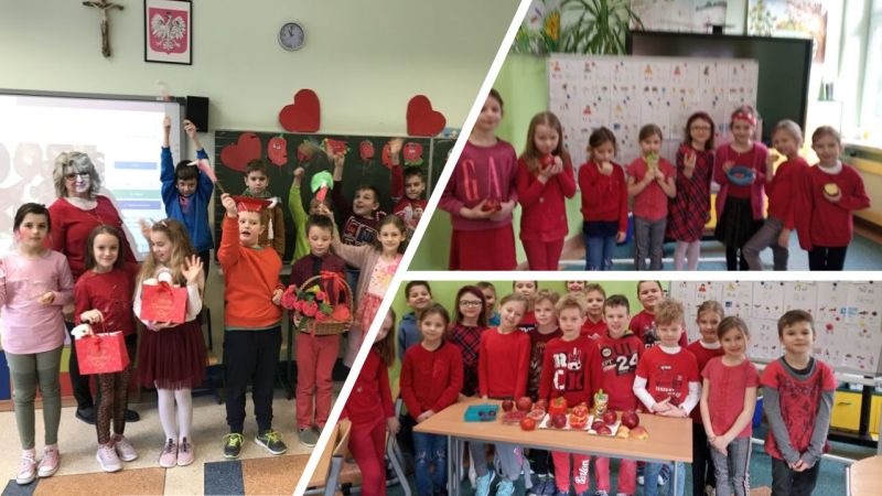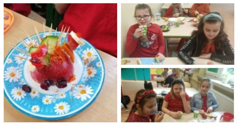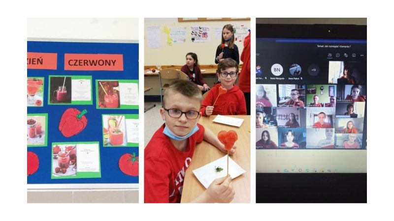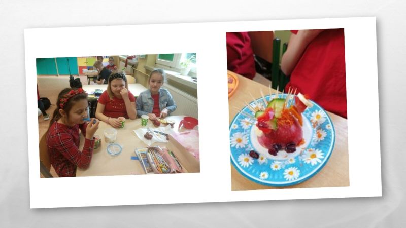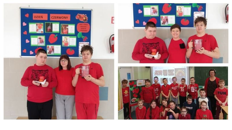 Tegoroczny czerwony dzień upłynął pod hasłem zdrowych owocowo-warzywnych potraw w kolorze czerwonym przygotowanych samodzielnie podczas zajęć przez uczniów klas młodszych i starszych. Uczniowie klas 1-3 obejrzeli filmiki promujące zdrowe odżywianie, wysłuchali pogadanki o właściwościach czerwonych owoców i warzyw, następnie wykonali soki, jogurty, kanapki i owocowo-warzywne szaszłyki oraz śmieszne jeżyki. Uczniowie starszych klas na zajęciach zdalnych przypomnieli i omówili zasady zdrowego odżywiania, samodzielnie przygotowali ciekawe potrawy, które pomysłowo udekorowali nawiązując do „Walentynek” i na końcu wykonali zdjęcia. Wszyscy wykorzystali swoje oryginalne pomysły i wspólnie degustowali przygotowane dania. Zajęcia promowały zdrowy styl życia i odżywiania, oraz zachęcały do częstego zjadania czerwonych owoców i warzyw. Kilka porcji owoców i warzyw dziennie daje każdemu zdrowie i dobre samopoczucie.