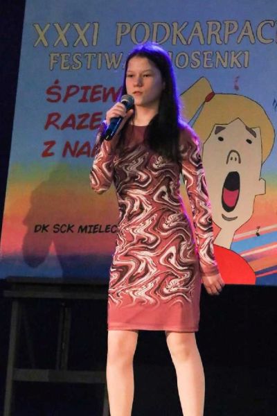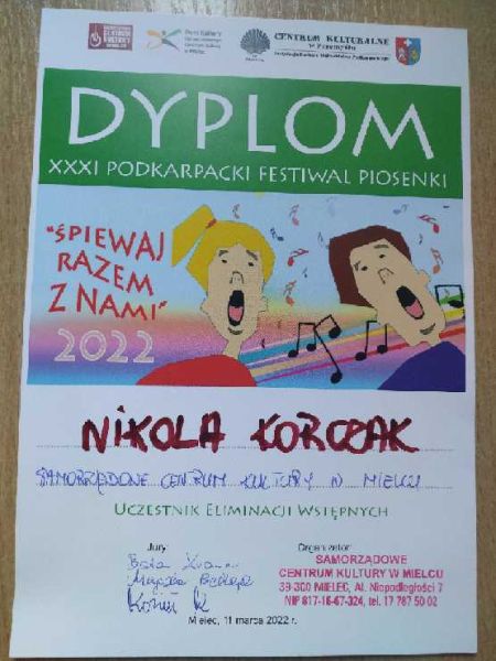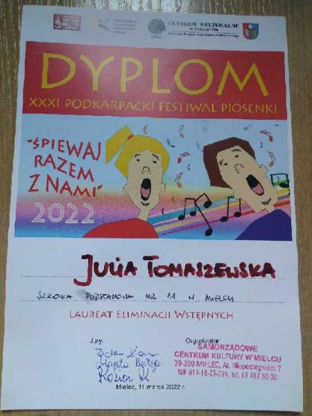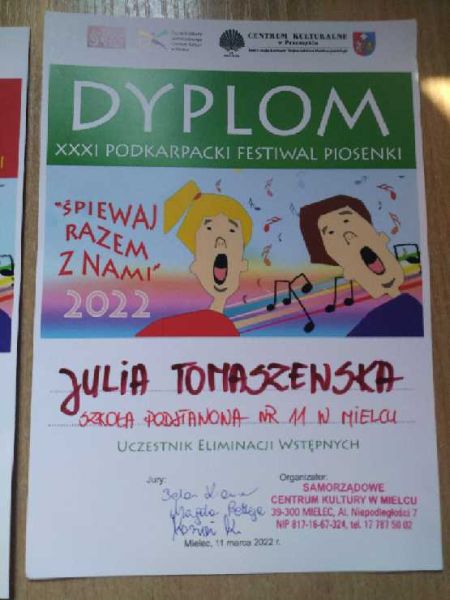 W dniu 11 marca 2022r. w Samorządowym Centrum Kultury w Mielcu odbyły się eliminacje wstępne do XXXI Podkarpackiego Festiwalu Piosenki "Śpiewaj razem z nami". Miło nam poinformaować, że dwie uczennice naszej szkoły, Julia Tomaszewska (klasa 4c) i Nikola Korczak (klasa 4d) wzięły w nich udział i z wielkim zaangażowaniem zaprezentowały jury przygotowane piosenki. Dziewczynki występowały w kategorii II (soliści 10-12 lat), w której swoje umiejętności wokalne prezentowało 24 uczestników. Decyzją jury Julia Tomaszewska ( klasa 4c) zakwalifikowała się do konkursu finałowego, który odbędzie się 1 kwietnia w Centrum Kulturalnym w Przemyślu. Gratulujemy naszym uczennicom wspaniałych występów !!!