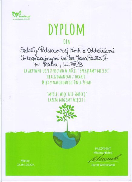 We wtorek 12 kwietnia Szkoła Podstawowa nr 11 przystąpiła do akcji „Sprzątanie Mielca”, która jest częścią Międzynarodowego Dnia Ziemi. W tym dniu klasa 8b wraz z wychowawcą brała czynny udział w tej inicjatywie. Uczestnicy otrzymali rękawiczki ochronne oraz worki na odpady. Klasa pracowała w uzgodnionym z Wydziałem Ochrony Środowiska i Gospodarki Odpadami Urzędu Miejskiego rejonie czyli w obrębie przyległym do SP 11 i ul. Powstańców Warszawy. Zebrano wiele worków śmieci odpowiednio posegregowanych. Finał akcji miał miejsce 23 kwietnia w Parku Oborskich gdzie odbył się Piknik Ekologiczny na którym Prezydent Miasta Mielca podsumował projekt i wręczył dyplomy. Każdy uczestnik akcji otrzymał sadzonkę.