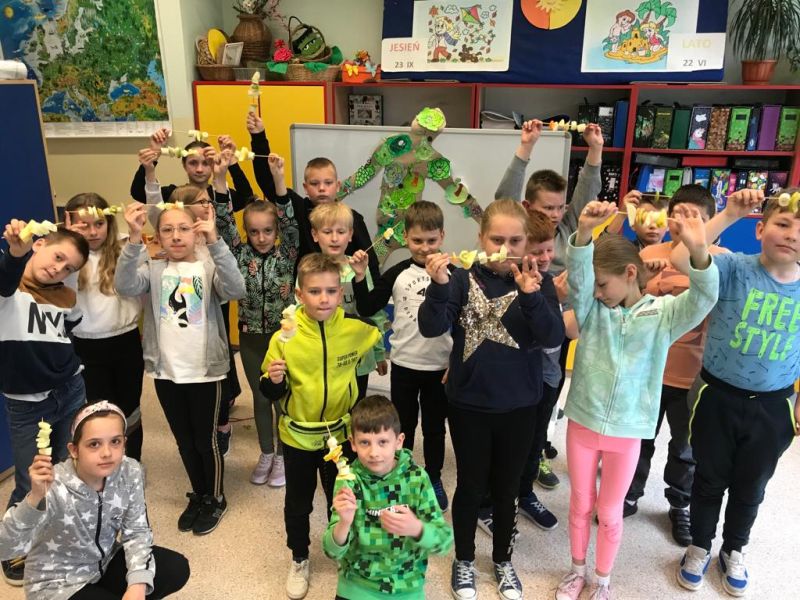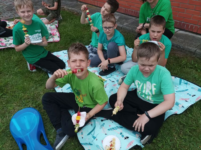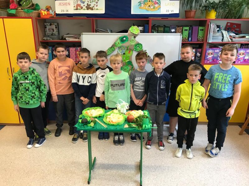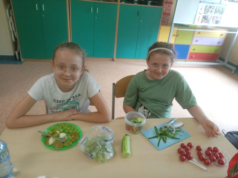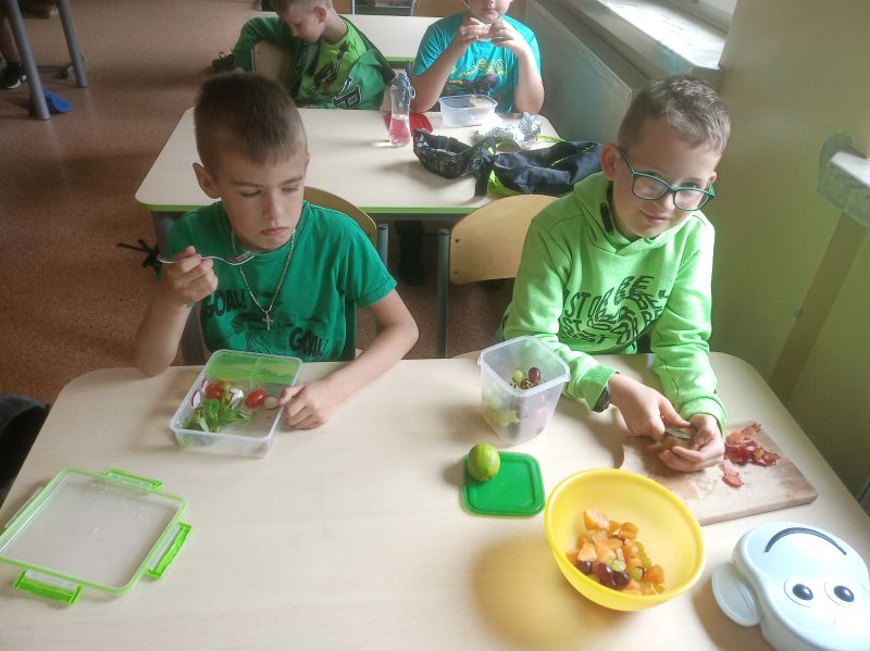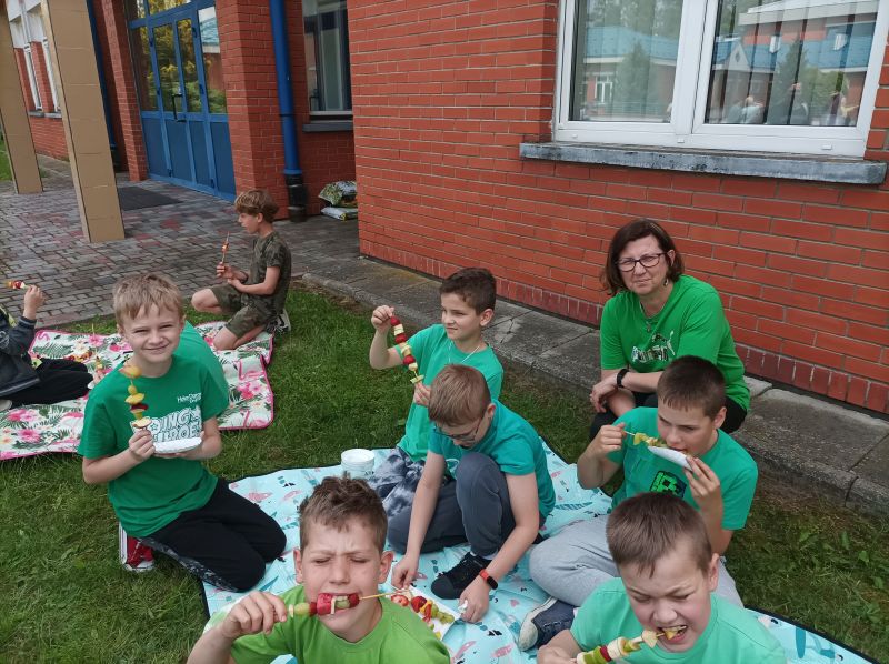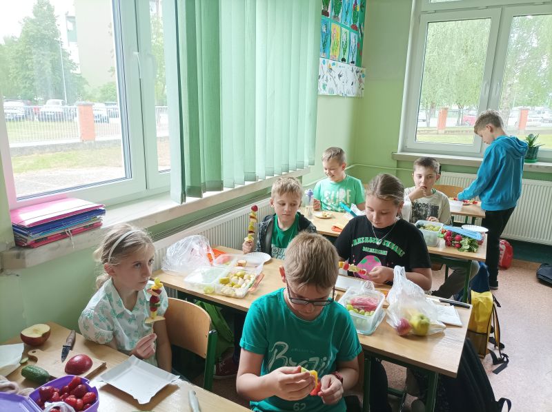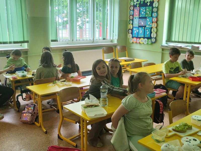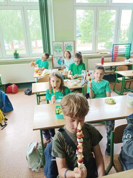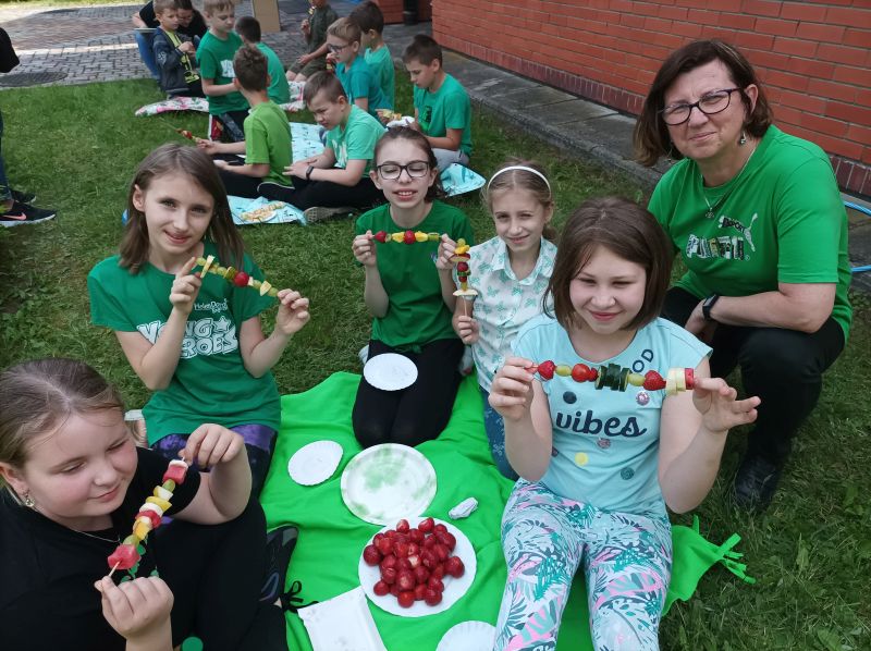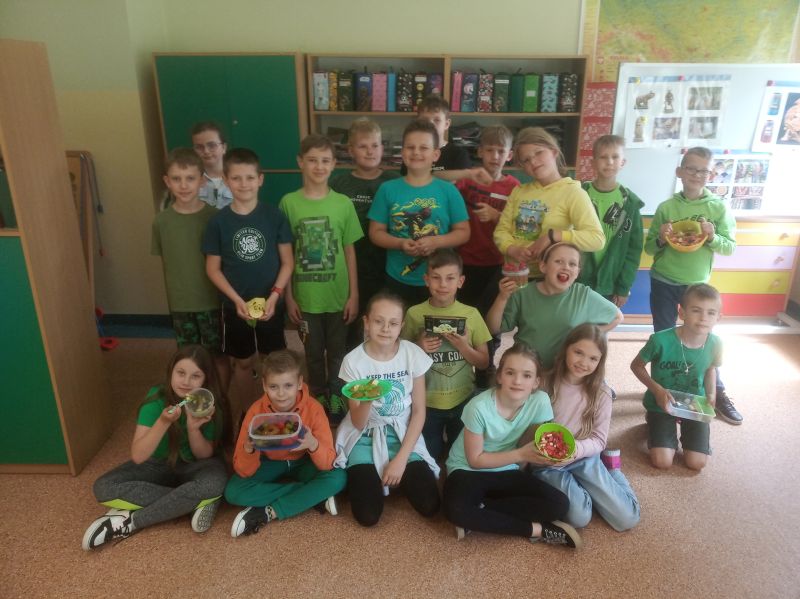 Zielone dni w klasach młodszych promowały zdrowy styl życia i zdrowe odżywianie. W Dniu Dziecka uczniowie klas młodszych przygotowali samodzielnie owocowo- warzywne kanapki, szaszłyki wykorzystując warzywa i owoce w kolorze zielonym i nie tylko. Przyszli ubrani w zielone koszulki, na wybranych lekcjach wyszli na klasowy piknik wokół szkoły. W tym dniu odbyły się także zajęcia ruchowe na świeżym powietrzu. W klasach pierwszych i drugich p.dietetyk Ewelina Jamróz prowadziła zajęcia edukacyjne dotyczące piramidy żywieniowej oraz komponowania zdrowego pierwszego i drugiego śniadania. Na zajęciach sportowych w wybranych klasach uczniowie ćwiczyli na torze przeszkód, który przygotowała p. Alicja Kwaśnik oraz p. Beata Kramek. W dniu 2 czerwca wszystkie klasy uczestniczyły w ciekawym pokazie pierwszej pomocy prowadzonym przez strażaków z OSP w Jaślanach p. komendanta Marka Czerwa i p. Łukasza Stalę. Uczniowie mieli okazję ćwiczyć pierwszą pomoc na specjalnym fantomie, a także uczyli się zasad postępowania przy omdleniu, zakrztuszeniu. Wszyscy uważnie obserwowali postępowanie w sytuacjach zagrażających życiu człowieka.