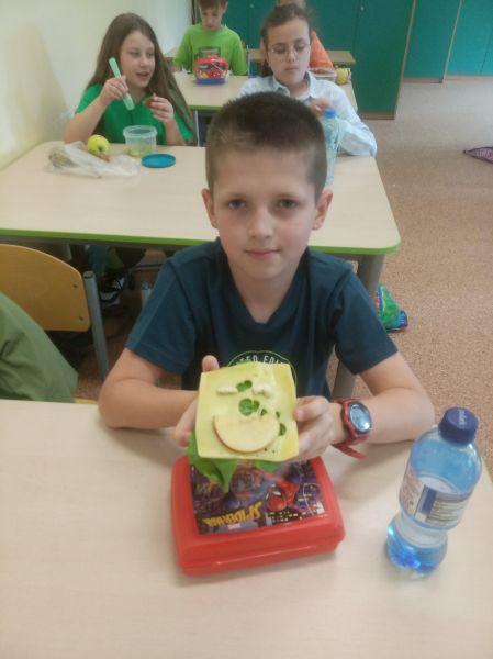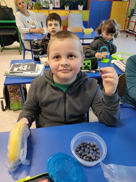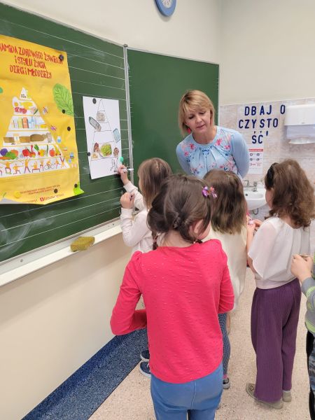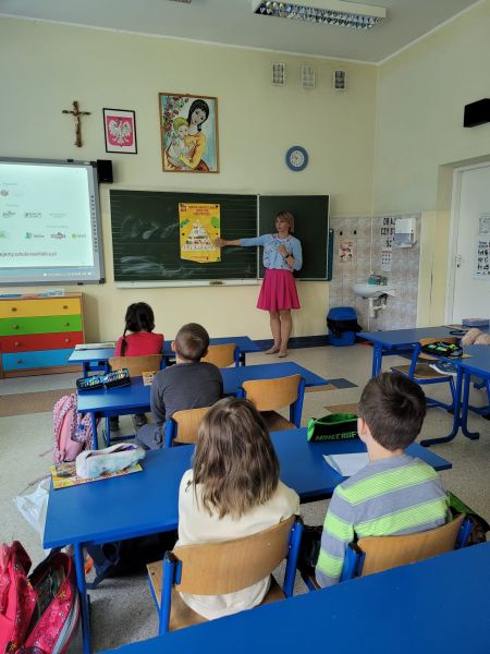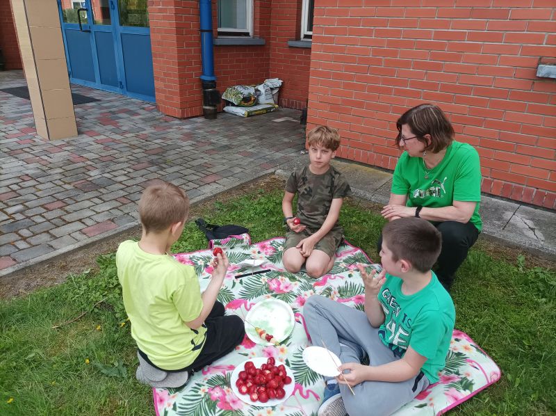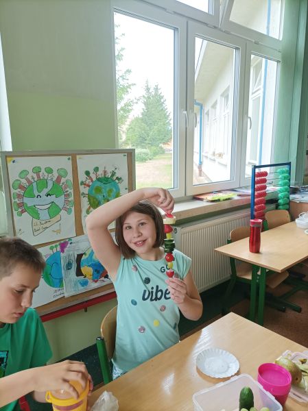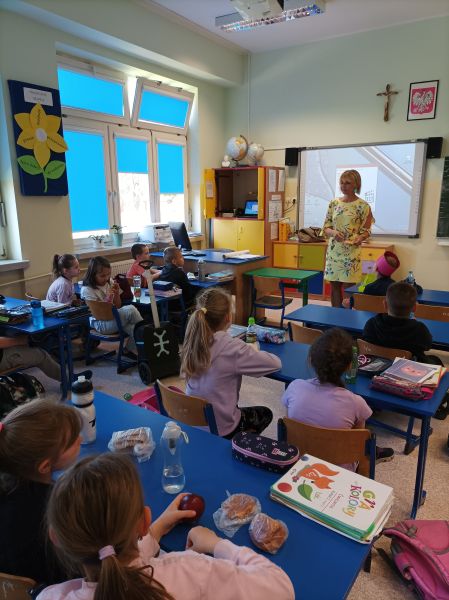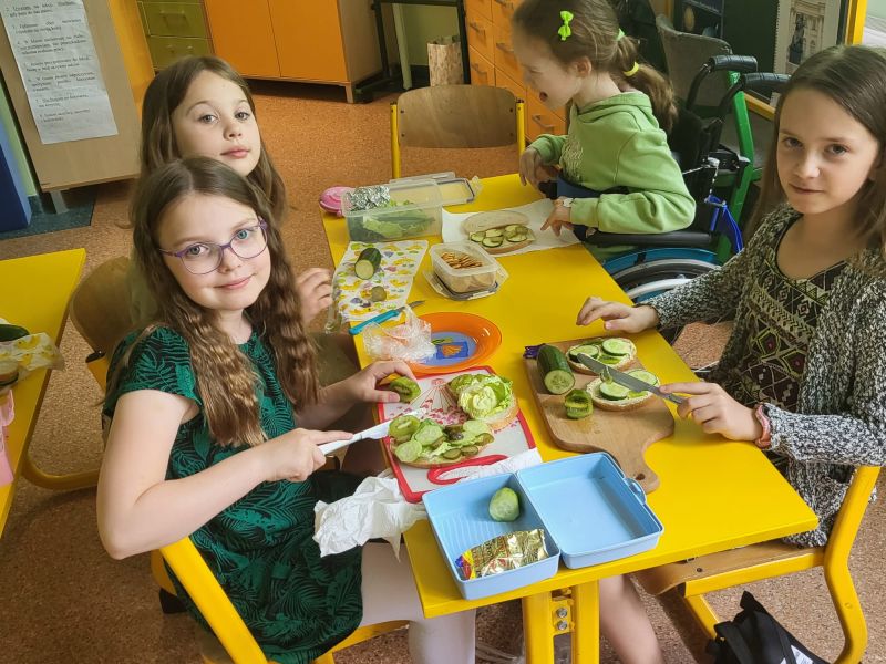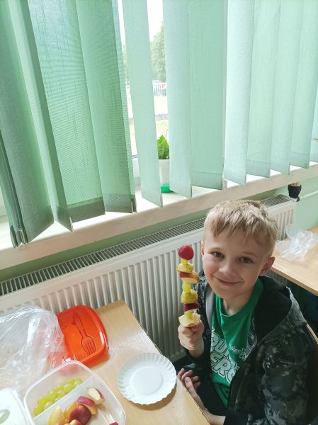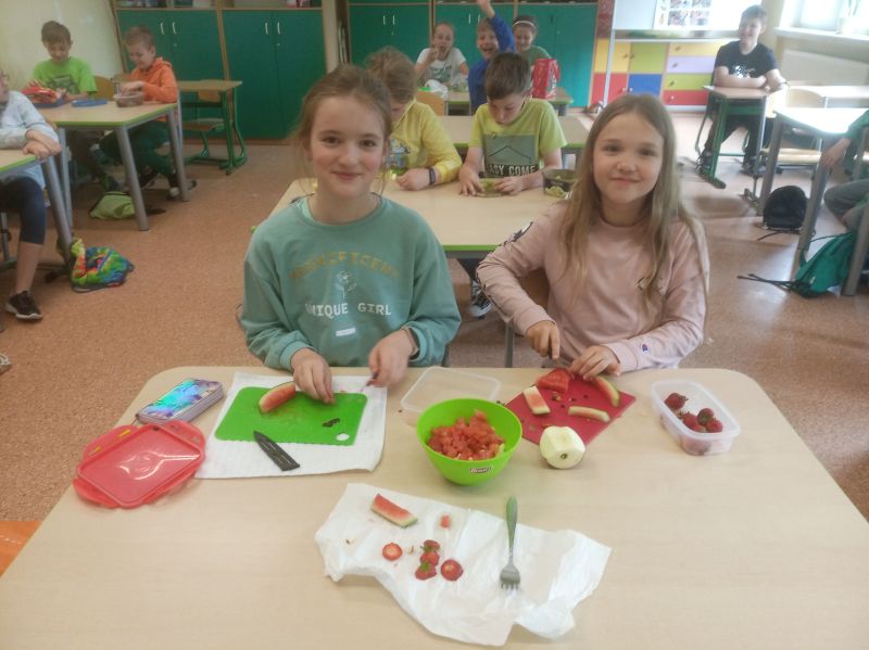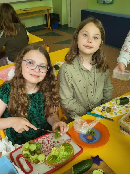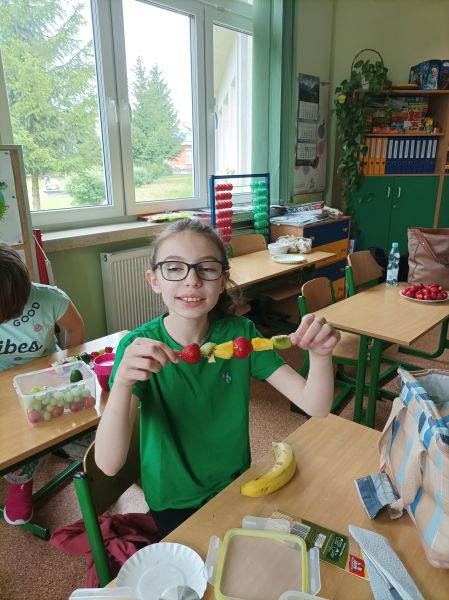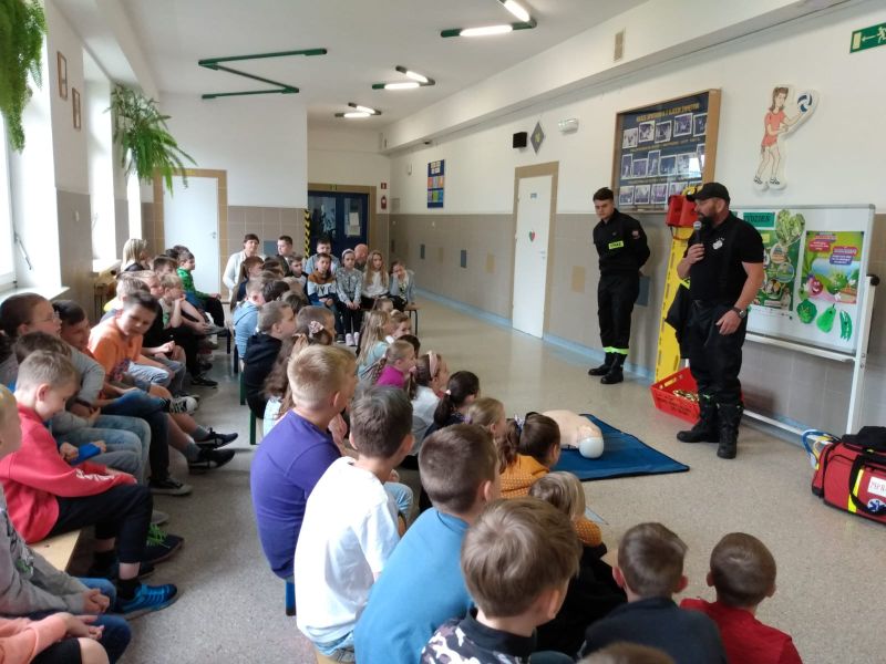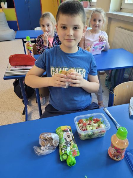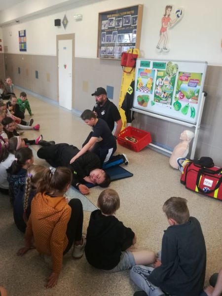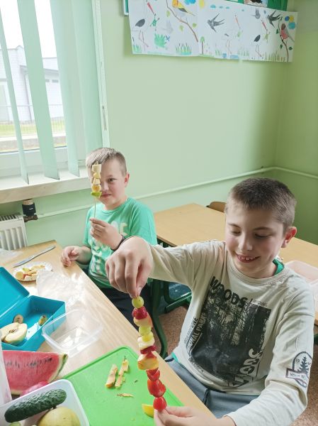Zielone dni w klasach młodszych promowały zdrowy styl życia i zdrowe odżywianie. W Dniu Dziecka uczniowie klas młodszych przygotowali samodzielnie owocowo- warzywne kanapki, szaszłyki wykorzystując warzywa i owoce w kolorze zielonym i nie tylko. Przyszli ubrani w zielone koszulki, na wybranych lekcjach wyszli na klasowy piknik wokół szkoły. W tym dniu odbyły się także zajęcia ruchowe na świeżym powietrzu. W klasach pierwszych i drugich p.dietetyk Ewelina Jamróz prowadziła zajęcia edukacyjne dotyczące piramidy żywieniowej oraz komponowania zdrowego pierwszego i drugiego śniadania. Na zajęciach sportowych w wybranych klasach uczniowie ćwiczyli na torze przeszkód, który przygotowała p. Alicja Kwaśnik oraz p. Beata Kramek. W dniu 2 czerwca wszystkie klasy uczestniczyły w ciekawym pokazie pierwszej pomocy prowadzonym przez strażaków z OSP w Jaślanach p. komendanta Marka Czerwa i p. Łukasza Stalę. Uczniowie mieli okazję ćwiczyć pierwszą pomoc na specjalnym fantomie, a także uczyli się zasad postępowania przy omdleniu, zakrztuszeniu. Wszyscy uważnie obserwowali postępowanie w sytuacjach zagrażających życiu człowieka.