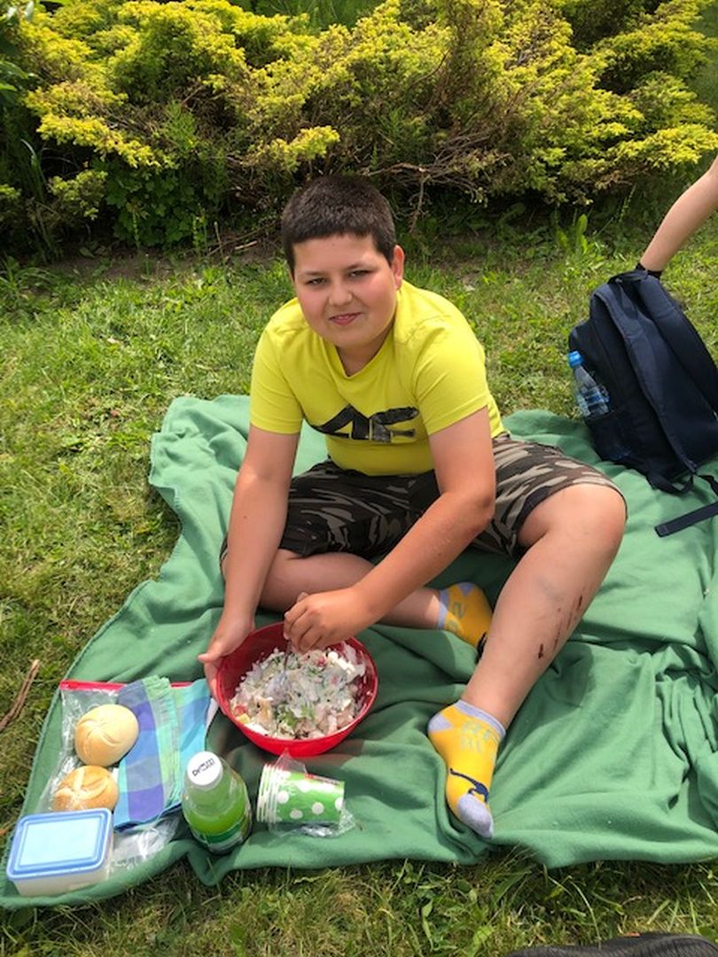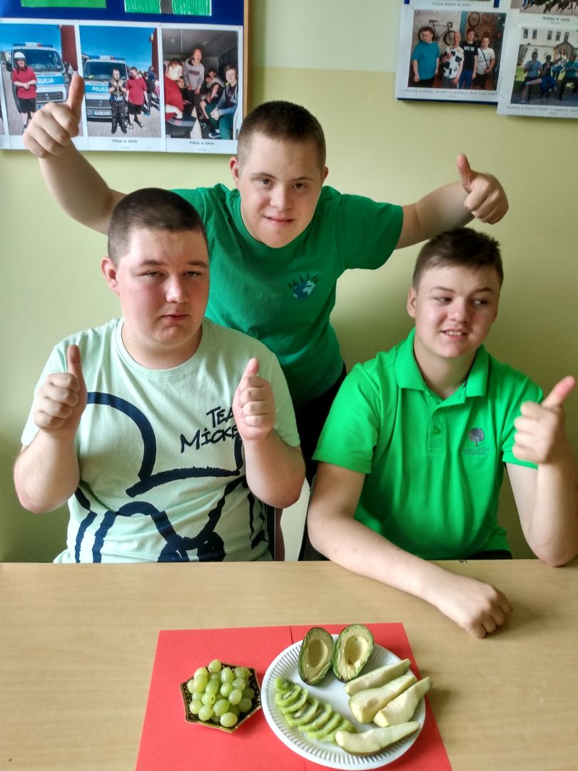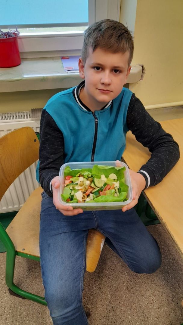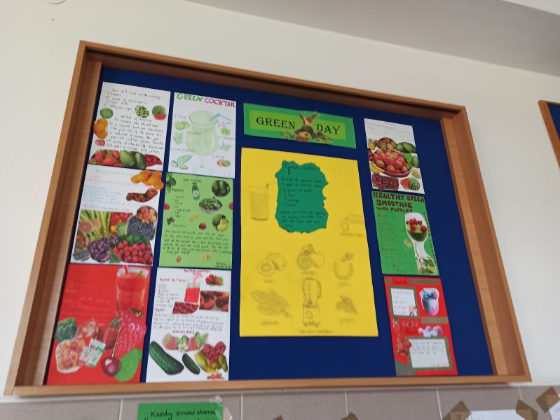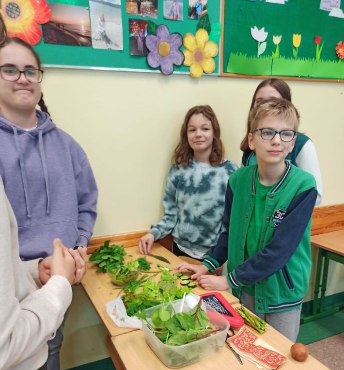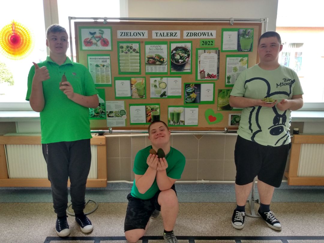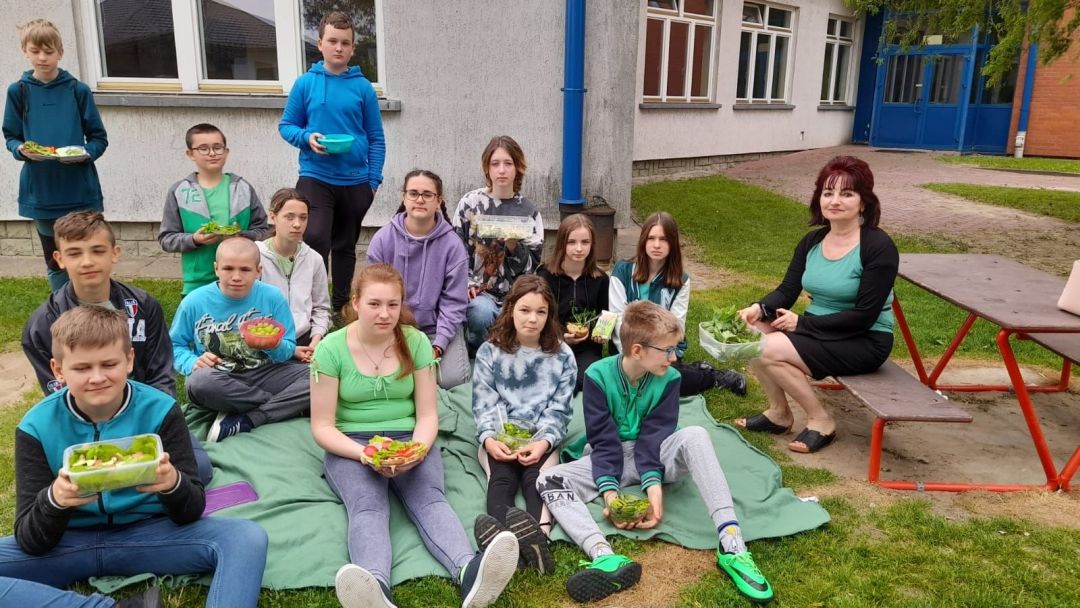 W środę był zielony dzień w szkole. Uczniowie przyszli ubrani w zielone koszulki oraz przynieśli owoce i warzywa czerwono-zielone , robili sałatki, szaszłyki i ozdobne koktajle. Wyszli na trawę wraz z wychowawcami, aby zjeść przygotowane potrawy. Dzieci oglądały prezentację ,,Gram w czerwono-zielone” na zajęciach informatyki, na zajęciach w-f-u brały udział w ,,Czerwono-zielonym torze przeszkód”. Uczniowie aktywnie uczestniczyli w różnych atrakcyjnych formach zajęć zapoznając się i utrwalając sobie zasady zdrowego stylu życia. Wyniki konkursu w kategorii Wiersz: o tematyce: ,, Czerwono-zielone owoce i warzywa”