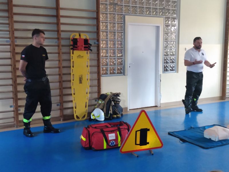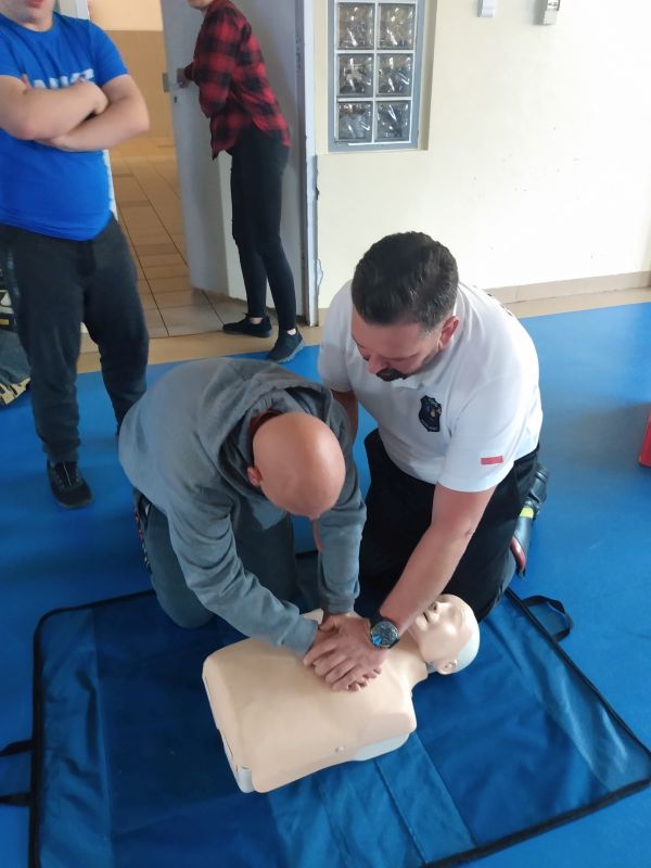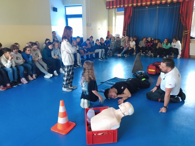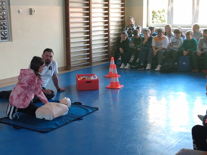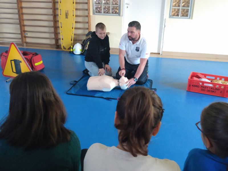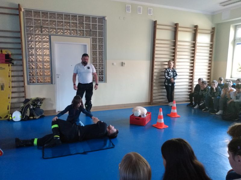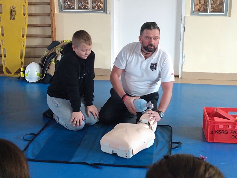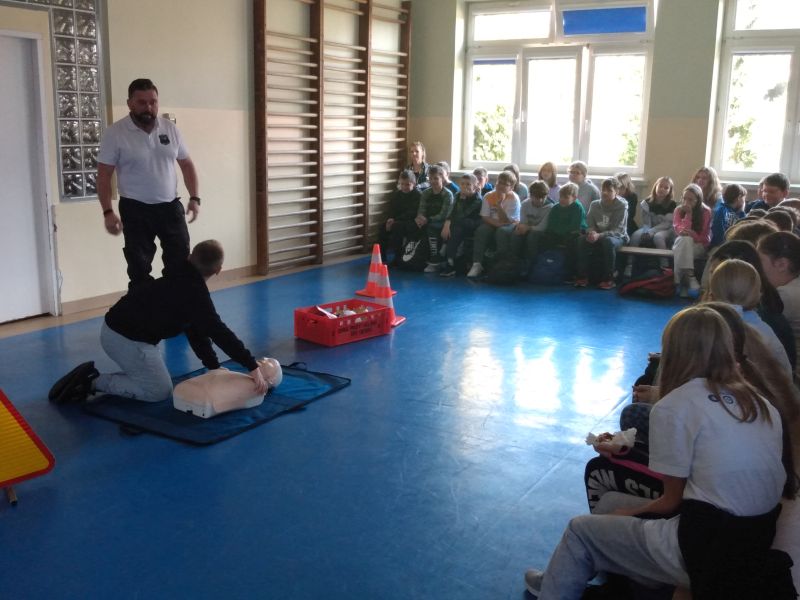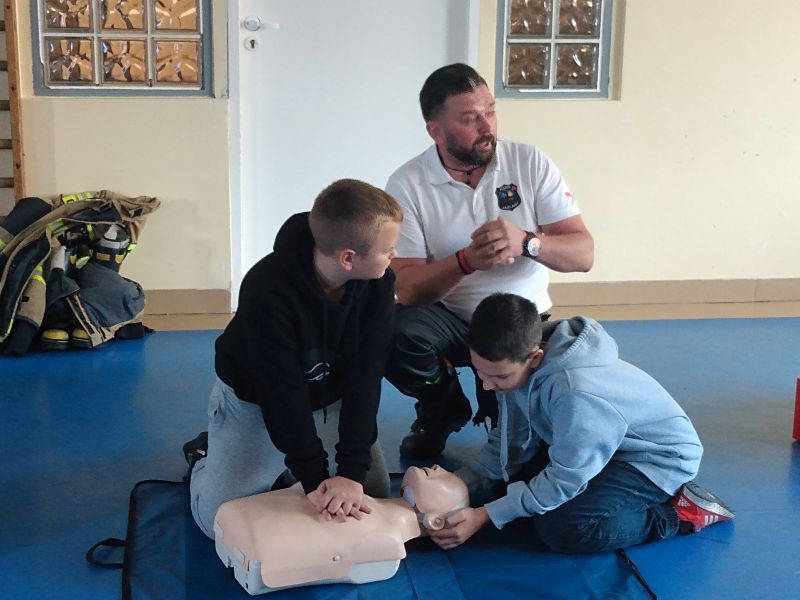 Wzorem ubiegłego roku w naszej szkole odbył się kolejny pokaz pierwszej pomocy prezentowany przez strażaków z OSP w Jaślanach: pana komendanta Marka Czerwa i Łukasza Stalę. Uczniowie obserwowali działania, które prowadzili strażacy. Poznali zasady postępowania w przypadku zatrzymania akcji krążenia oraz samodzielnie wykonywali prezentowane czynności. Chętnie nabywali umiejętności postępowania w przypadku zasłabnięcia i zakrztuszenia. Pamiętamy o tym, że szybka pomoc może uratować życie osobie poszkodowanej w wypadku!