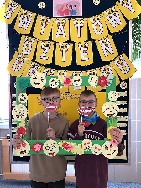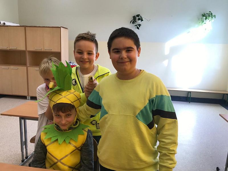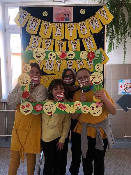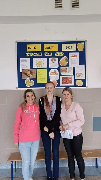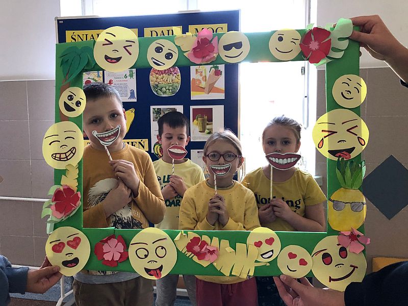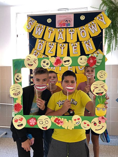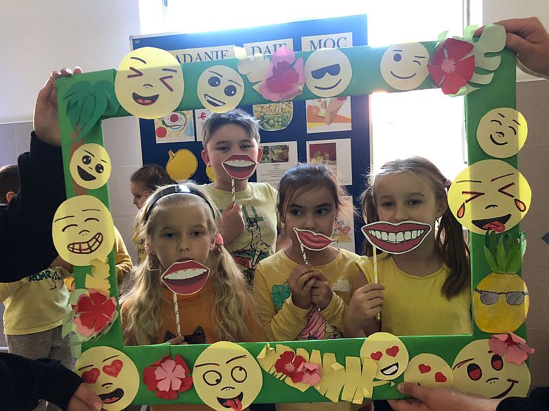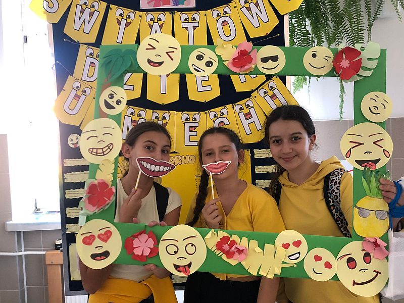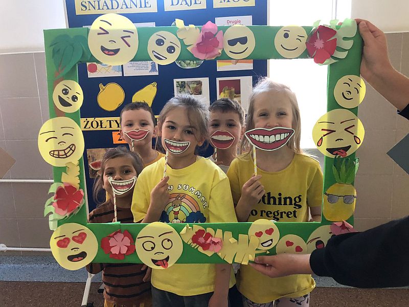 W listopadzie kolejny raz przystąpiliśmy do ogólnopolskiej akcji „Śniadanie daje moc”, który połączyliśmy z żółtym dniem uśmiechu. Ubrani w żółte koszulki spożywaliśmy drugie śniadania przygotowane samodzielnie z wykorzystaniem owoców i warzyw i nie tylko. Uczniowie klas młodszych obejrzeli filmiki edukacyjne o walorach zdrowotnych warzyw i owoców oraz przypomnieli sobie budowę piramidy zdrowia. Następnie w towarzystwie kolegów i koleżanek spożyliśmy drugie śniadania. Dzień ten przebiegał pod hasłem „uśmiechu”, którego symbolem jest żółta buźka. Wielu uczniów pozowało do wspólnych wesołych zdjęć, które wykonali w żółtej ozdobnej ramce. Wesoły nastrój i uśmiech oraz dobry humor towarzyszył nam przez cały pobyt w szkole. Dzieliliśmy się miłym uśmiechem zarówno podczas lekcji, jak i przerw na szkolnych korytarzach. Zachęcamy aby uśmiech gościł na twarzach codziennie i dawał wszystkim poczucie radości i zadowolenia. Pamiętajmy, że śmiech to zdrowie