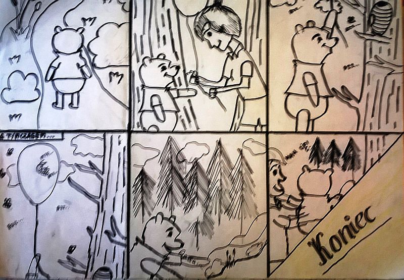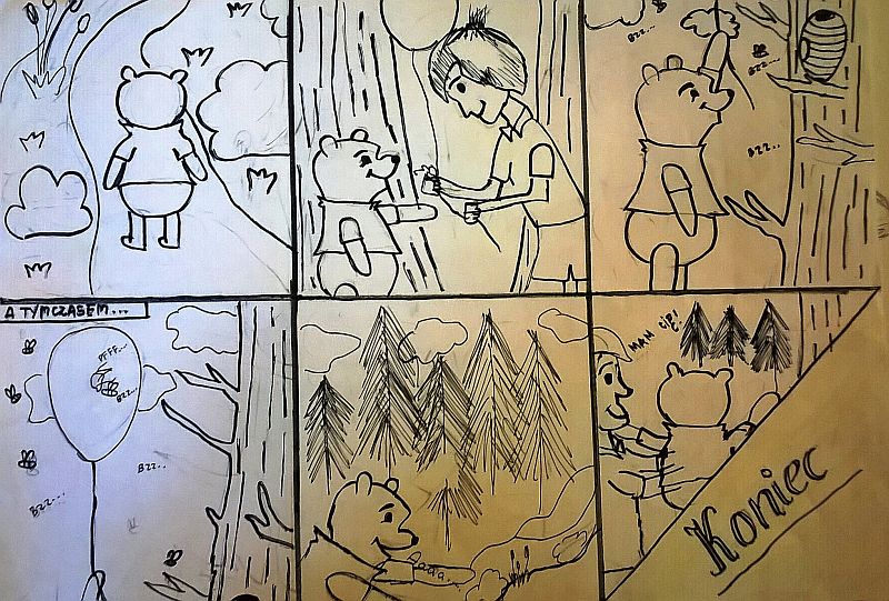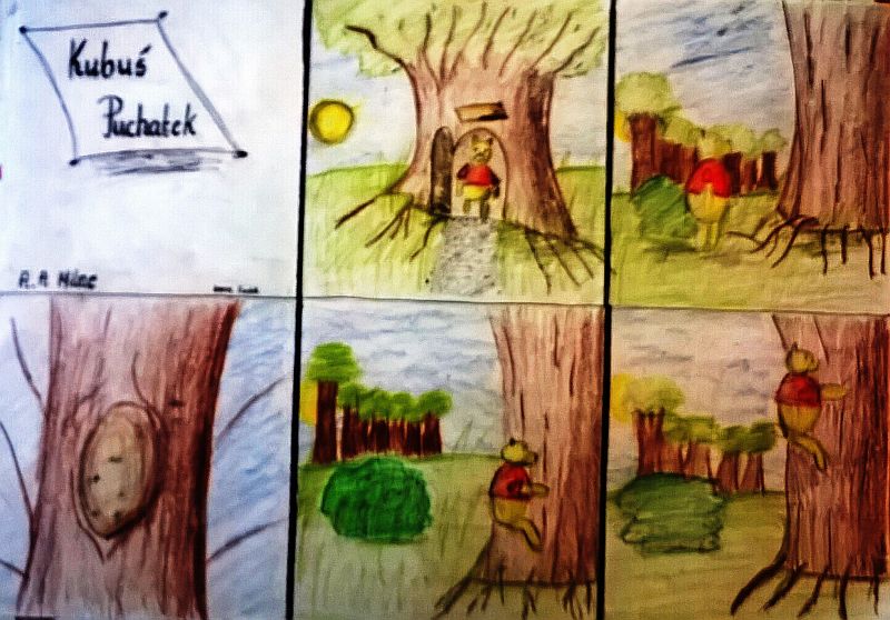 Uczniowie klas czwartych i piątych zainspirowani książką A.A. Milne „Kubuś Puchatek i jego przyjaciele”, na lekcjach plastyki wykonali interesujące komiksy przedstawające przygody małego misia i jego przyjaciół. Prace powstały w ramach ogólnopolskiej akcji oraz realizacji projektu z plastyki pt. „Cala Polska czyta dzieciom”.