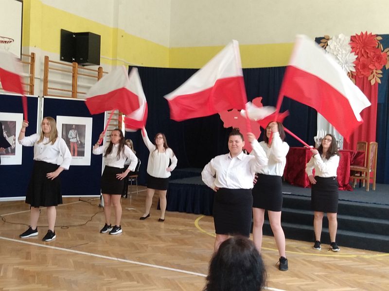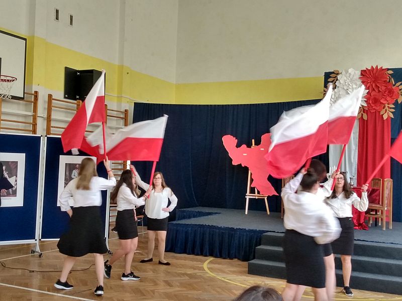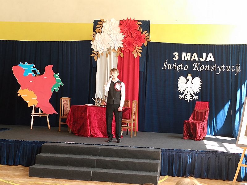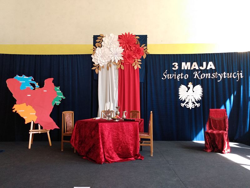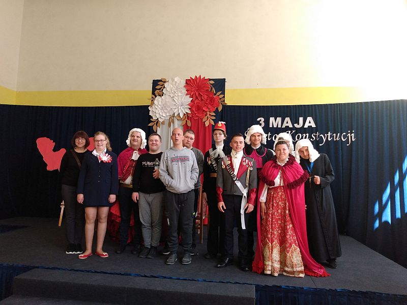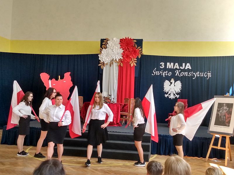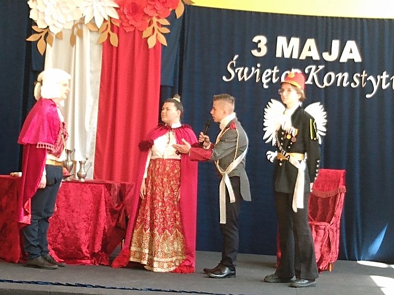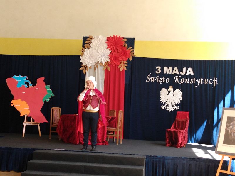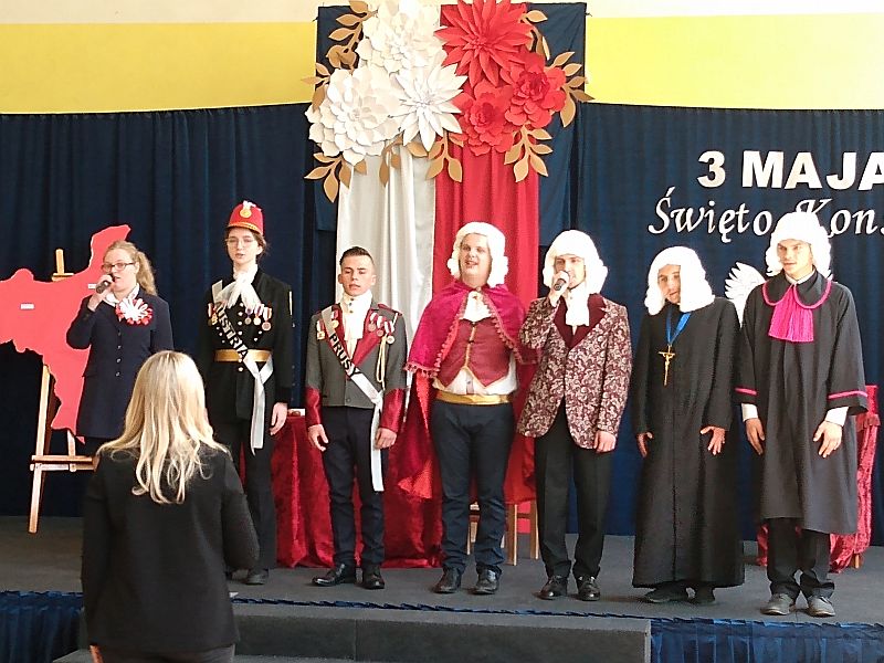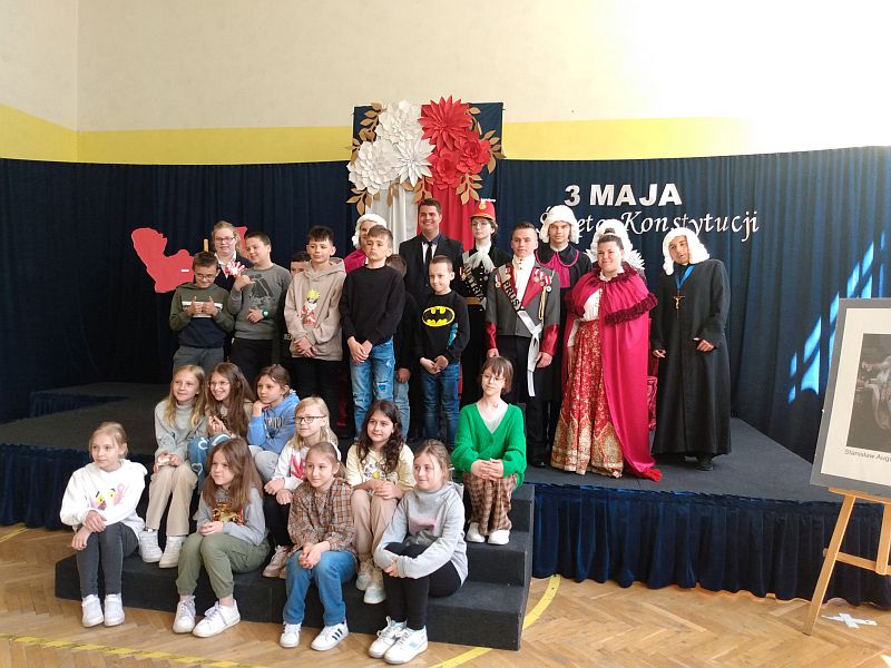 4 maja 2023r. uczniowie klas 4b i 8s obejrzeli montaż słowno - muzyczny z okazji rocznicy uchwalenia Konstytucji 3 Maja, przygotowany przez uczniów szkoły branżowej SOSW im. Jadwigi Królowej w Mielcu. Perfekcyjnie przygotowane przedstawienie, piękna sceneria, wspaniałe kostiumy z epoki, muzyka i gra aktorska, zachwyciły wszystkich widzów, przenosząc nas do czasów króla Stanisława Augusta Poniatowskiego.