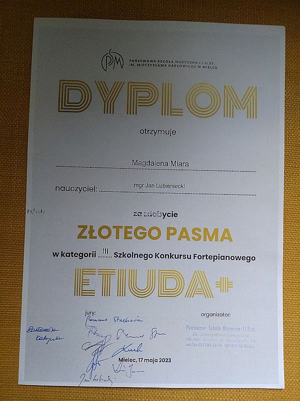 Złote Pasmo dla Magdaleny Miara jest uczennicą klasy 7c, bardzo uzdolnioną muzycznie. Wielokrotnie podczas lekcji muzyki oraz uroczystości szkolnych rezentowała swoje umiejętności gry na pianinie, czym wzbudzała zachwyt wśród słuchaczy. Jej wrażliwość muzyczna, niezwykła interpretacja utworów została zauważona i doceniona przez jury podczas Szkolnego Konkursu Fortepianowego, który odbył się 17 maja 2023r. w Państwowej Szkole Muzycznej I i II Stopnia im.M.Karłowicza