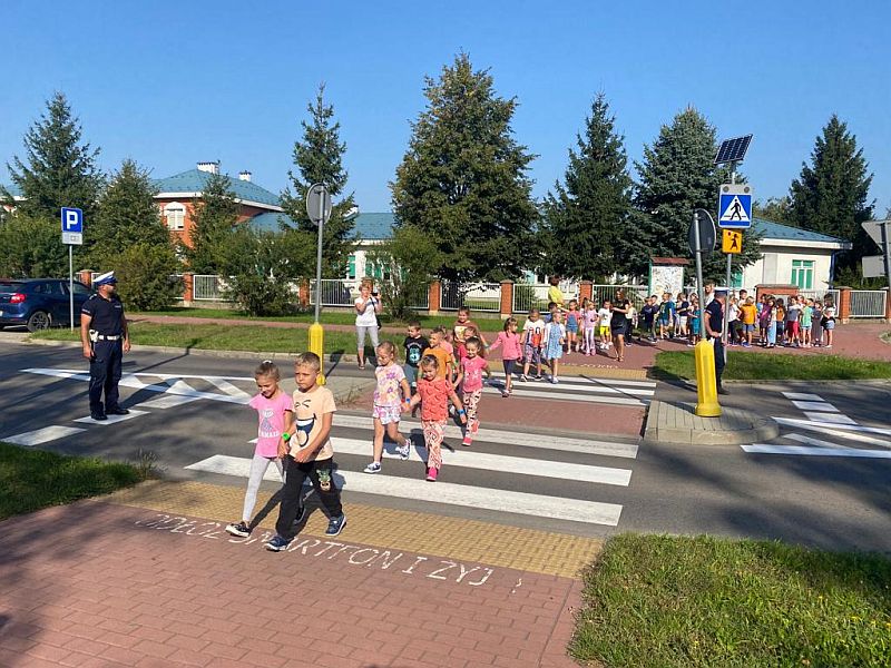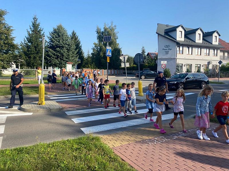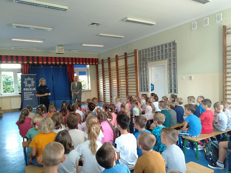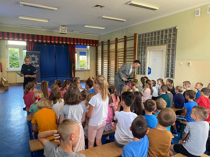 W dniu 8.09.2023r. uczniowie klas 1 wraz z wychowawcami spotkali się z panią aspirant Magdalena Skulimowską z KPP w Mielcu oraz panem Januszem Stachowiczem- dyrektorem WORD w Rzeszowie. Pani policjantka omówiła z dziećmi zasady bezpiecznego poruszania się po drodze a także zwróciła uwagę na inne zagrożenia, z którymi mogę zetknąć się najmłodsi w drodze do szkoły. Pani policjantka przypomniała uczniom jak ważnym elementem bezpieczeństwa jest noszenie odblasków. Dzieci otrzymały odblaskowe opaski, które zostały ufundowane przez pana J. Stachowicza. Na zakończenie zajęć dzieci ćwiczyły bezpieczne przechodzenie przez przejście dla pieszych pod czujnym okiem policjantów z wydziału Ruchu drogowego KPP w Mielcu.