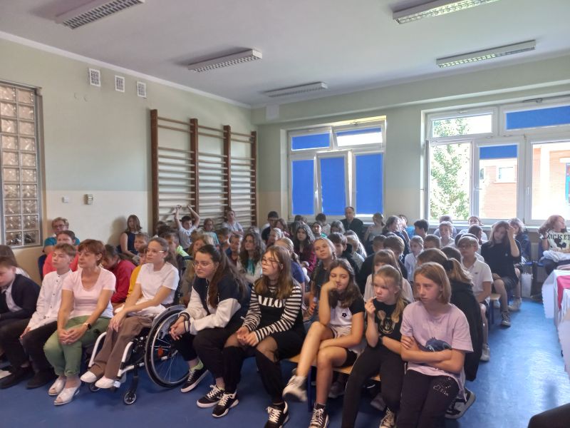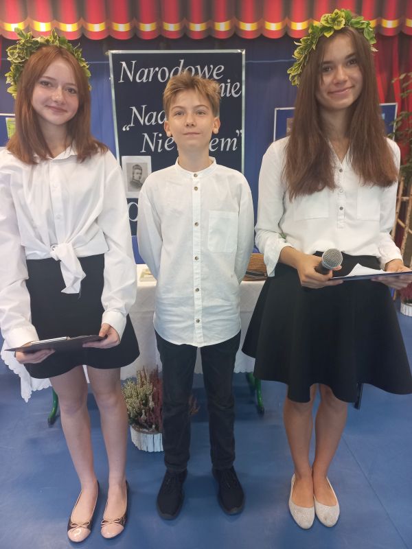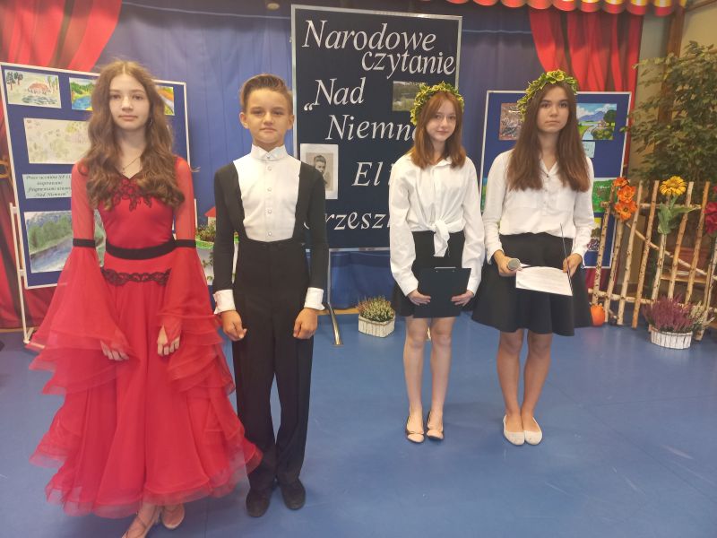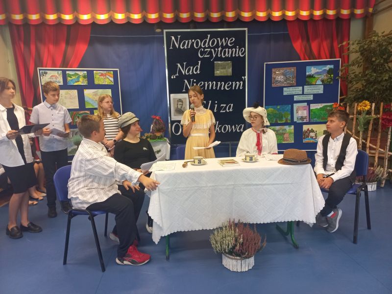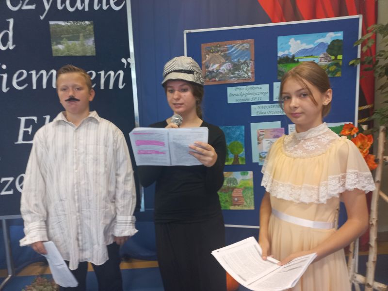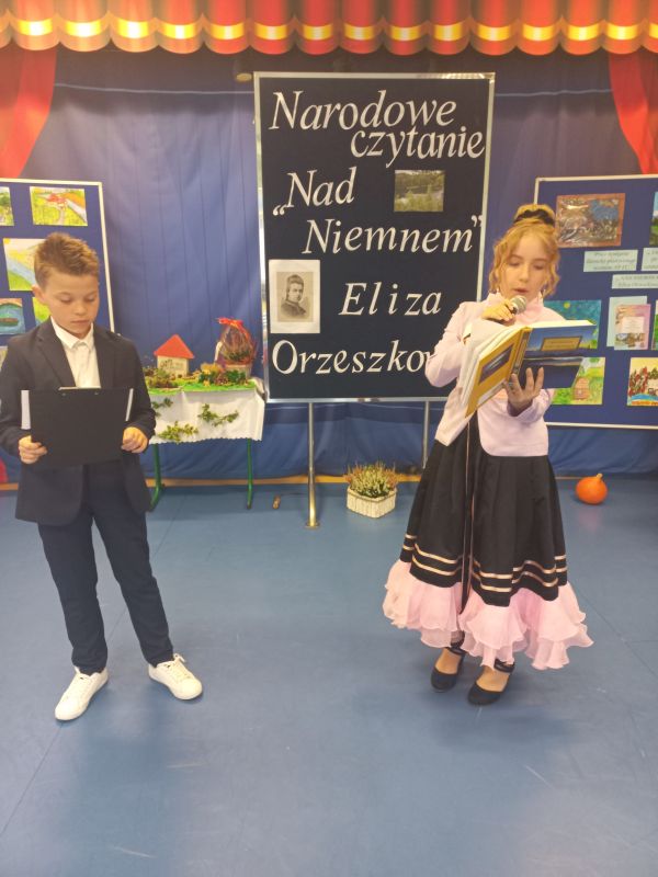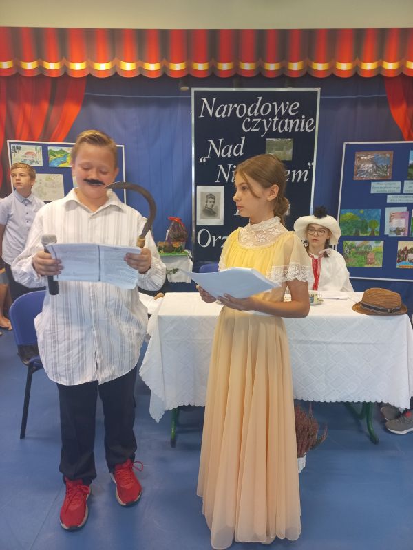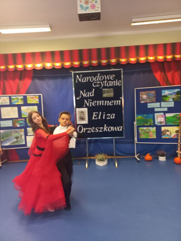 W nastrój tego spotkania wprowadził zgromadzoną publiczność jeden z uczniów klasy 5c - Franek, który w roli dziennikarza przeprowadził bardzo ciekawy wywiad z samą Elizą Orzeszkową ( w tę rolę świetnie wcieliła się Natalia z kl. 6a). Dopełnieniem przeżywania przygód bohaterów nadniemeńskiej historii była inscenizacja wydarzeń z Korczyna przygotowana na podstawie powieści przez uczniów klasy 6d. Akcentem nawiązującym do utworu Orzeszkowej stała się ludowa piosenka – „Lipka” znakomicie zaśpiewana przez Nikolę i Paulinę z kl. 6 d. Widzów zachwycił walc w wykonaniu uczniów Nikoli i Gabrysia –utalentowanych tancerzy z naszej szkoły. Zaprezentowane utwory, kostiumy oraz dekoracje przeniosły publiczność do XIX w. i atmosfery tego czasu. Dla podkreślenia przesłania utworu i jego uniwersalnych wartości uczniowie klasy 7b wyrecytowali „Hymn o miłości”.