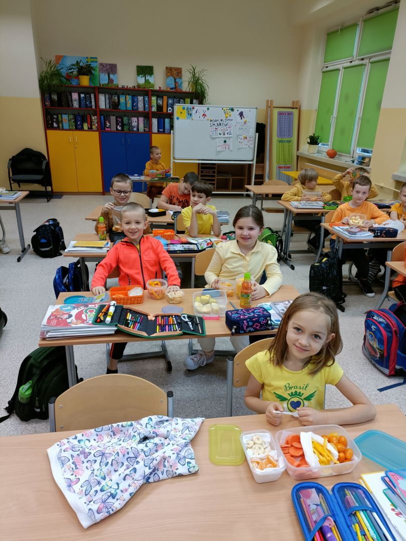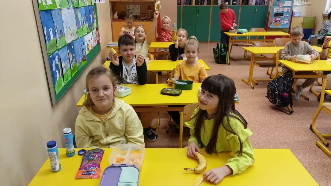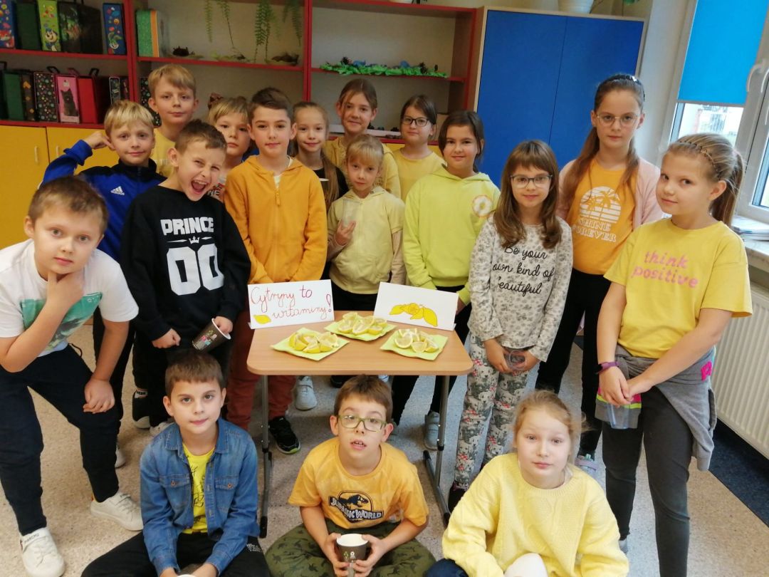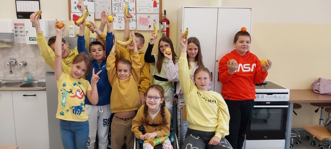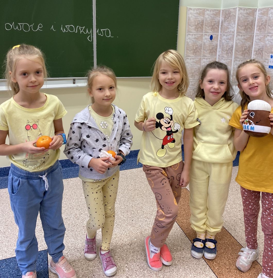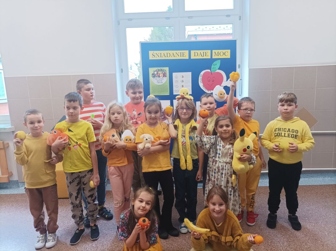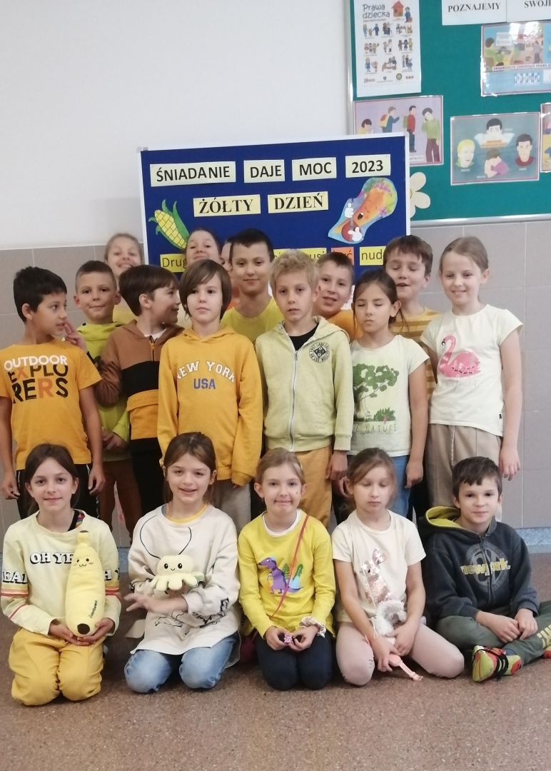 Kolejny rok w „Żółtym dniu” zorganizowaliśmy wspólne klasowe drugie śniadania, podczas których spożywaliśmy żółte owoce i warzywa. Pamiętając o tym, że drugie śniadanie to ważny posiłek, który dostarcza nam energii i siły na czas nauki i zabawy w szkole wspólnie przygotowaliśmy posiłki, w których nie zabrakło witamin. Od kilku lat korzystamy w naszej szkole z „Programów dla szkół”, koordynowanych przez Krajowy Ośrodek Wsparcia Rolnictwa oraz Unię Europejską. Uczniowie klas 1-5 otrzymują mleko, kefiry, serki oraz warzywa i owoce, które regularnie spożywają na przerwach. Przez co kształtują prawidłowe nawyki żywieniowe i poznają smaki zdrowych przekąsek. Organizując „Żółty dzień” poznajemy nowe sposoby sporządzania posiłków oraz nowe smaki. W tym roku uczniowie wszystkich klas 1-szych odbyli spotkania z p. dietetyk Eweliną Jamróz, podczas których poznali zasady przygotowania zdrowego śniadania do szkoły.Dziękujemy wszystkim, którzy aktywnie uczestniczyli w naszych działaniach .