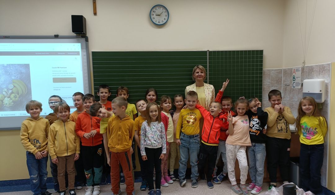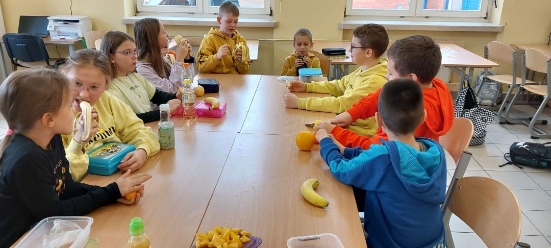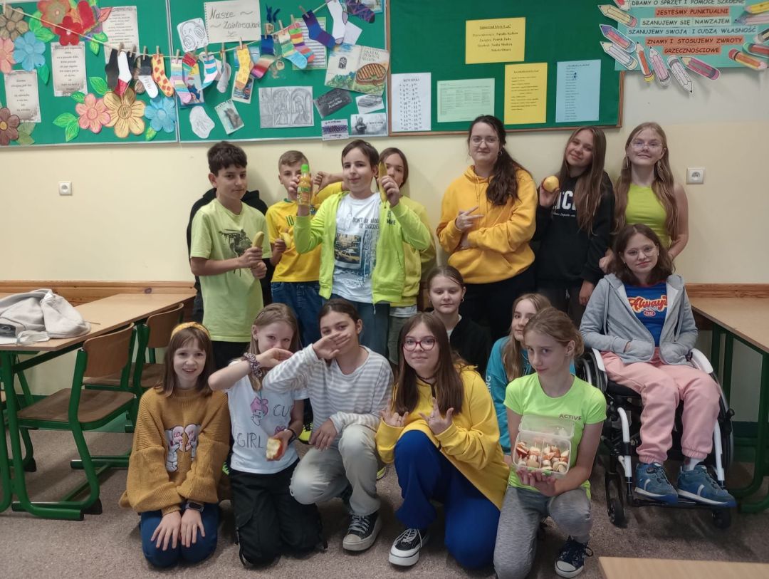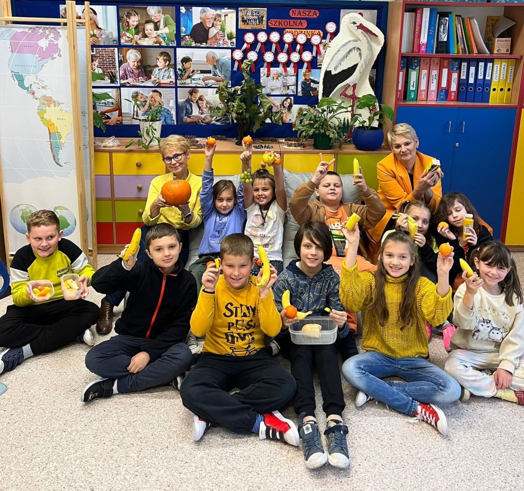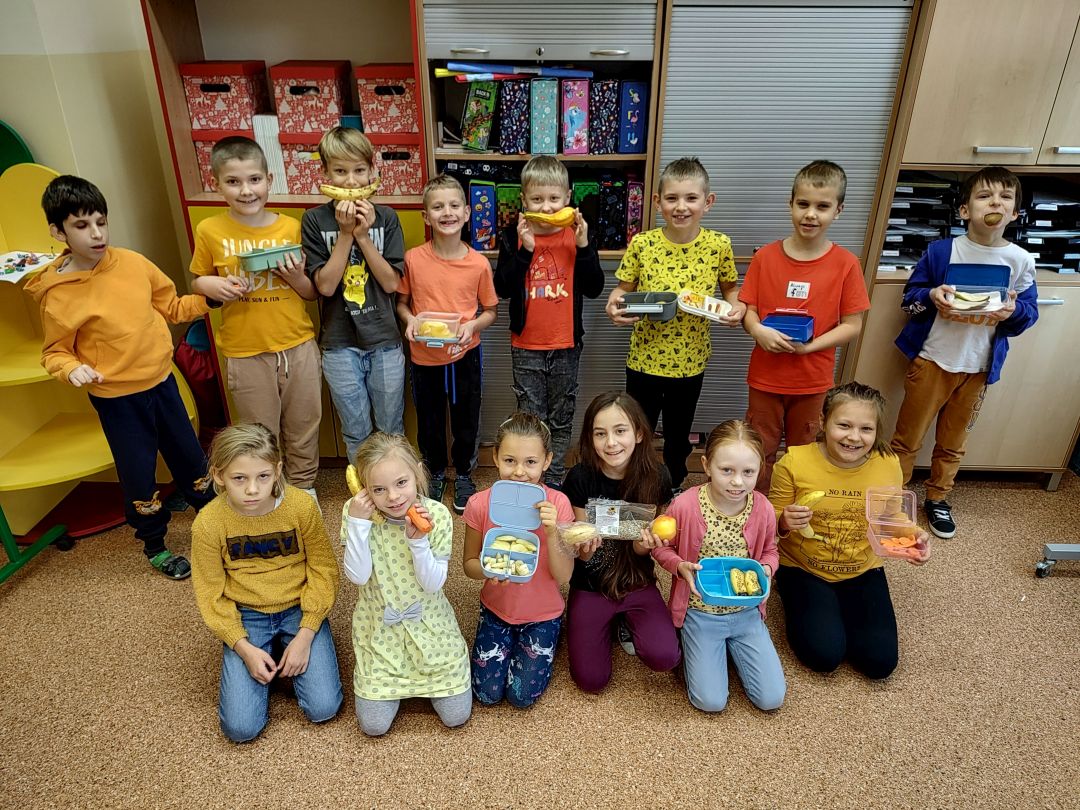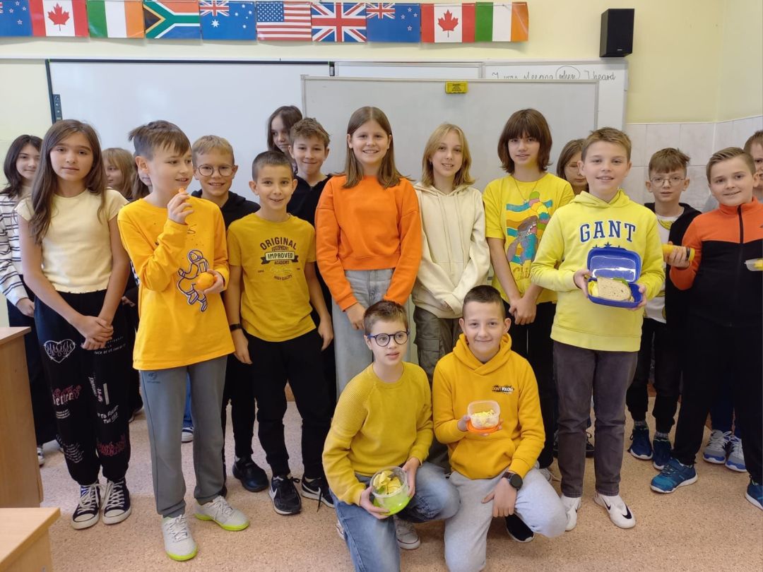Kolejny rok w „Żółtym dniu” zorganizowaliśmy wspólne klasowe drugie śniadania, podczas których spożywaliśmy żółte owoce i warzywa. Pamiętając o tym, że drugie śniadanie to ważny posiłek, który dostarcza nam energii i siły na czas nauki i zabawy w szkole wspólnie przygotowaliśmy posiłki, w których nie zabrakło witamin. Od kilku lat korzystamy w naszej szkole z „Programów dla szkół”, koordynowanych przez Krajowy Ośrodek Wsparcia Rolnictwa oraz Unię Europejską. Uczniowie klas 1-5 otrzymują mleko, kefiry, serki oraz warzywa i owoce, które regularnie spożywają na przerwach. Przez co kształtują prawidłowe nawyki żywieniowe i poznają smaki zdrowych przekąsek. Organizując „Żółty dzień” poznajemy nowe sposoby sporządzania posiłków oraz nowe smaki. W tym roku uczniowie wszystkich klas 1-szych odbyli spotkania z p. dietetyk Eweliną Jamróz, podczas których poznali zasady przygotowania zdrowego śniadania do szkoły.Dziękujemy wszystkim, którzy aktywnie uczestniczyli w naszych działaniach .