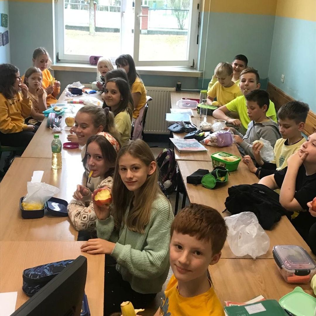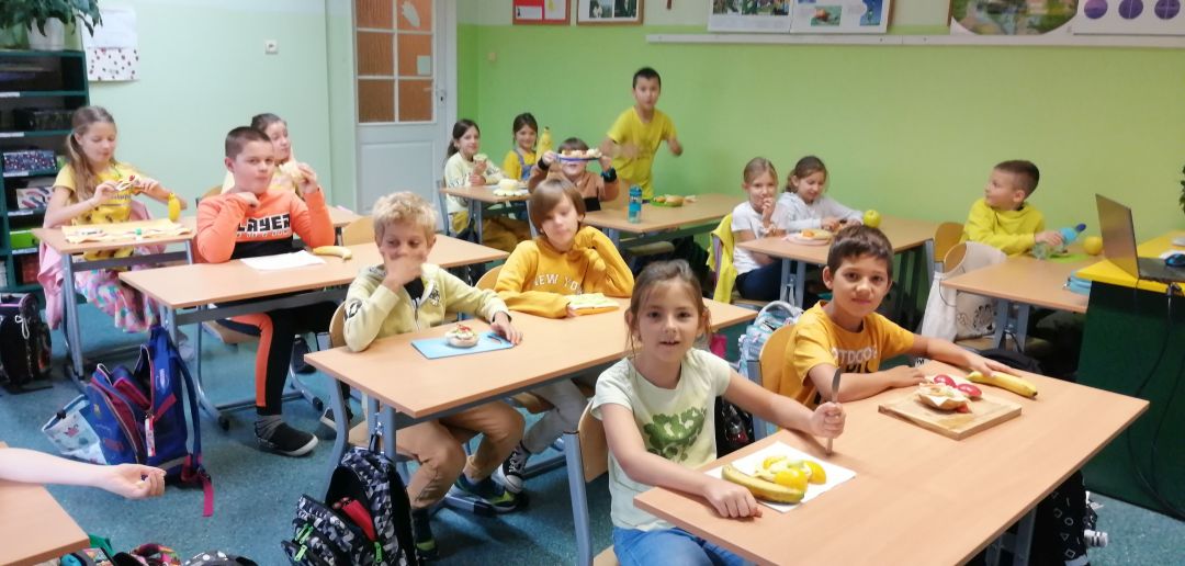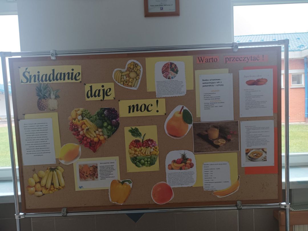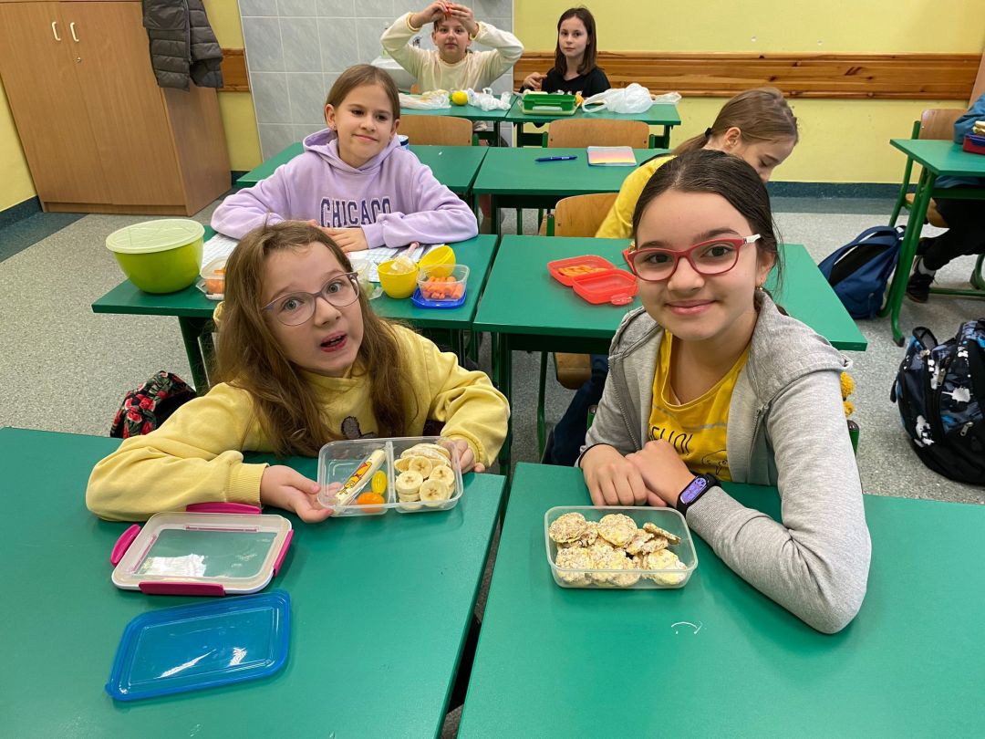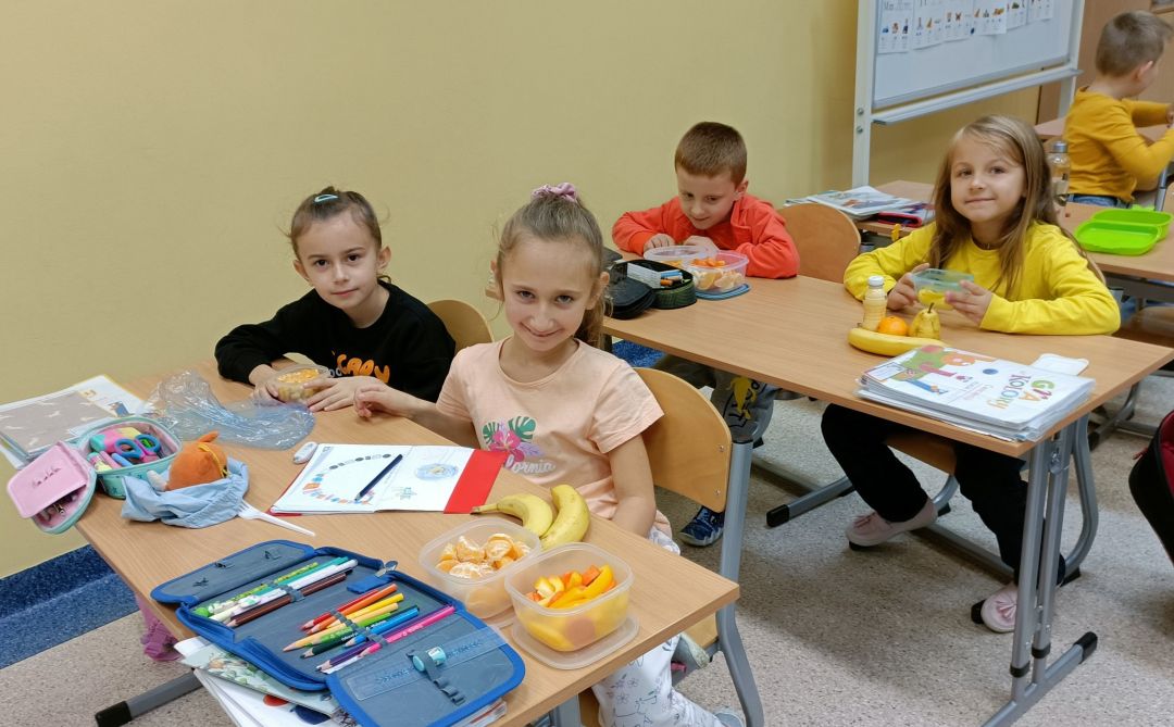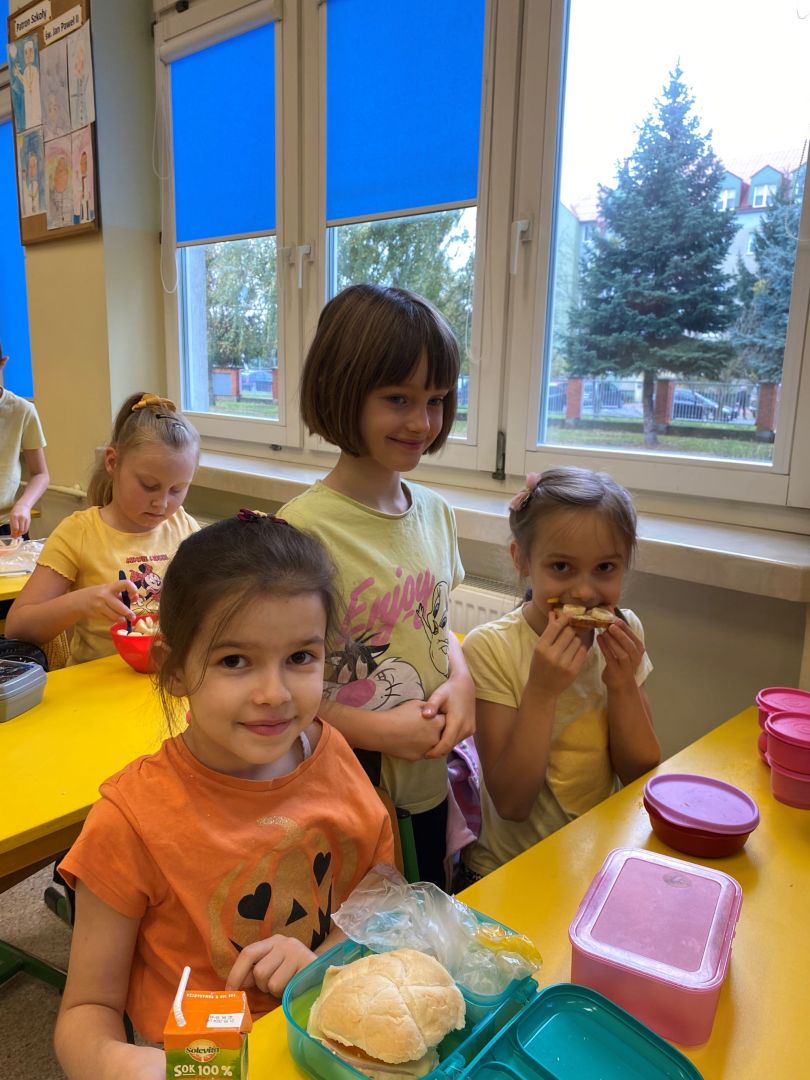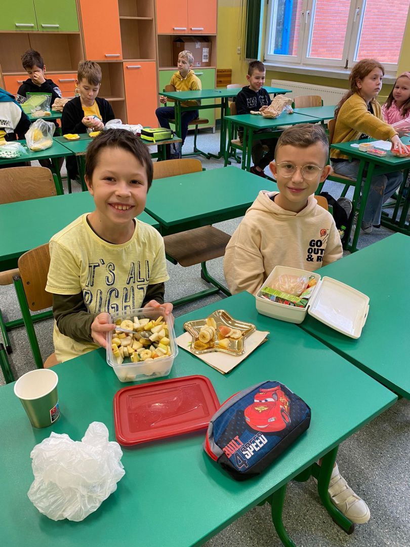 Kolejny rok w „Żółtym dniu” zorganizowaliśmy wspólne klasowe drugie śniadania, podczas których spożywaliśmy żółte owoce i warzywa. Pamiętając o tym, że drugie śniadanie to ważny posiłek, który dostarcza nam energii i siły na czas nauki i zabawy w szkole wspólnie przygotowaliśmy posiłki, w których nie zabrakło witamin. Od kilku lat korzystamy w naszej szkole z „Programów dla szkół”, koordynowanych przez Krajowy Ośrodek Wsparcia Rolnictwa oraz Unię Europejską. Uczniowie klas 1-5 otrzymują mleko, kefiry, serki oraz warzywa i owoce, które regularnie spożywają na przerwach. Przez co kształtują prawidłowe nawyki żywieniowe i poznają smaki zdrowych przekąsek. Organizując „Żółty dzień” poznajemy nowe sposoby sporządzania posiłków oraz nowe smaki. W tym roku uczniowie wszystkich klas 1-szych odbyli spotkania z p. dietetyk Eweliną Jamróz, podczas których poznali zasady przygotowania zdrowego śniadania do szkoły.Dziękujemy wszystkim, którzy aktywnie uczestniczyli w naszych działaniach .