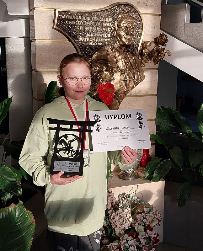 Uczennica klasy 4a Zuzanna Kurek zajęła II miejsce w swojej kategorii wiekowej w Młodzieżowym Turnieju Karate w Gromniku, który odbył się 9 grudnia 2023r. Gratulujemy Zuzi wspaniałego osiągnięcia i życzymy dalszych sukcesów!