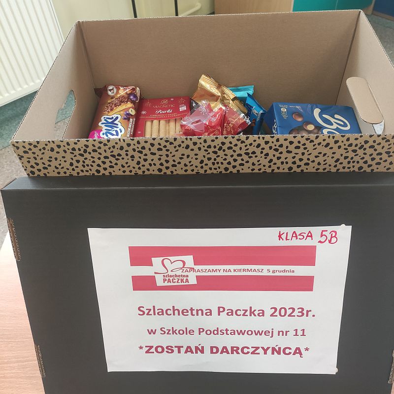 Klasa 5b wraz z wychowawcą włączyła się do Ogólnopolskiej Akcji „ Szlachetna Paczka”. Uczniowie, zaangażowali się w przygotowanie szkolnego kiermaszu świątecznego, przynosząc ozdoby i ciasteczka świąteczne. Przygotowali też dwie paczki z produktami spożywczymi, chemią i słodyczami, które w czwartek, 7 grudnia, przekazali do pedagoga szkolnego - koordynatora akcji „ Szlachetna Paczka” w naszej szkole.