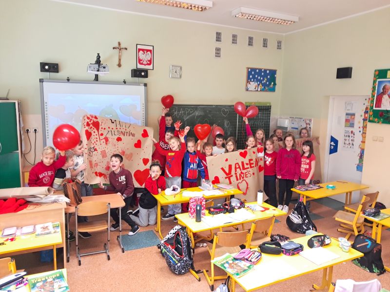 Środa 14 lutego upłynął w naszej szkole w kolorach czerwieni, atmosferze miłości i przyjaźni. A wszystko to z okazji Walentynek. Ten radosny i magiczny dzień postanowili uczcić uczniowie klasy 2b i 2c naszej szkoły. Uczniowie samodzielnie wykonali kartki walentynkowe z życzeniami oraz śpiewali piosenki w języku angielskim. W tym dniu uczniowie okazywali sobie wzajemną życzliwość, przyjaźń oraz bezinteresowną pomoc.