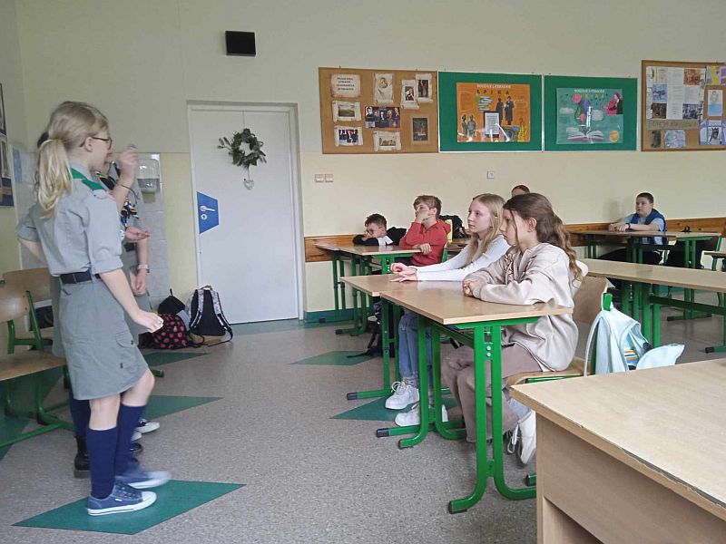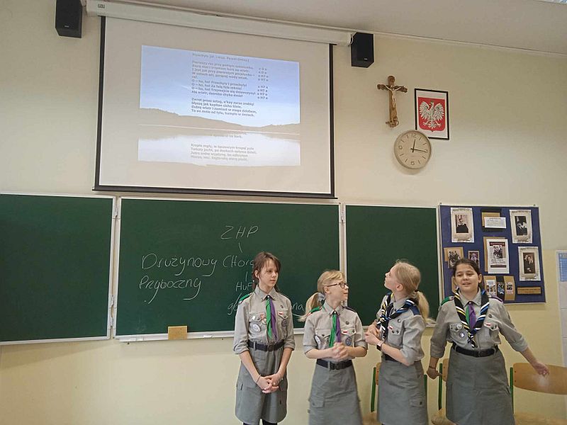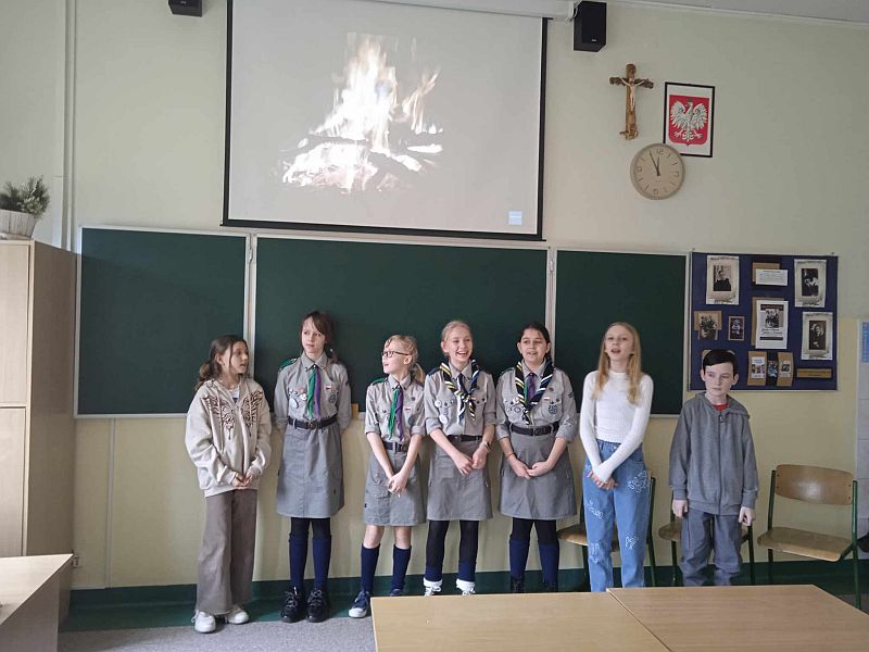 „Śpiewajmy wszyscy w ten radosny czas, śpiewajmy razem, ilu jest tu nas, choć lata młode szybko płyną wiemy, że nie starzejemy się!” Takie oto słowa dumnie wybrzmiały na lekcji języka polskiego. 22 lutego przez harcerzy obchodzony był Dzień Myśli Braterskiej. Z tej okazji uczennice klasy 5b, należące do grupy ZHP Mielec przygotowały wspaniały występ dla kolegów i koleżanek oraz nauczycieli. Dziewczęta opowiedziały o ruchu społecznym, jakim jest harcerstwo. Pojawiło się wiele ważnych zagadnień dotyczących służby, samodoskonalenia, a także przyjaźni i braterstwa.Uczennice wystąpiły w strojach tematycznych. Opowiedziały też z jakich elementów składa się taki strój, wymieniając wszystkie ciekawe nazwy. Nie zabrakło śpiewu i tańca przy akompaniamencie gitary. Niewątpliwie była to niezapomniana lekcja języka polskiego!