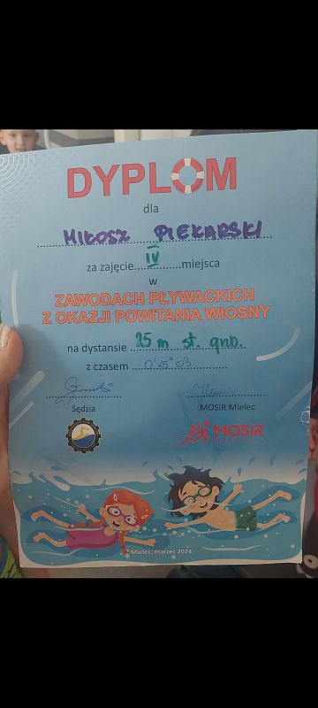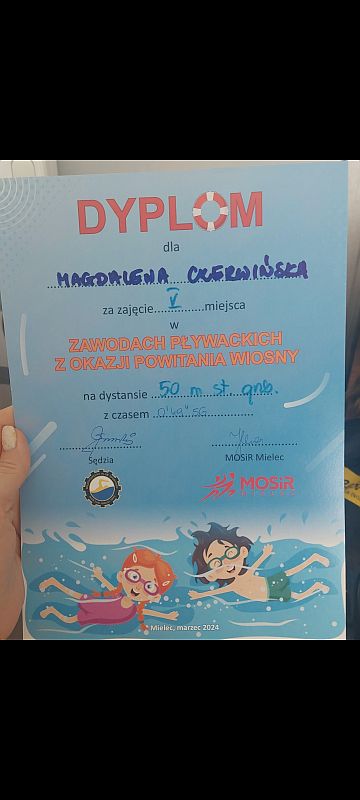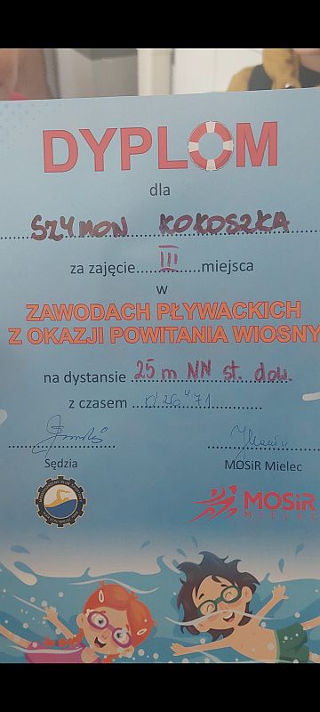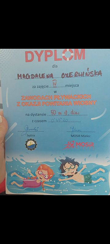 W dniu 20.03.2024 r w Pływalni Smoczka odbyły się zawody pływackie dla klas I-III szkół podstawowych. Z okazji „ Powitania wiosny” organizowanych przez MOSIR Mielec. Wyniki naszych uczniów: