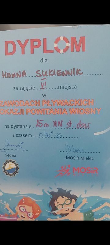 Mateusz Warczak kl. 1 c – VI miejsce na dystansie 25 m stylem dowolnym, Hanna Sukiennik kl.1 e – VI miejsce na dystansie 25m stylem dowolnym.
