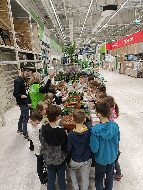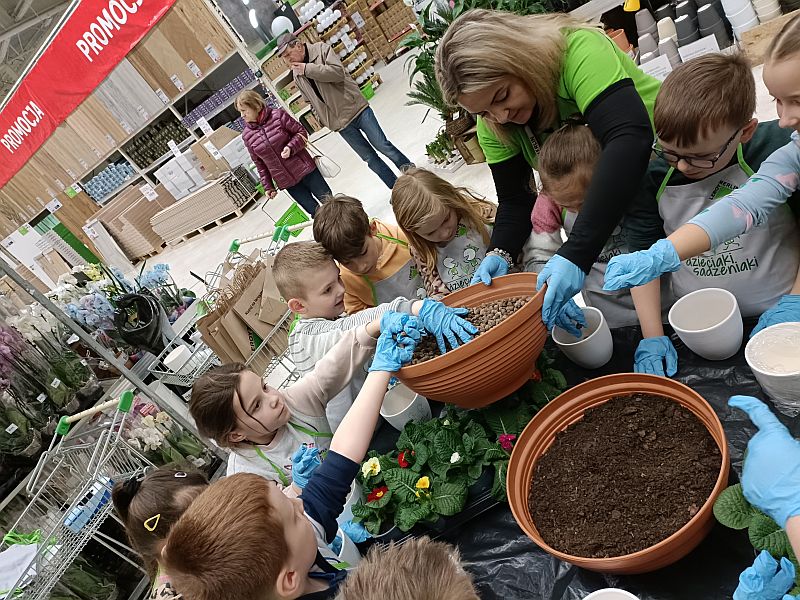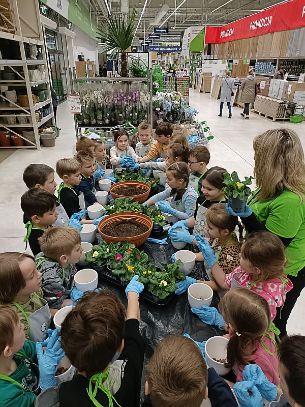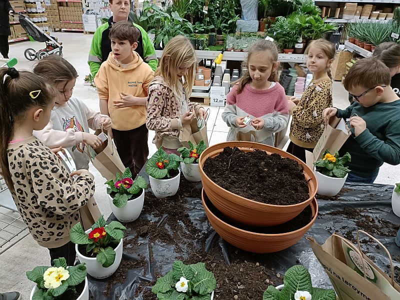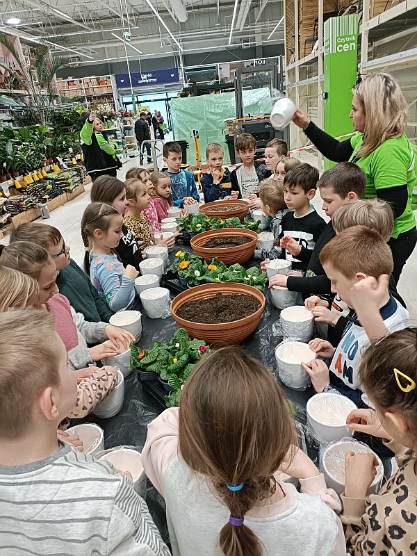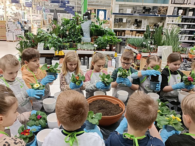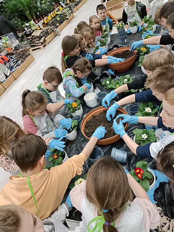 W ramach przygotowania się do powitania wiosny uczniowie klasy 1E wzięli udział w ogólnopolskiej akcji sklepu Leroy Merlin uczestnicząc w bezpłatnych warsztatach ogrodniczych „Dzieciaki Sadzeniaki”. Jej celem jest uczenie dzieci pielęgnacji roślin i rozbudzanie w nich zainteresowania przyrodą. Po krótkiej prezentacji o ekologii i roślinach dzieciaki założyły fartuszki i rękawiczki a następnie sięgnęły po piękne doniczki i kolorowe, ozdobne kwiaty. Każde dziecko według wskazówek miało samodzielnie posadzić swoją roślinkę, którą zabrało do domu, aby o nią samodzielnie dbać. Sadzenie kwiatów okazało się prawdziwą frajda dla wszystkich. Każdy z uczestników otrzymał pamiątkowy dyplom, słodki poczęstunek oraz drobne akcesoria sklepu. Po zakończonych warsztatach panie opowiedziały o swojej pracy i oprowadziły po sklepie. W zamian za tak cenną, żywą lekcję przyrody dzieci podziękowały paniom pięknymi pracami plastycznymi.