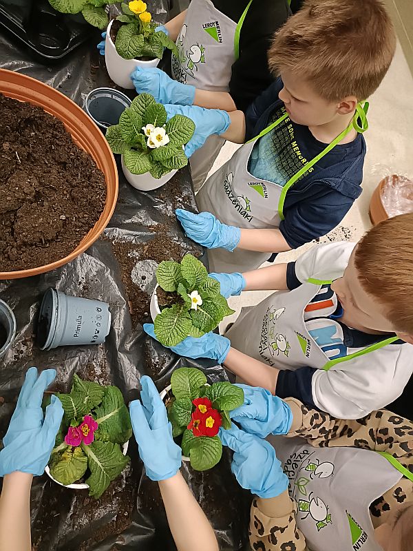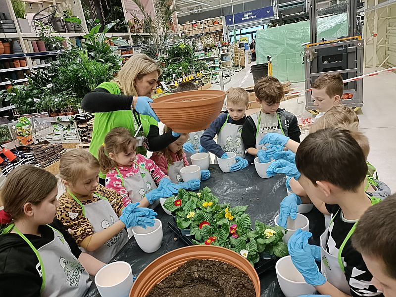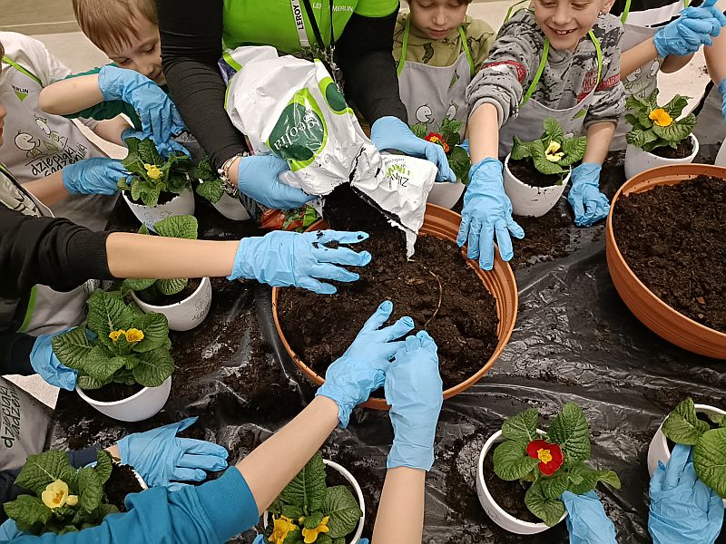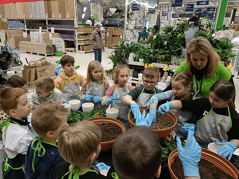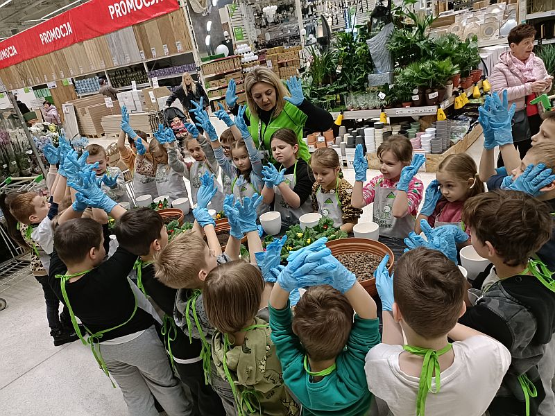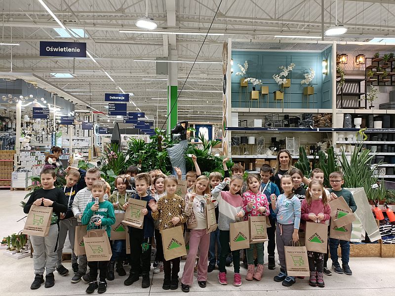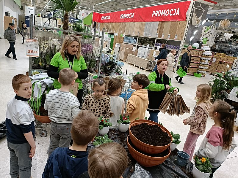 W ramach przygotowania się do powitania wiosny uczniowie klasy 1E wzięli udział w ogólnopolskiej akcji sklepu Leroy Merlin uczestnicząc w bezpłatnych warsztatach ogrodniczych „Dzieciaki Sadzeniaki”. Jej celem jest uczenie dzieci pielęgnacji roślin i rozbudzanie w nich zainteresowania przyrodą. Po krótkiej prezentacji o ekologii i roślinach dzieciaki założyły fartuszki i rękawiczki a następnie sięgnęły po piękne doniczki i kolorowe, ozdobne kwiaty. Każde dziecko według wskazówek miało samodzielnie posadzić swoją roślinkę, którą zabrało do domu, aby o nią samodzielnie dbać. Sadzenie kwiatów okazało się prawdziwą frajda dla wszystkich. Każdy z uczestników otrzymał pamiątkowy dyplom, słodki poczęstunek oraz drobne akcesoria sklepu. Po zakończonych warsztatach panie opowiedziały o swojej pracy i oprowadziły po sklepie. W zamian za tak cenną, żywą lekcję przyrody dzieci podziękowały paniom pięknymi pracami plastycznymi.
