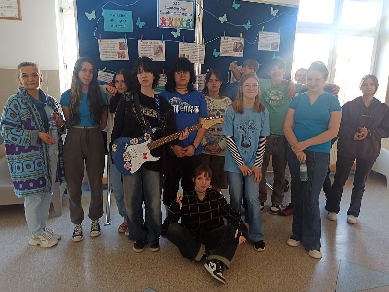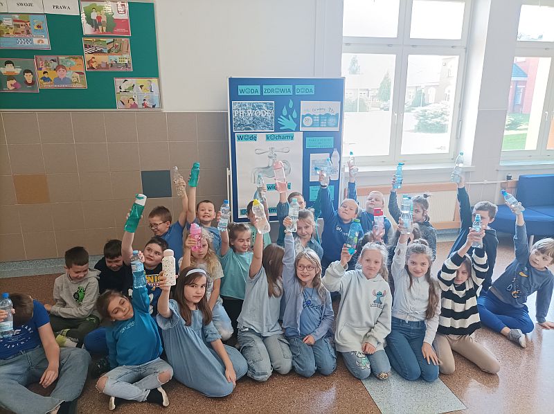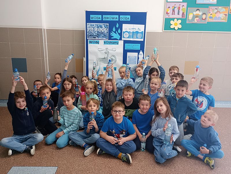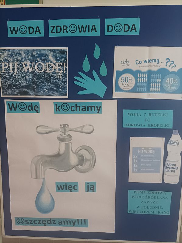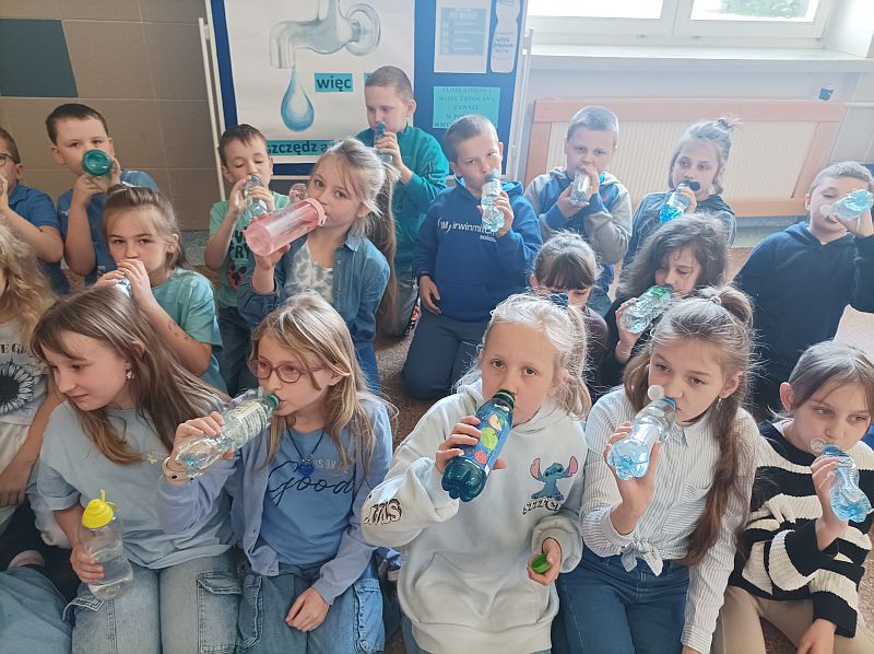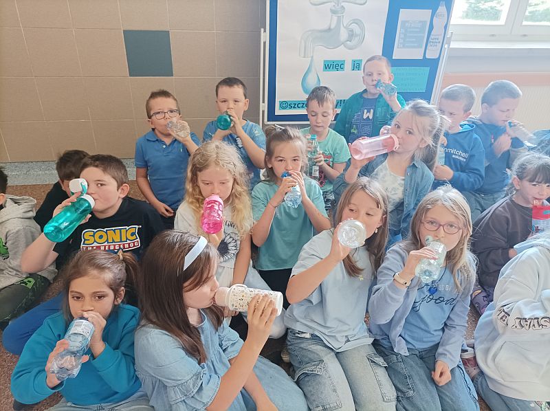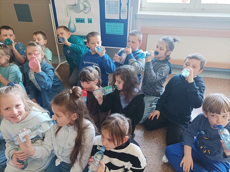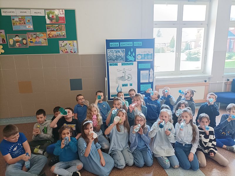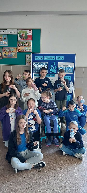„Niebieski dzień” zorganizowany 12-go kwietnia promował picie wody przez każdego ucznia w czasie lekcji i na przerwach. Ubrani w niebieskie koszulki uczniowie klas młodszych i starszych przynieśli butelki z wodą oraz brali udział w zajęciach, podczas których poznawali sposoby oszczędzania wody i jej właściwości. Pamiętajmy-picie wody małymi łykami przez cały dzień korzystnie wpływa na organizm i umożliwia prawidłowe nawilżenie wszystkich komórek ciała, poprawia funkcjonowanie mózgu i ułatwia uczenie się.