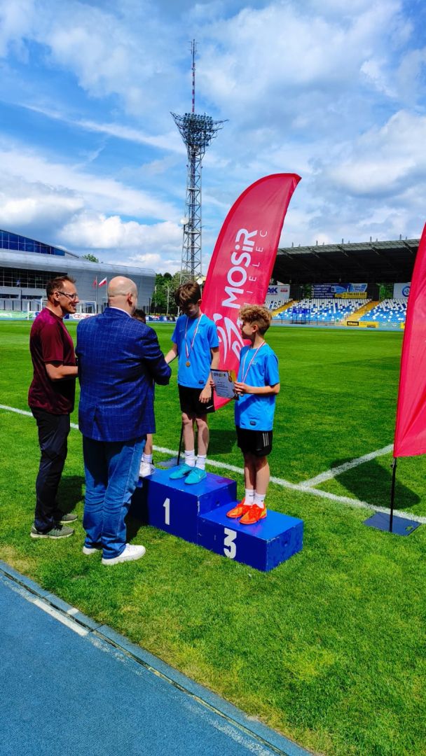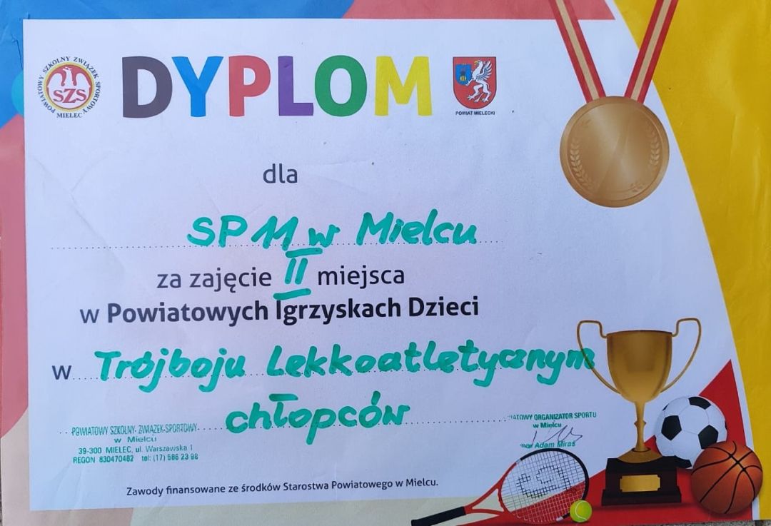 Znakomicie spisali się chłopcy z klas 4 Naszej szkoły w Finale powiatowym Igrzysk Dzieci w trójboju LA. Trójbój lekkoatletyczny składa się z 3 łączonych konkurencji lekkoatletycznych – biegu na 60m, skoku w dal z rozbiegu oraz rzutu piłeczką palantową. Zawody odbyły się na stadionie MOSiR w Mielcu, na którym swoje mecze rozgrywają też piłkarze ekstraklasowej Stali Mielec. Nasi młodzi lekkoatleci zdobyli wicemistrzostwo powiatu drużynowo zdobywając 310pkt. Przegrali złoto tylko 4 pkt z SP w Maliniu.
