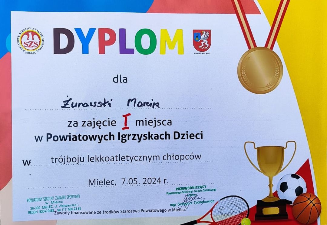 Zdecydowanie najlepszym lekkoatletą powiatu mieleckiego okazał się Marcin Żurawski z kl. 4d (m.in. Jako jedyny zawodnik zawodów skoczył w dal ponad 4m). Nieznacznie za nim ze świetnym wynikiem na 3 miejscu uplasował się Aleksander Bożek z kl. 4c. Skład zespołu w drużynie znakomicie uzupełnili Oliwier Pieprzny z 4d, Jakub Matysiak z 4b oraz Daniel Cichowski z 4c.