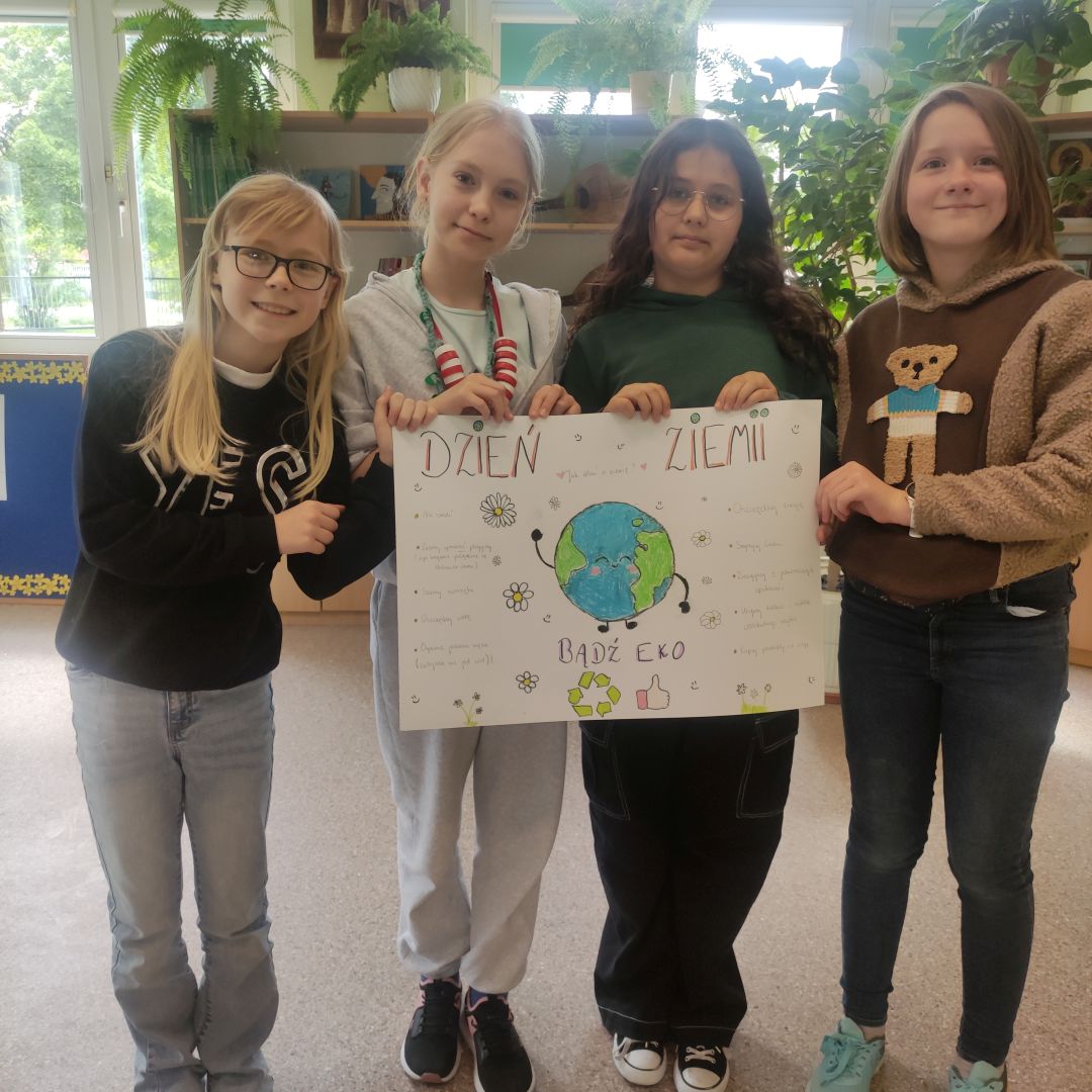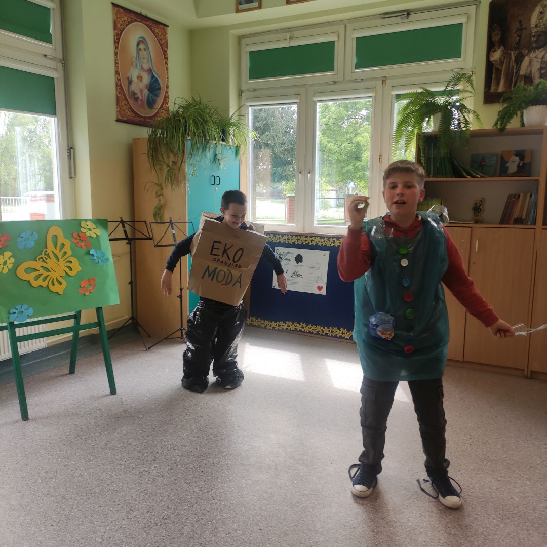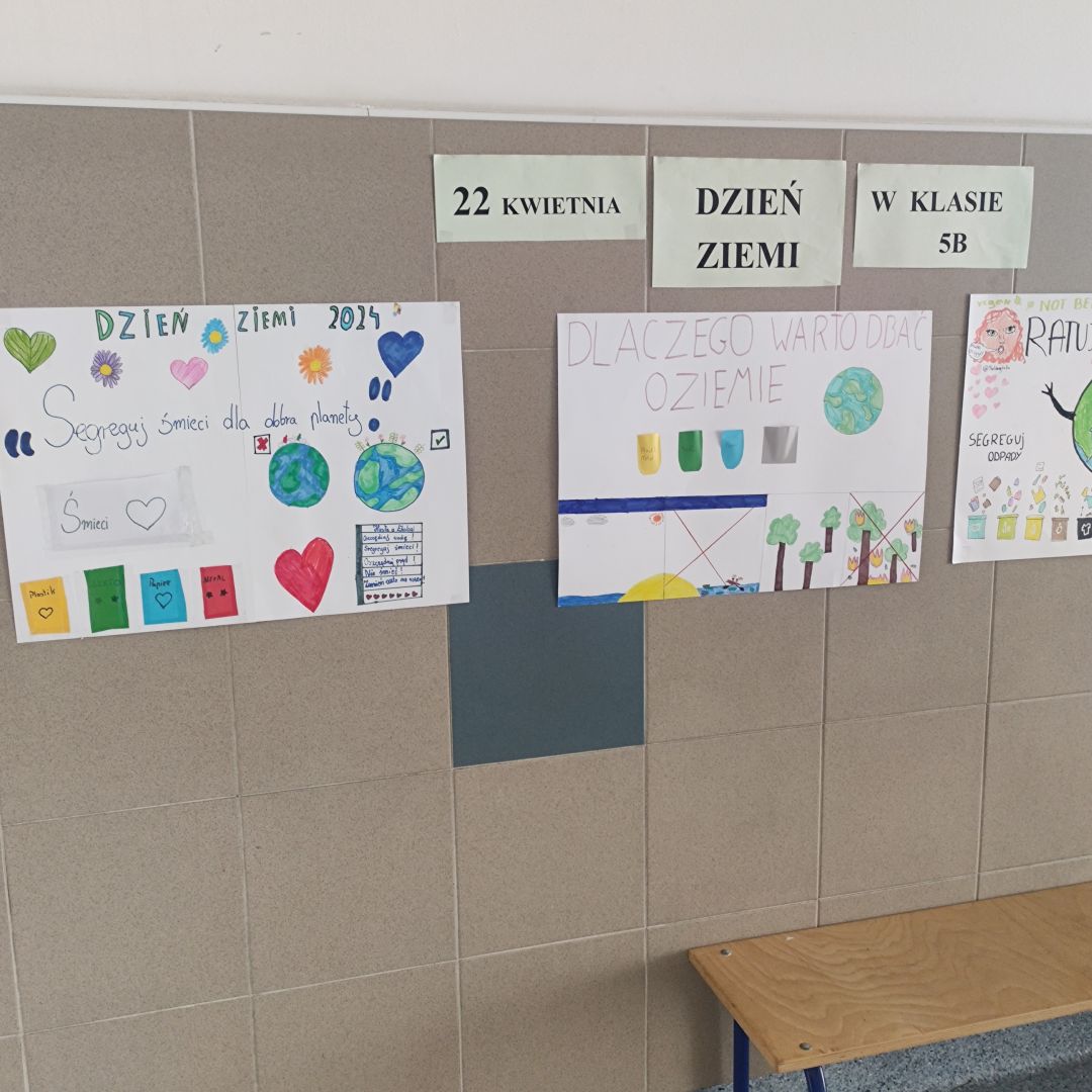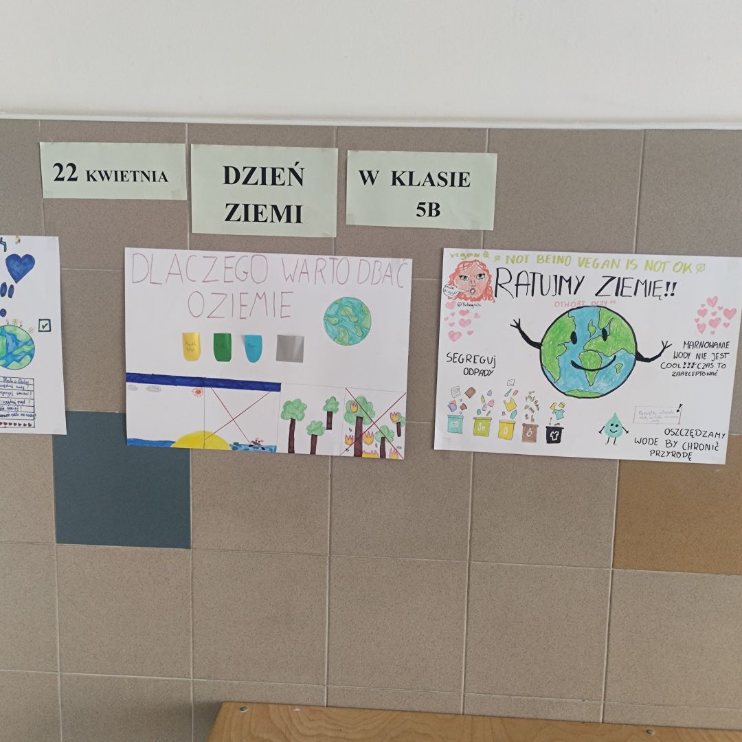 Uczniowie klasy 5b pamiętali o Światowym Dniu Ziemi , który obchodzimy co roku 22 kwietnia. Na zajęciach z wychowawcą , dzieci w grupach , wykonały plakaty o tematyce ekologicznej - zwracające uwagę na dbanie o czystość i ochronę środowiska . Odbył się też pokaz mody , w którym stroje wykonane były z materiałów recyklingowych . Nauka połączona z zabawą to najlepszy sposób by wiedza i dobre nawyki proekologiczne na zawsze pozostały w pamięci .