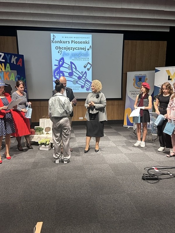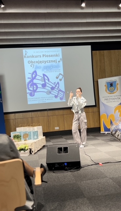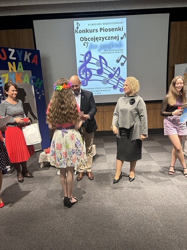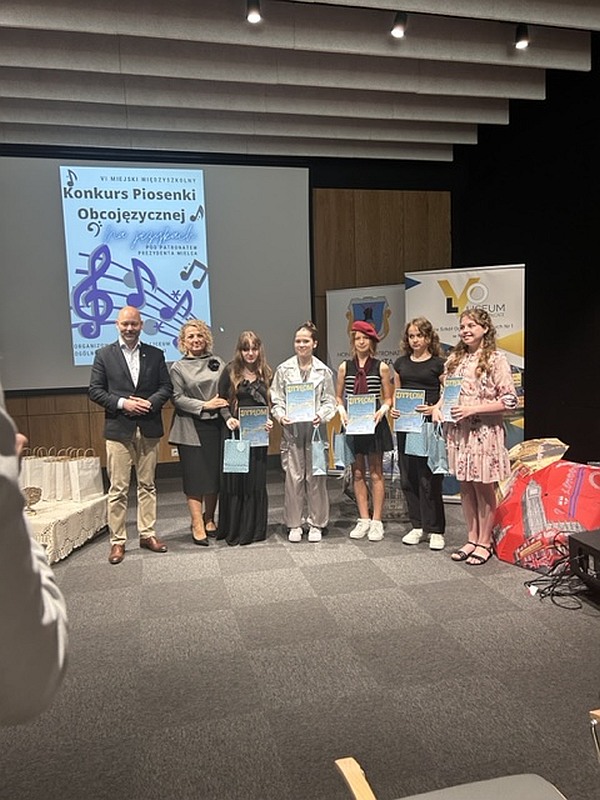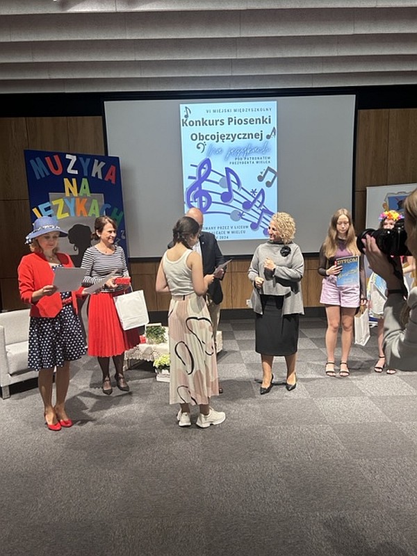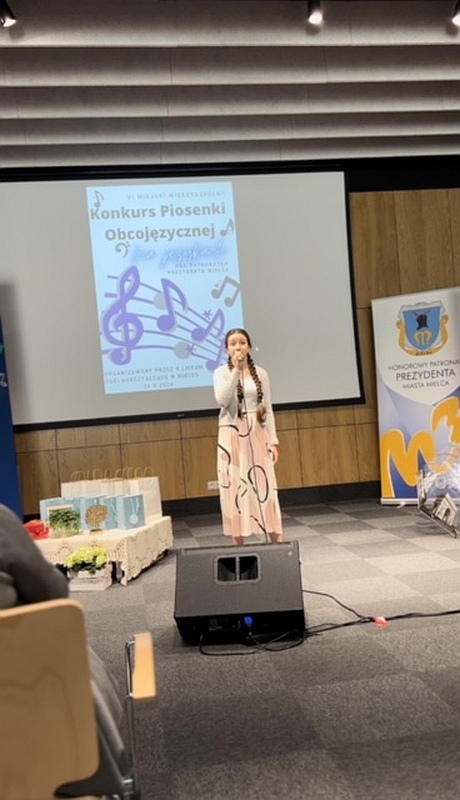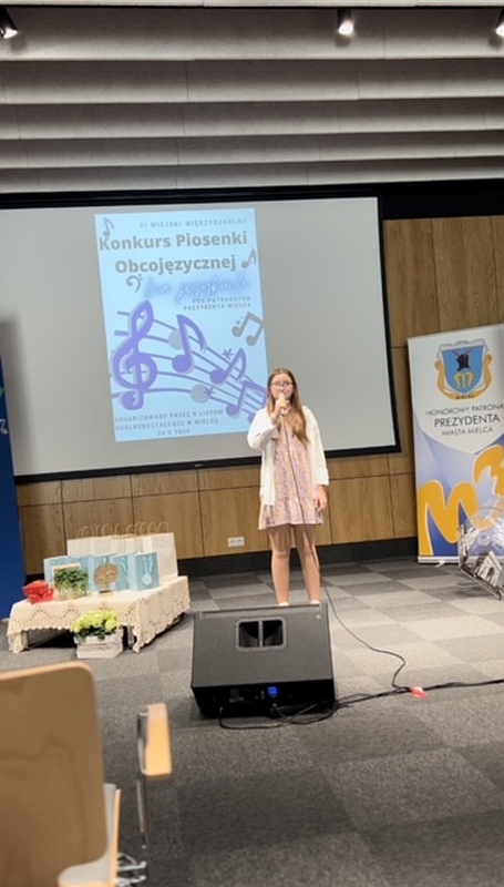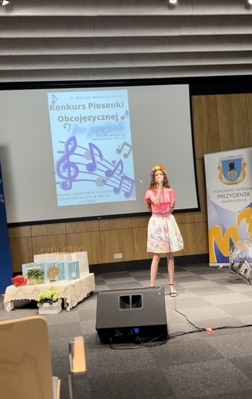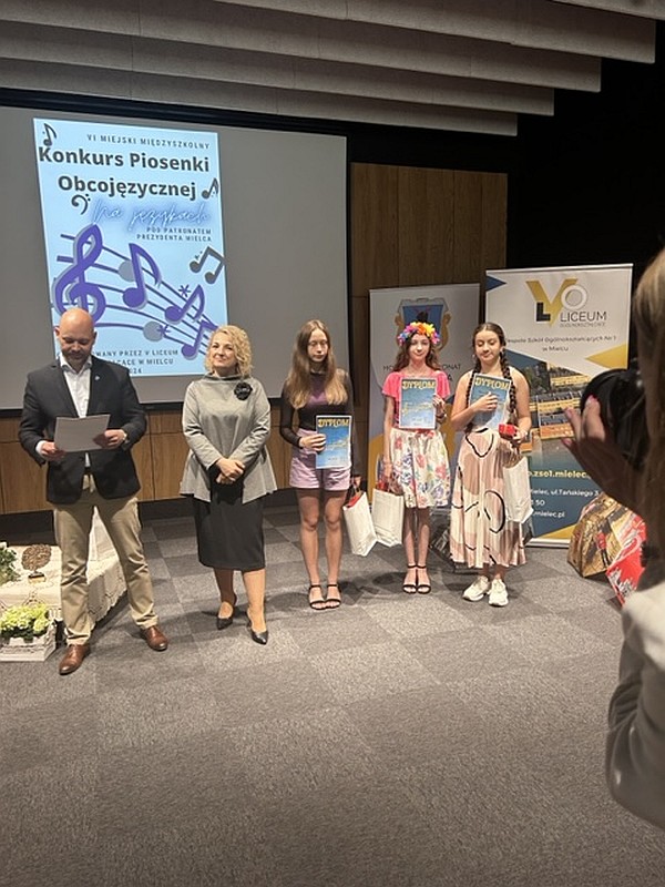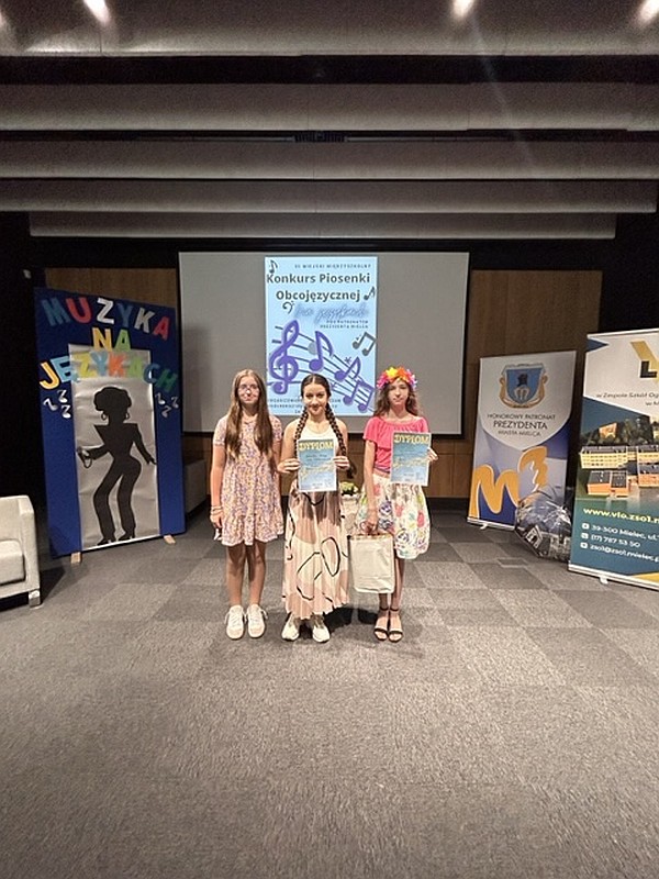 Dnia 24 maja 2024 uczennice naszej szkoły, Dominika Krupa z klasy 7C, Alicja Leżoń z klasy 7C, Nikola Korczak z klasy 6D oraz Julia Tomaszewska z klasy 6C pod opieką pani Klaudii Golby oraz pani Ewy Goli reprezentowały naszą szkołę w VI edycji Miejskiego Konkursu Piosenki Obcojęzycznej „Na językach” organizowanego przez Zespół Szkół Ogólnokształcących nr 1 w Mielcu. Po wysłuchaniu wspaniałych występów wszystkich uczestników, jury zdecydowało przyznać :