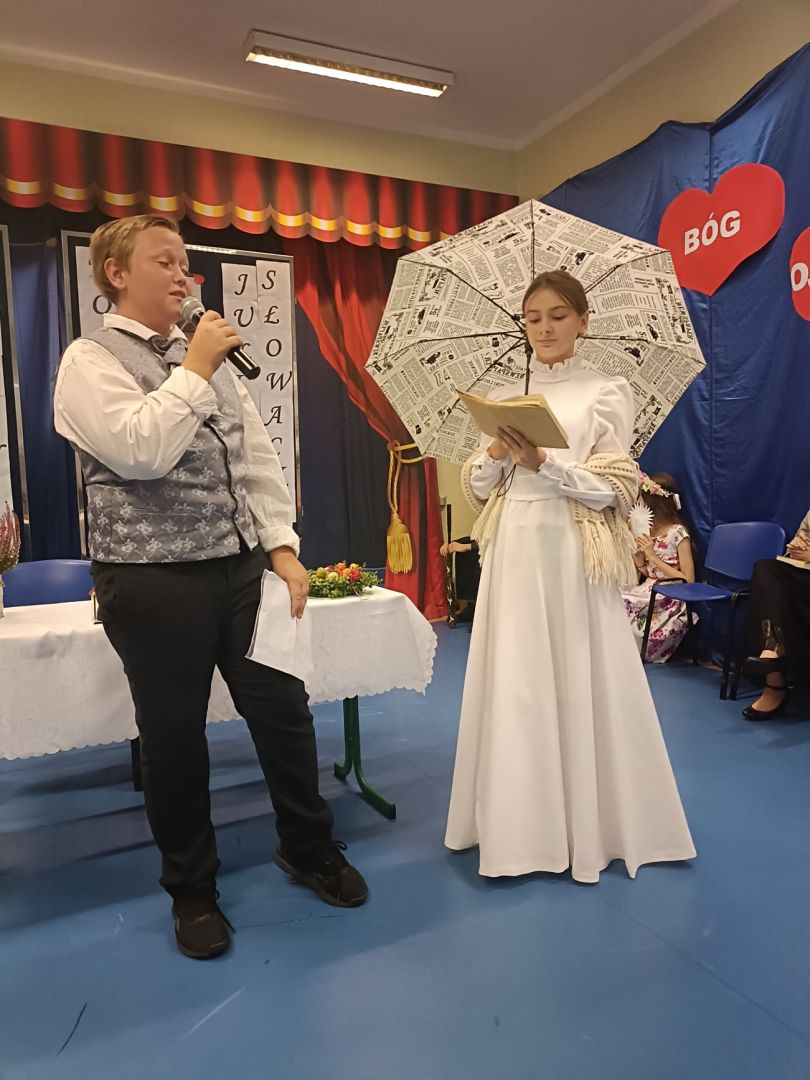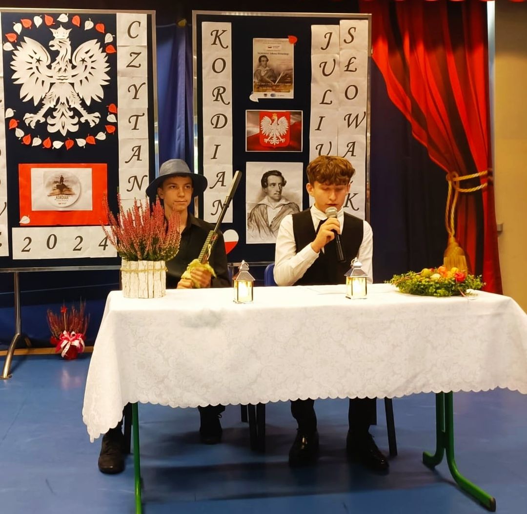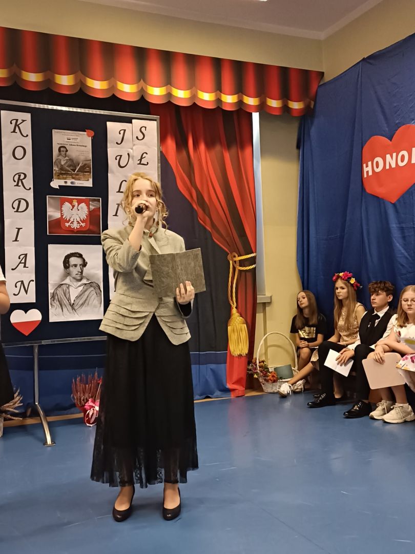 W nastrój tego spotkania wprowadziła zgromadzoną publiczność jedna z uczennic klasy 5b - Zuzia, która w roli dziennikarki przeprowadziła bardzo ciekawy wywiad z samą Salomeą Słowacką ( w tę rolę świetnie wcieliła się Natalia z kl. 7a). Dopełnieniem przeżywania przygód głównego bohatera była inscenizacja wydarzeń z lektury „Kordian” przygotowana przez uczniów klasy 7d . Akcentem nawiązującym do utworu Słowackiego stały się piosenki – „Polskie Kwiaty” oraz „ Tu wszędzie jest moja Ojczyzna” znakomicie zaśpiewane przez Nikolę i Paulinę z kl. 7 d. Widzów zachwycił walc w wykonaniu uczennic Lilki i Nikoli –utalentowanych tancerek z naszej szkoły. Zaprezentowane utwory, kostiumy oraz dekoracje przeniosły publiczność do atmosfery czasu opisanego w utworze Słowackiego. Dla podkreślenia patriotycznego przesłania utworu i jego uniwersalnych wartości uczniowie klasy 7b wyrecytowali „Testament mój ”, klasa 7d przypomniała wszystkim o wpisaniu się w pamięć wiersza ” W pamiętniku Zofii Bobrówny”