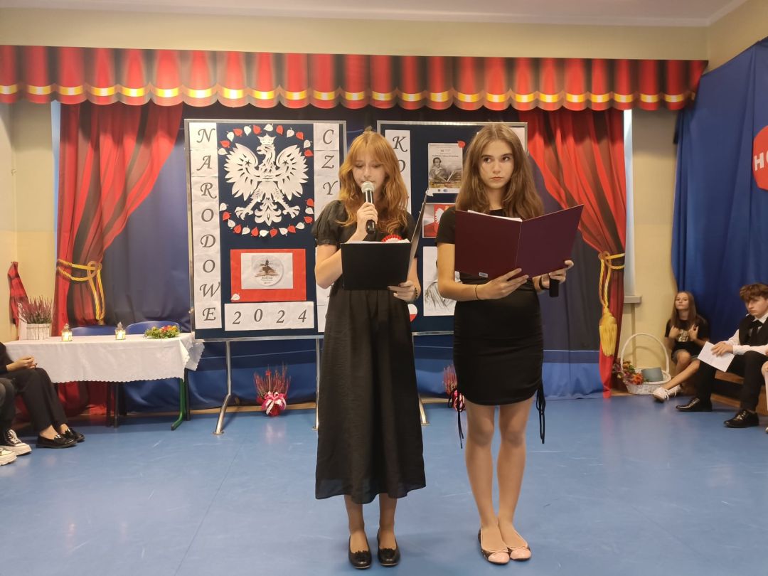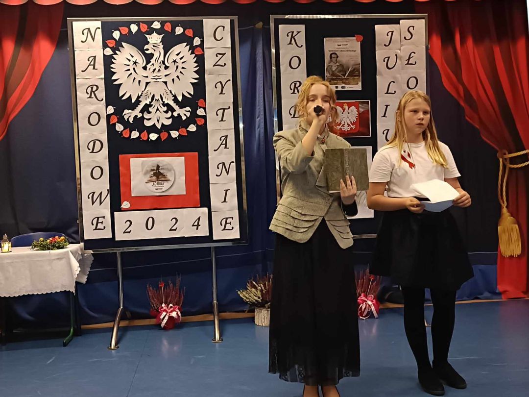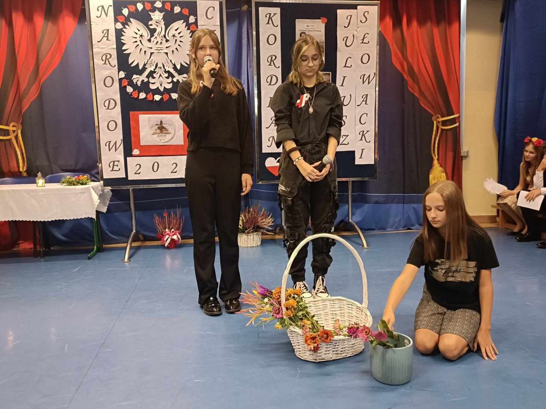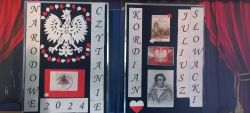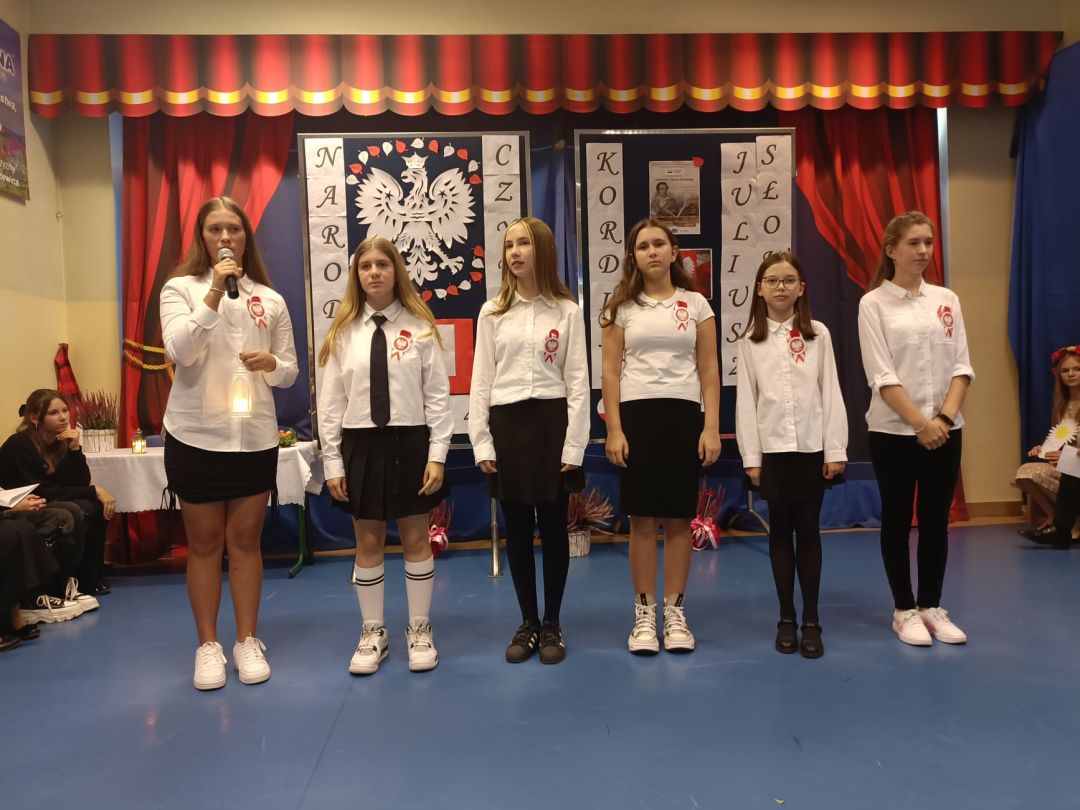 W nastrój tego spotkania wprowadziła zgromadzoną publiczność jedna z uczennic klasy 5b - Zuzia, która w roli dziennikarki przeprowadziła bardzo ciekawy wywiad z samą Salomeą Słowacką ( w tę rolę świetnie wcieliła się Natalia z kl. 7a). Dopełnieniem przeżywania przygód głównego bohatera była inscenizacja wydarzeń z lektury „Kordian” przygotowana przez uczniów klasy 7d . Akcentem nawiązującym do utworu Słowackiego stały się piosenki – „Polskie Kwiaty” oraz „ Tu wszędzie jest moja Ojczyzna” znakomicie zaśpiewane przez Nikolę i Paulinę z kl. 7 d. Widzów zachwycił walc w wykonaniu uczennic Lilki i Nikoli –utalentowanych tancerek z naszej szkoły. Zaprezentowane utwory, kostiumy oraz dekoracje przeniosły publiczność do atmosfery czasu opisanego w utworze Słowackiego. Dla podkreślenia patriotycznego przesłania utworu i jego uniwersalnych wartości uczniowie klasy 7b wyrecytowali „Testament mój ”, klasa 7d przypomniała wszystkim o wpisaniu się w pamięć wiersza ” W pamiętniku Zofii Bobrówny”