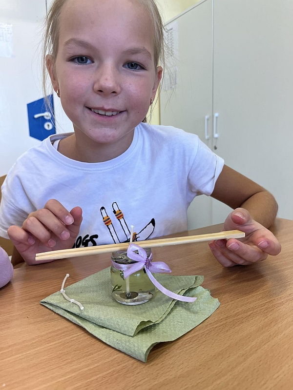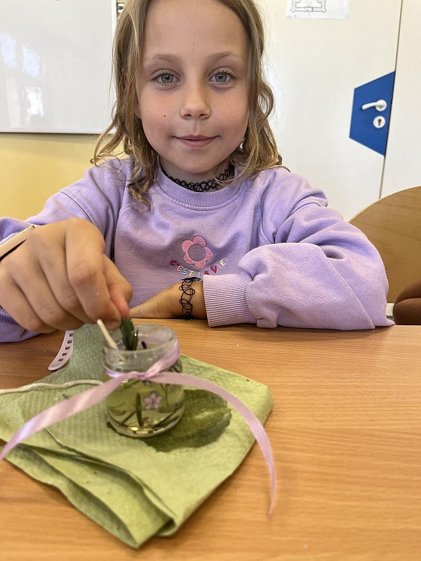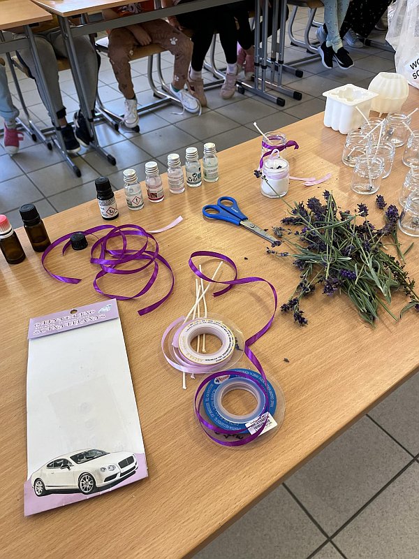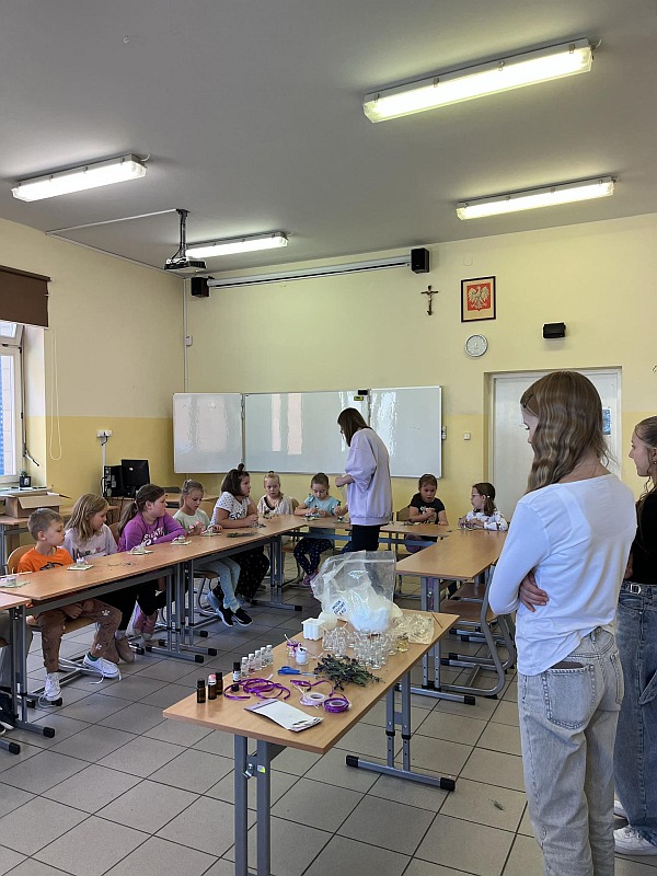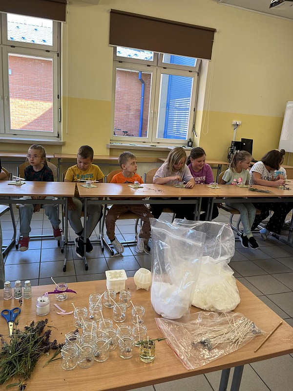 3)Zajęcia z rękodzieła – uczniowie klas 2 i 3 tworzyli świeczki zapachowe z suszonej lawendy pod czujnym okiem starszych koleżanek klasy. Powstały piękne i pachnące dzieła sztuki w postaci świeczek, które można wykorzystać jako upominek.