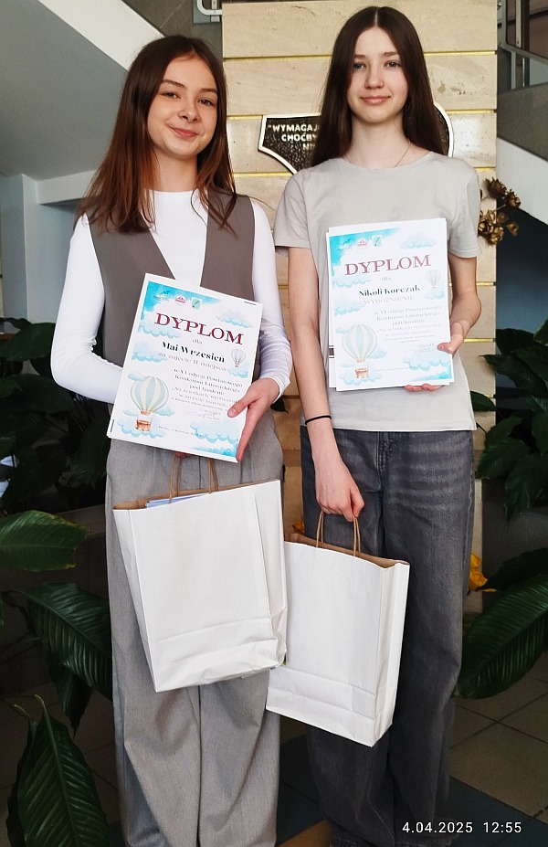 4 kwietnia 2025 r. w auli Zespołu Szkół im. prof. Janusza Groszkowskiego w Mielcu, odbyła się IV Biesiada Humanistyczna, na której ogłoszono wyniki VI Powiatowego Konkursu Literackiego „Na ścieżkach wyobraźni, w świecie marzeń”. Konkurs adresowany był do uczniów szkół podstawowych (klas VII i VIII) i szkół ponadpodstawowych. W kategorii wiersz II miejsce zajęła uczennica naszej szkoły z kl. 7 d Maja Wrzesień (opiekun p. Monika Kuroń ), a Nikola Korczak z tej samej klasy zdobyła wyróżnienie w kategorii opowiadanie. W konkursie tym udział wzięły również Izabela Klich z kl. 7d (opiekun M. Kuroń) oraz Natalia Kafara z kl. 7 a i Julia Rzeszutek z kl. 8 b (opiekun p. Magdalena Rumak – Markowska).