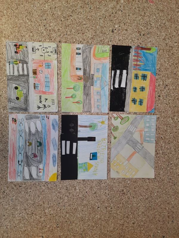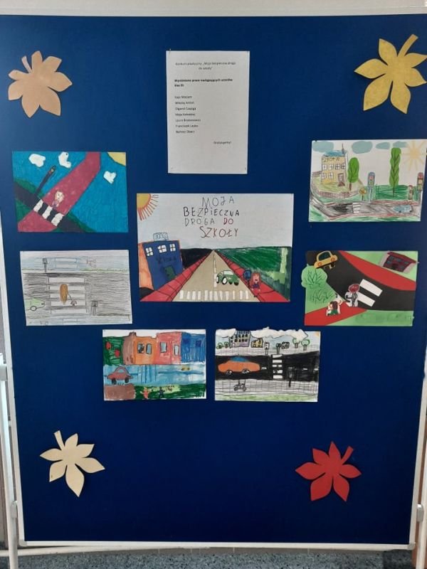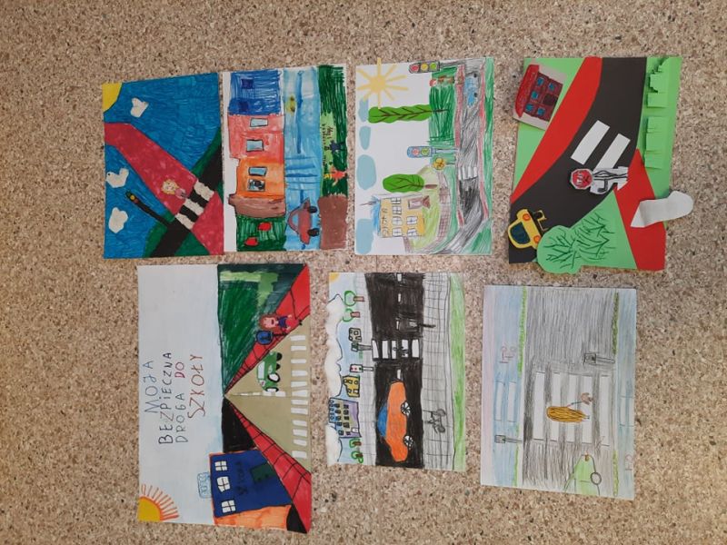 5. Konkurs plastyczny „ Moja bezpieczna droga do szkoły” dla klas III. Wśród dzieci konkurs cieszył się dużym zainteresowaniem.