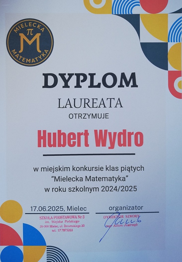 Z ogromną radością informujemy, że uczeń naszej szkoły Hubert Wydro z klasy 4b został laureatem Miejskiego Konkursu Matematycznego dla klas V "Mielecka Matematyka"🏆 Hubert uzyskał najwyższy wynik spośród wszystkich uczestników konkursu, wykazując się doskonałą wiedzą, logicznym myśleniem i ogromnym zaangażowaniem.👏 Serdecznie gratulujemy tego wspaniałego osiągnięcia i życzymy dalszych sukcesów na matematycznej ścieżce rozwoju!