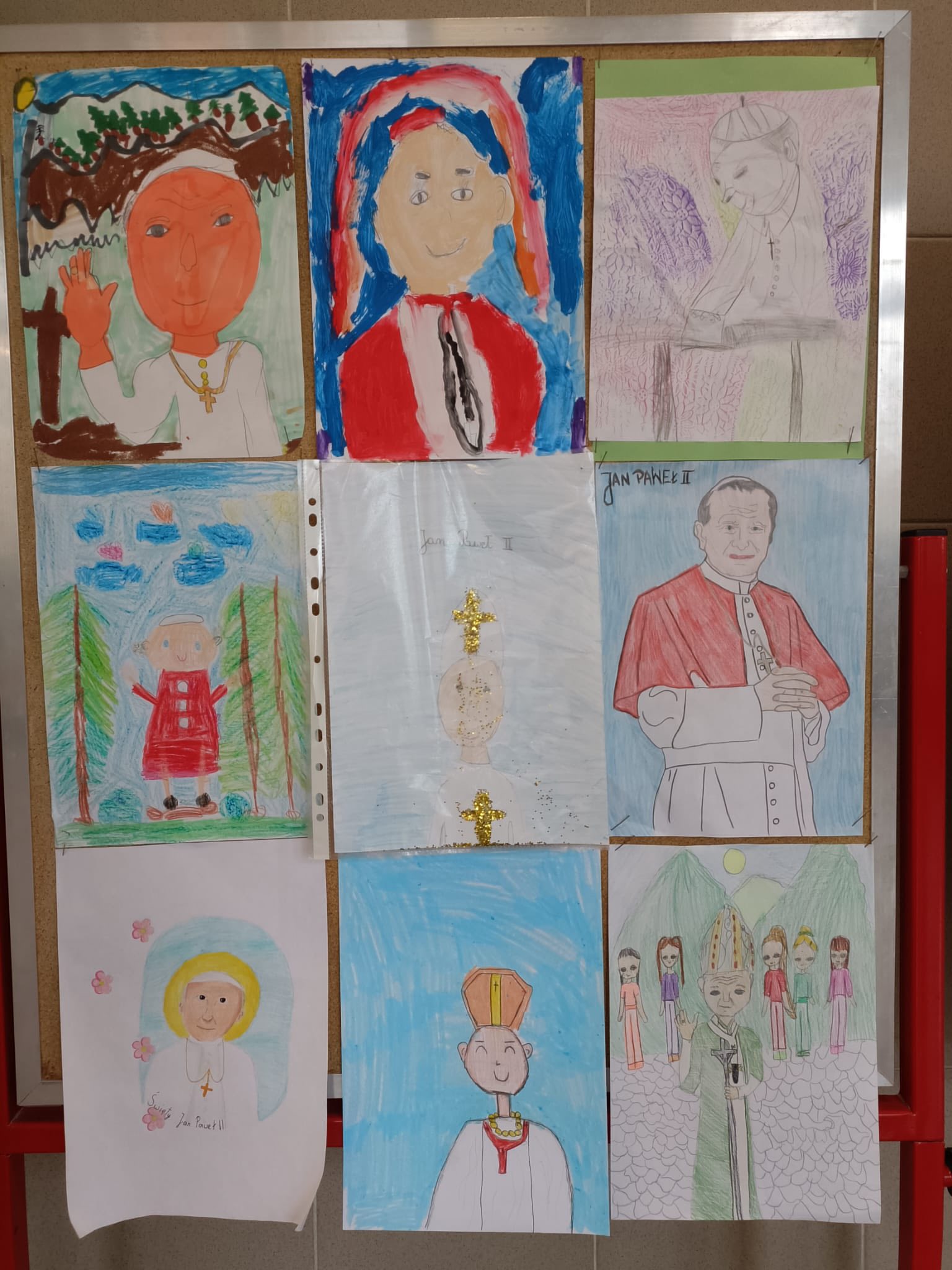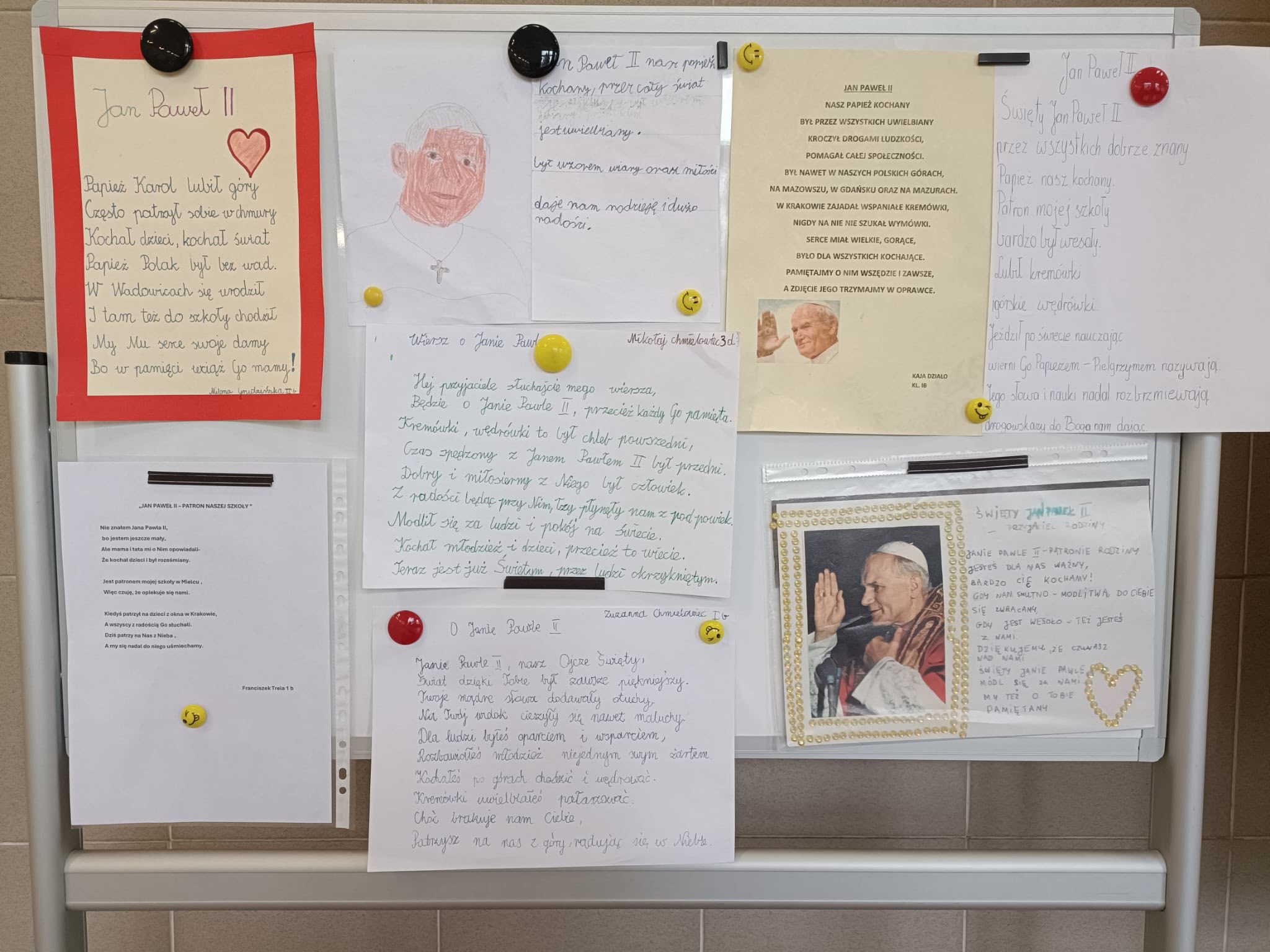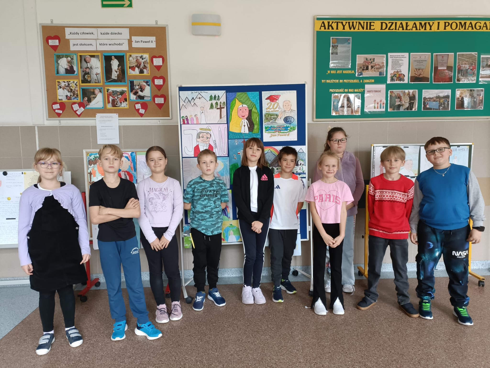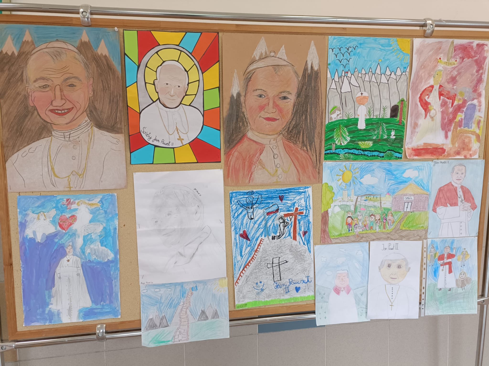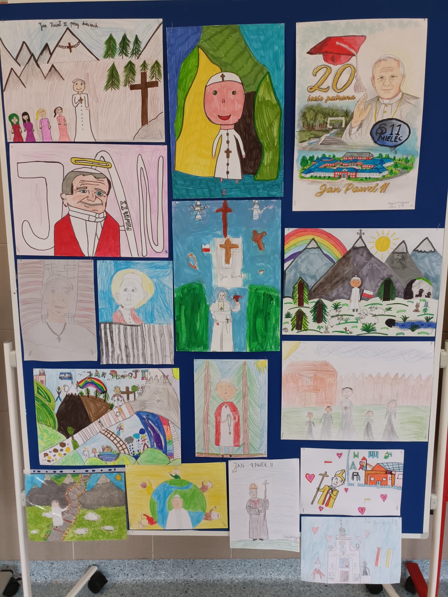Świętując 20-lecie nadania naszej szkole imienia św. Jana Pawła II, uczniowie klas 1–3 licznie wzięli udział w konkursach poświęconych naszemu patronowi.