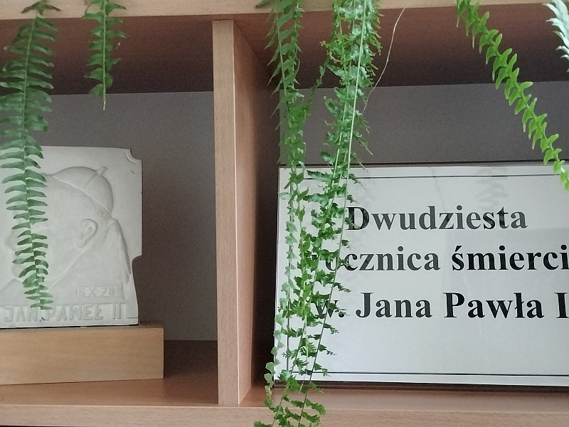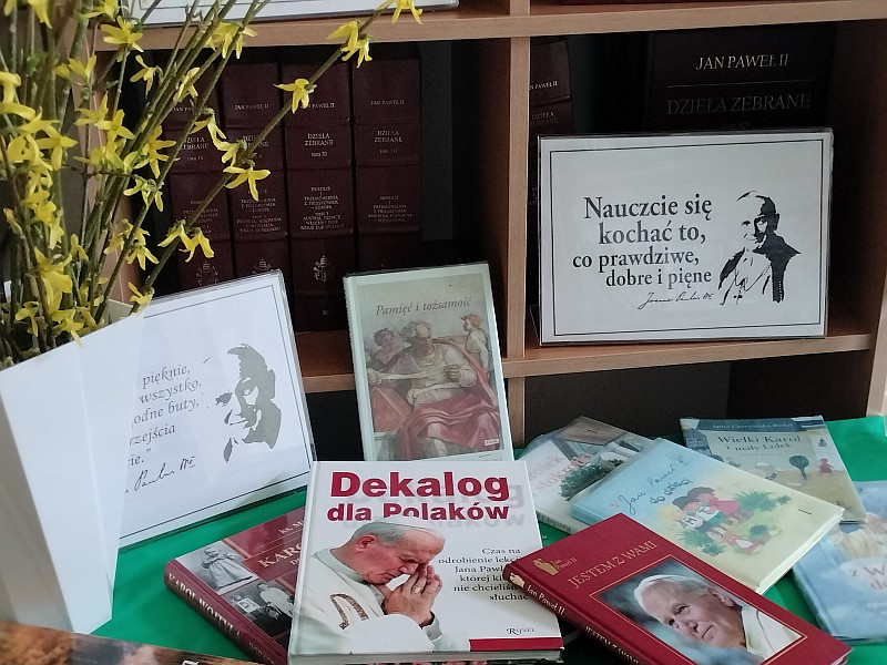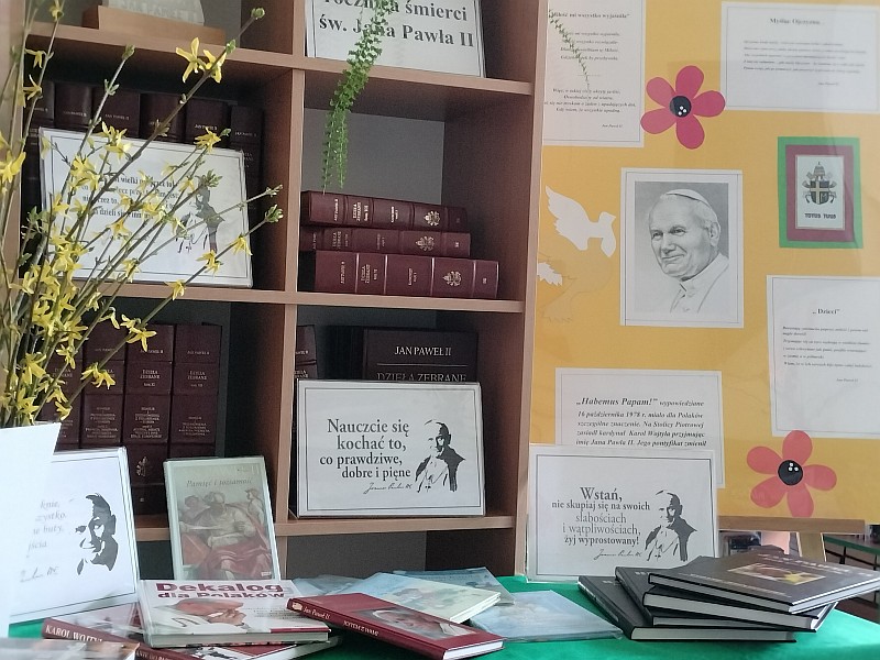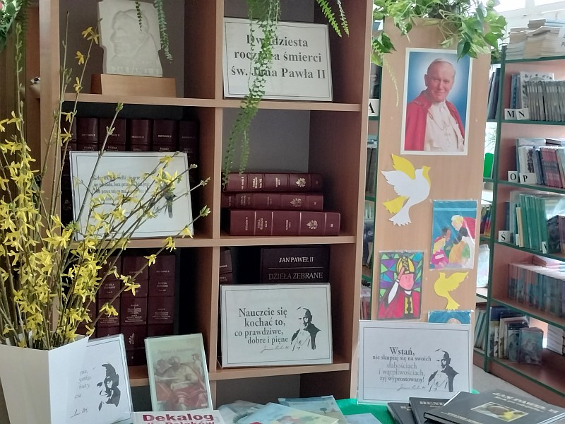 Z okazji 20 rocznicy śmierci św. Jana Pawła II, patrona naszej szkoły, zapraszamy do odwiedzenia biblioteki szkolnej, gdzie przygotowałyśmy wyjątkową wystawę książek poświęconych Papieżowi Polakowi. Celem wystawy jest przybliżenie uczniom i społeczności szkolnej życia oraz duchowego dziedzictwa św. Jana Pawła II.