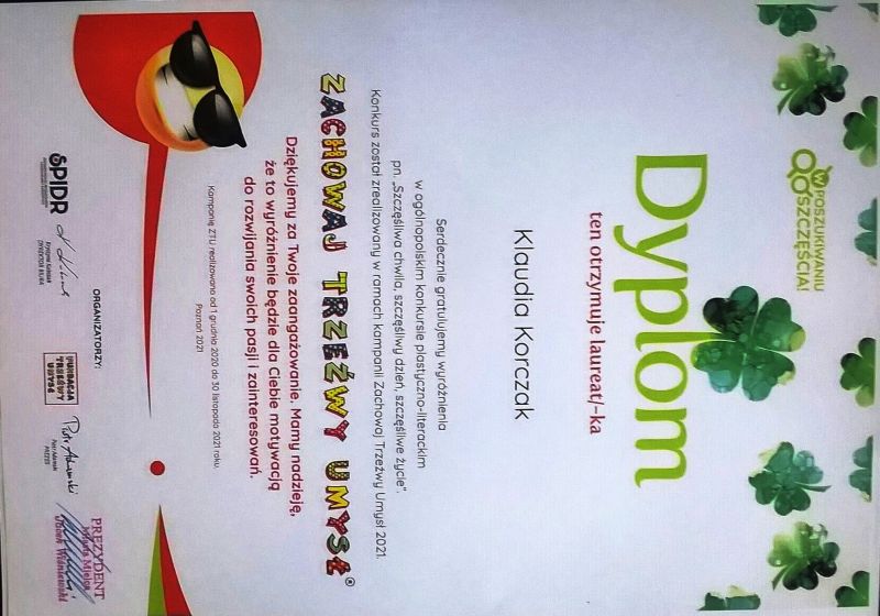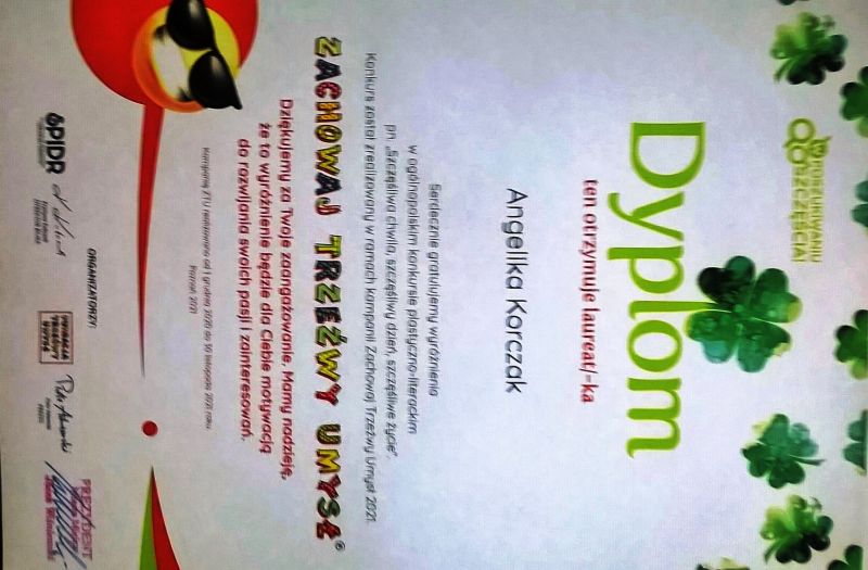 W naszej szkole odbyło się uroczyste podsumowanie ogólnopolskiego konkursu plastycznego, zorganizowanego w ramach Ogólnopolskiej Kampanii Zachowaj Trzeźwy Umysł przygotowanej przez Stowarzyszenie Producentów i Dziennikarzy Radiowych z Poznania. Kampania została zrealizowana z myślą o wsparciu dzieci i młodzieży oraz ich rodziców w trudnych czasach izolacji społecznej. Klaudia Korczak i Angelika Korczak uczennice z kl. 6 d otrzymały wyróżnienie i nagrodę z rąk Pani Adriany Miłoś (Zastępca Prezydenta Miasta) i Pani Agaty Ćwięka (Naczelnik Wydziału Spraw Społecznych i Zdrowia). Przekazane nagrody zostały ufundowane przez realizatorów kampanii, a specjalne upominki dla laureatów konkursu ufundował Prezydent Miasta Mielca.