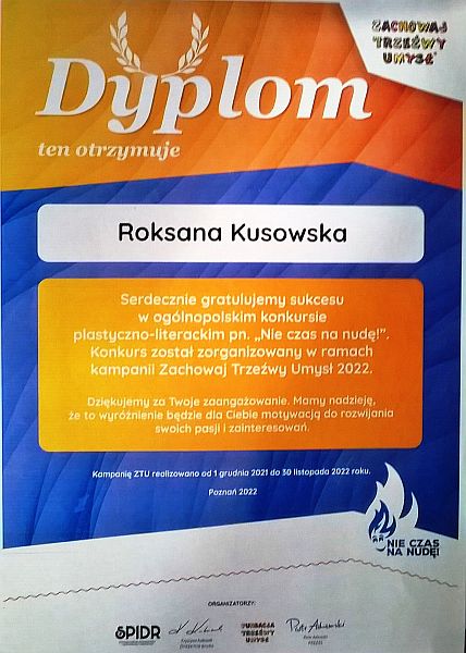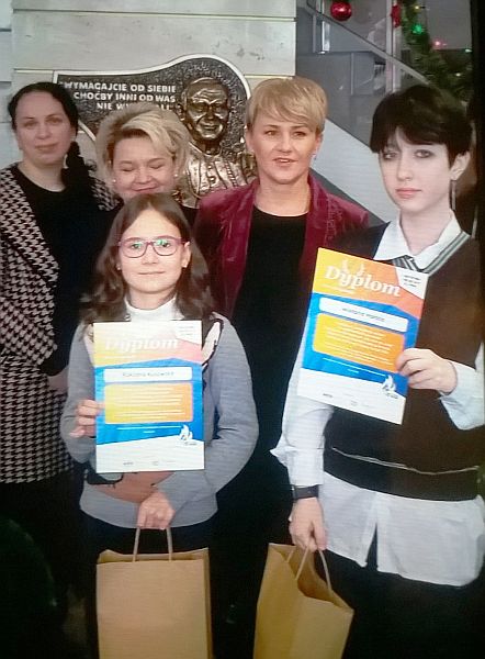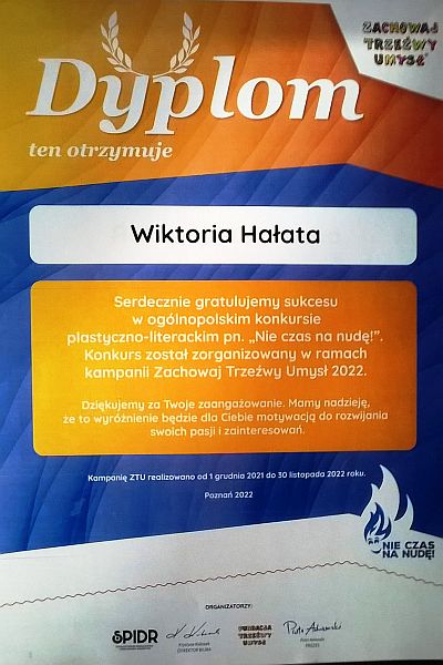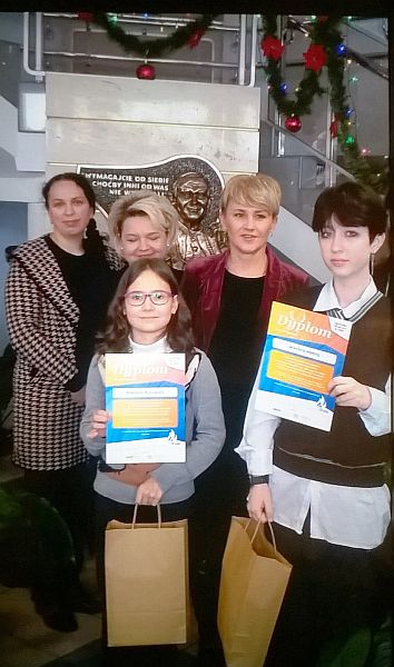 W naszej szkole odbyło się uroczyste podsumowanie ogólnopolskiego konkursu plastycznego, organizowanego w ramach Ogólnopolskiej Kampanii Zachowaj Trzeźwy Umysł 2022, przygotowanej przez Stowarzyszenie Producentów i Dziennikarzy Radiowych z Poznania. Wiktoria Hałata i Roksana Kusowska uczennice z kl. 7a i kl. 5b otrzymały dyplomy i nagrody, które wręczyła pani Wiceprezydent Adriana Miłoś wraz z Naczelnikiem Wydziału Spraw Społecznych i Zdrowia panią Agatą Ćwięką.