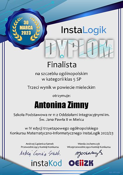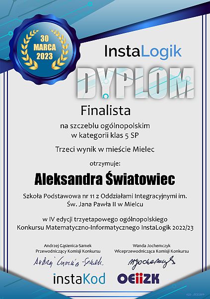 InstaLogik to konkurs matematyczno-informatyczny dla uczniów klas 4-8 SP. Konkurs realizowany jest w całości on-line. Konkurs organizowany jest przez Placówkę Edukacji Informatyczno-Matematycznej InstaKod oraz Ośrodek Edukacji Informatycznej i Zastosowań Komputerów w Warszawie, publiczną placówkę doskonalenia nauczycieli. Konkurs adresowany był do wszystkich uczniów zainteresowanych zagadkami logicznymi, matematyką, oraz do tych, którzy interesują się programowaniem lub chcieliby postawić w programowaniu pierwsze samodzielne kroki. Celem konkursu było zachęcenie uczniów do zmierzenia się z zadaniami logicznymi oraz prostymi zadaniami programistycznymi, które wprowadzają uczniów w świat programowania. W ogólności jego celem jest rozwijanie zainteresowań matematycznych i programistycznych młodzieży oraz propagowanie myślenia komputacyjnego. Antonina i Aleksandra otrzymały tytuły Finalistek konkursu. Aleksandra zajęła III miejsce wśród wszystkich uczestników z miasta Mielca, a Antonina III miejsce wśród wszystkich uczestników z powiatu mieleckiego.