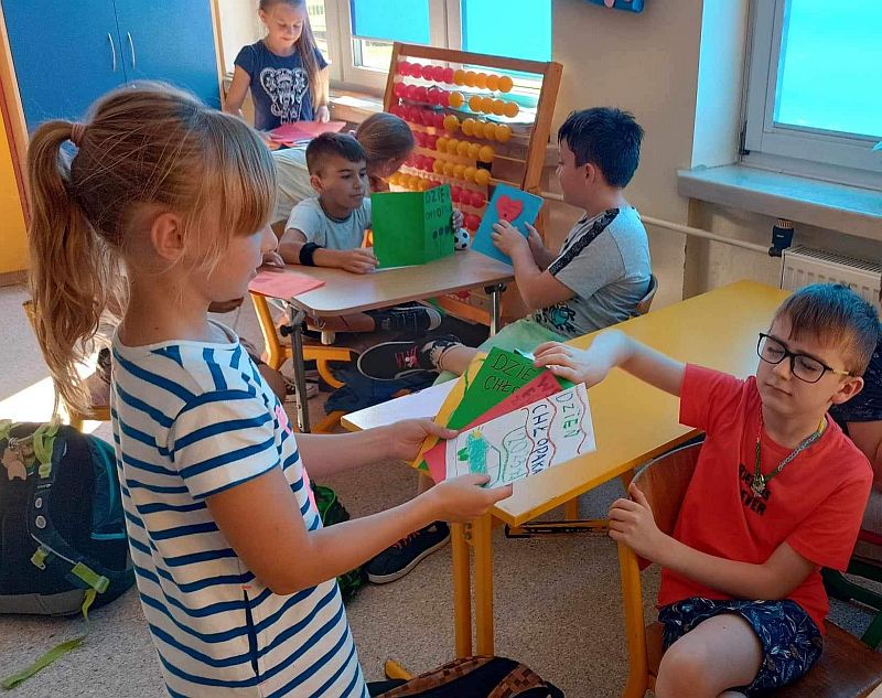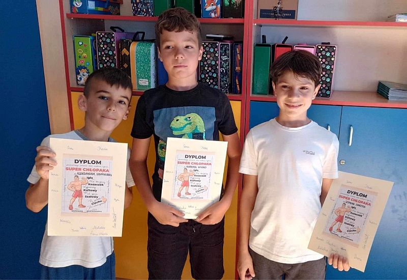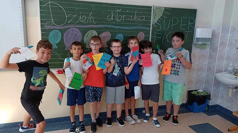 29.09.23r. dziewczynki z klasy 3b i 3e, czyli 6 grupy świetlicowej pod opieką pani Ewy Czeczot, przygotowały niespodziankę dla swoich kolegów z okazji ich święta. Po odczytaniu okazjonalnych wierszy oraz złożeniu życzeń, chłopcy losowali laurki samodzielnie wykonane przez dziewczynki jak również otrzymali słodkie upominki. Potem brali udział w rywalizacji sportowej o tytuł ,,Super chłopaka. Wszyscy świetnie się bawili.